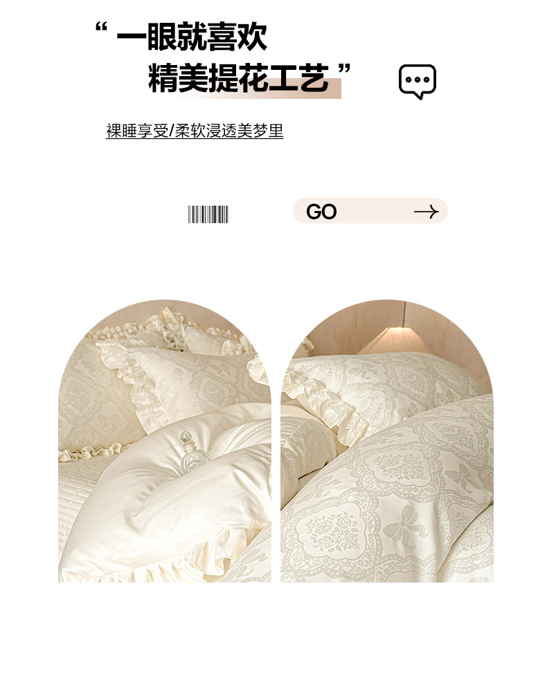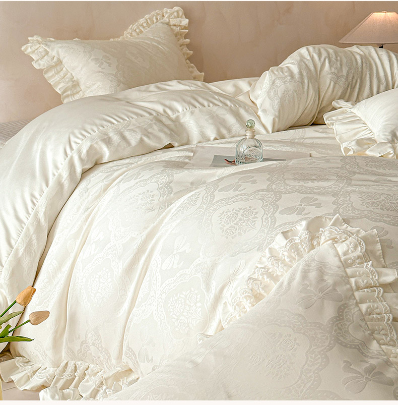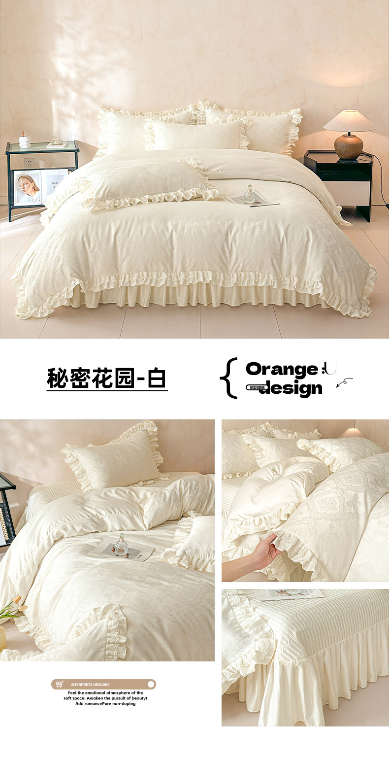 当前位置: 91家纺网 > 商品网购 > 床品套件 > 四件套 > 其它四件套 > 金阳光家纺 2026春夏新款A类花边蕾丝款水洗真丝天丝床盖款床单款提花四件套 秘密花园-白