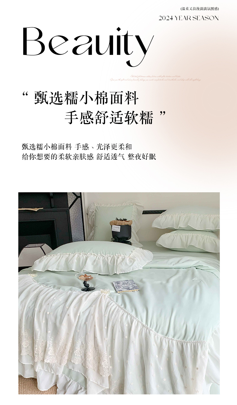 (总)吾欢心 2025新款小香风可可小姐系列花边四件套,可可奶茶绿,可可奶昔粉,可可柠檬黄,可可温柔紫,可可樱桃粉
