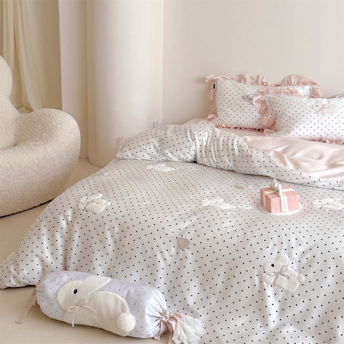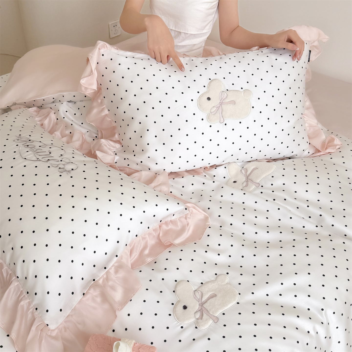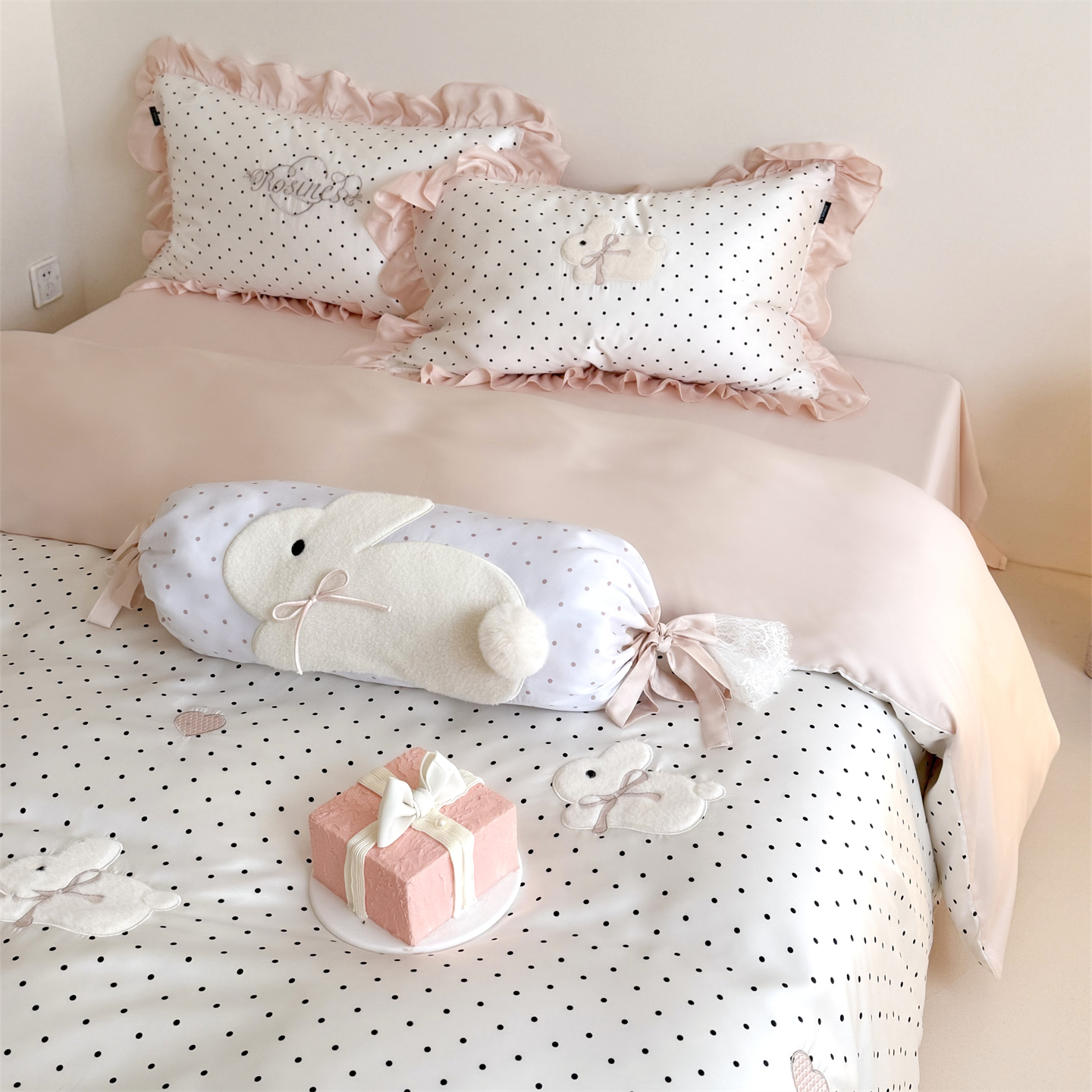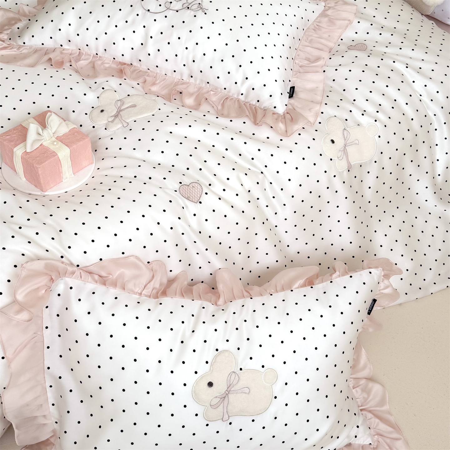 当前位置: 91家纺网 > 商品网购 > 床品套件 > 四件套 > 莱赛尔四件套 > 鹿班家居 2026新款60S兰精天丝贴布绣四件套-奶油甜兔【标准会员-20元】 奶油甜兔-黑波点