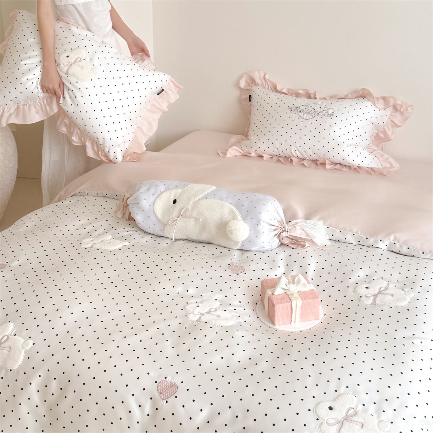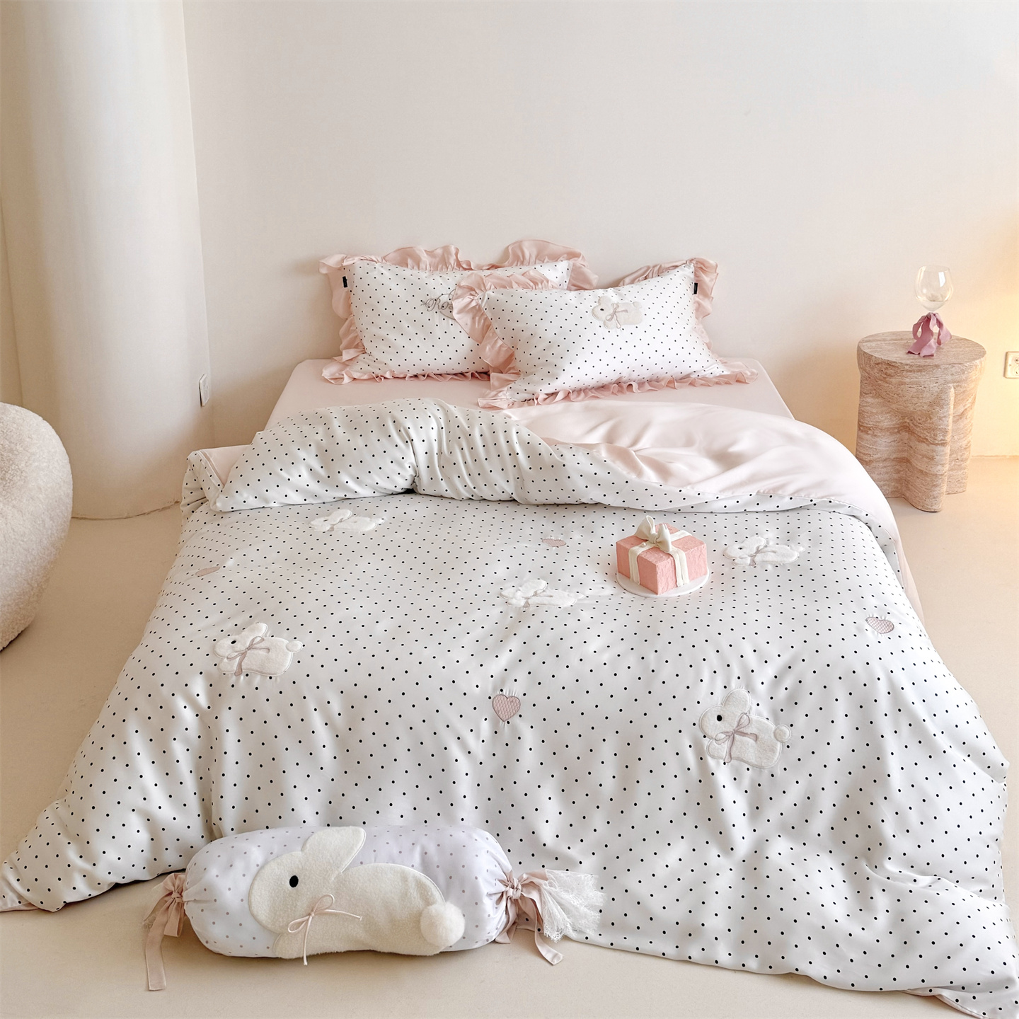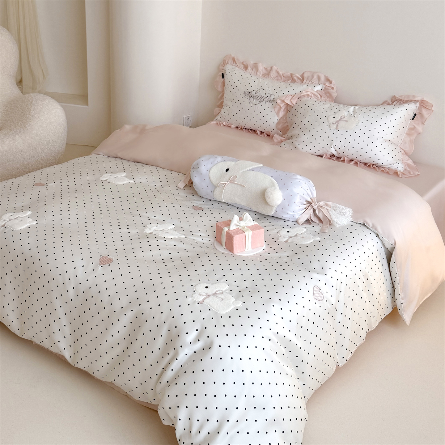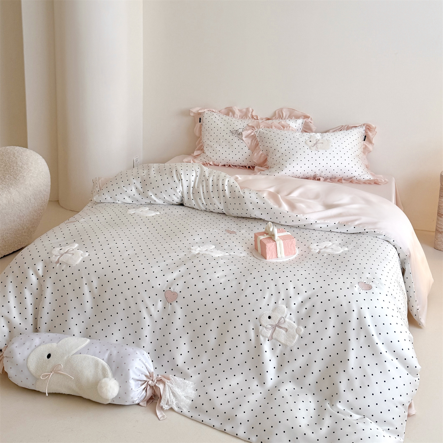 当前位置: 91家纺网 > 商品网购 > 床品套件 > 四件套 > 莱赛尔四件套 > 鹿班家居 2026新款60S兰精天丝贴布绣四件套-奶油甜兔【标准会员-20元】 奶油甜兔-黑波点