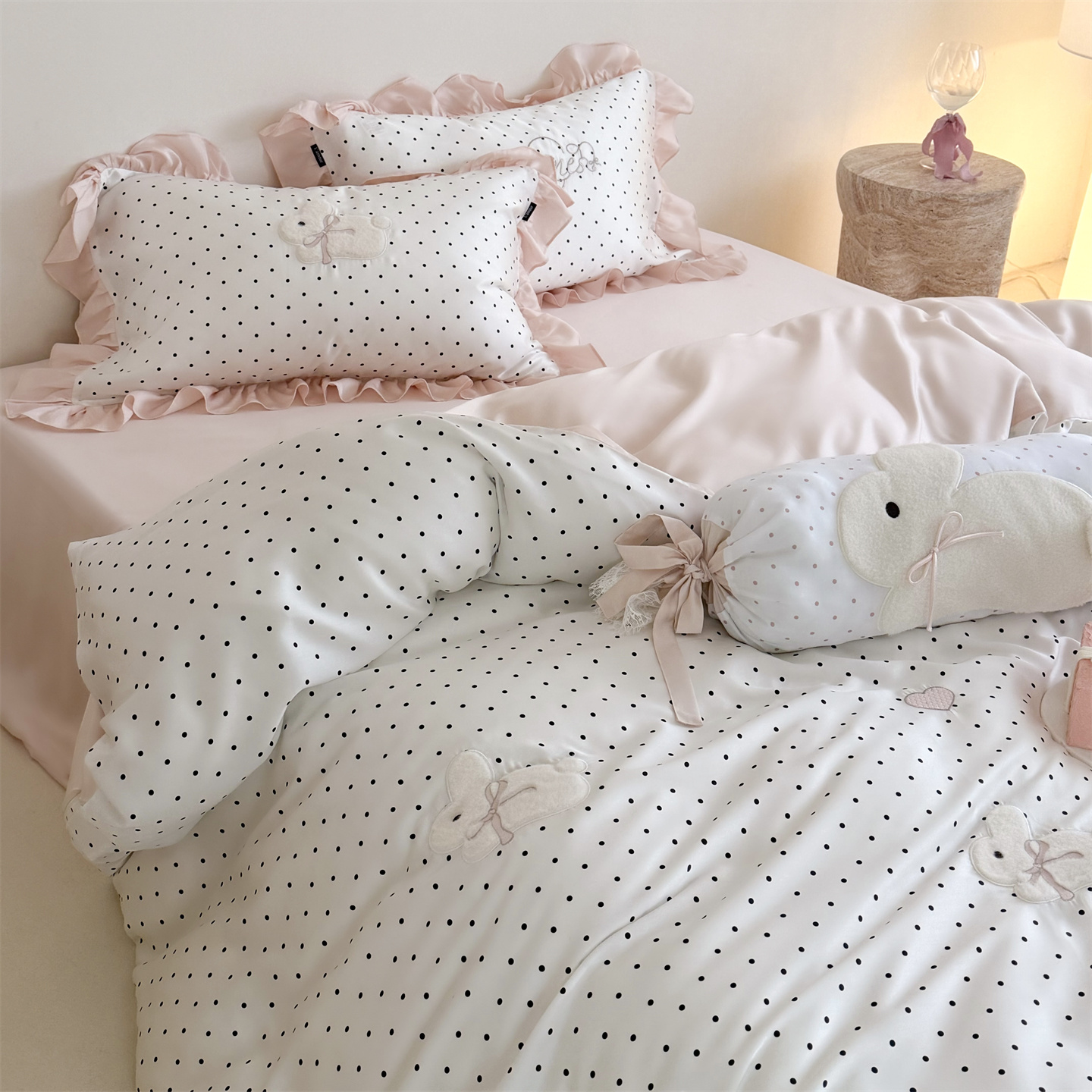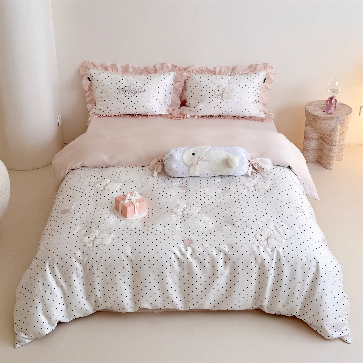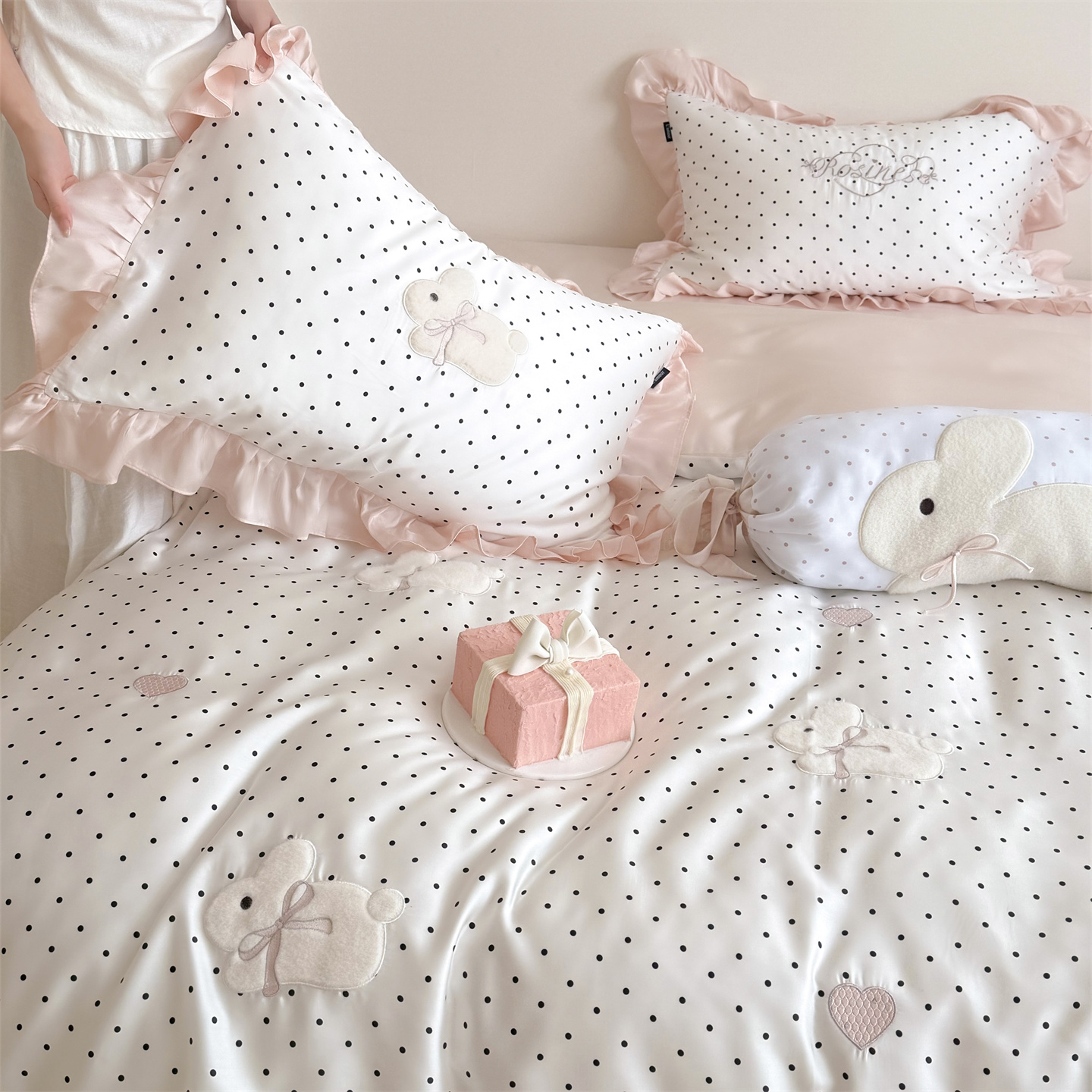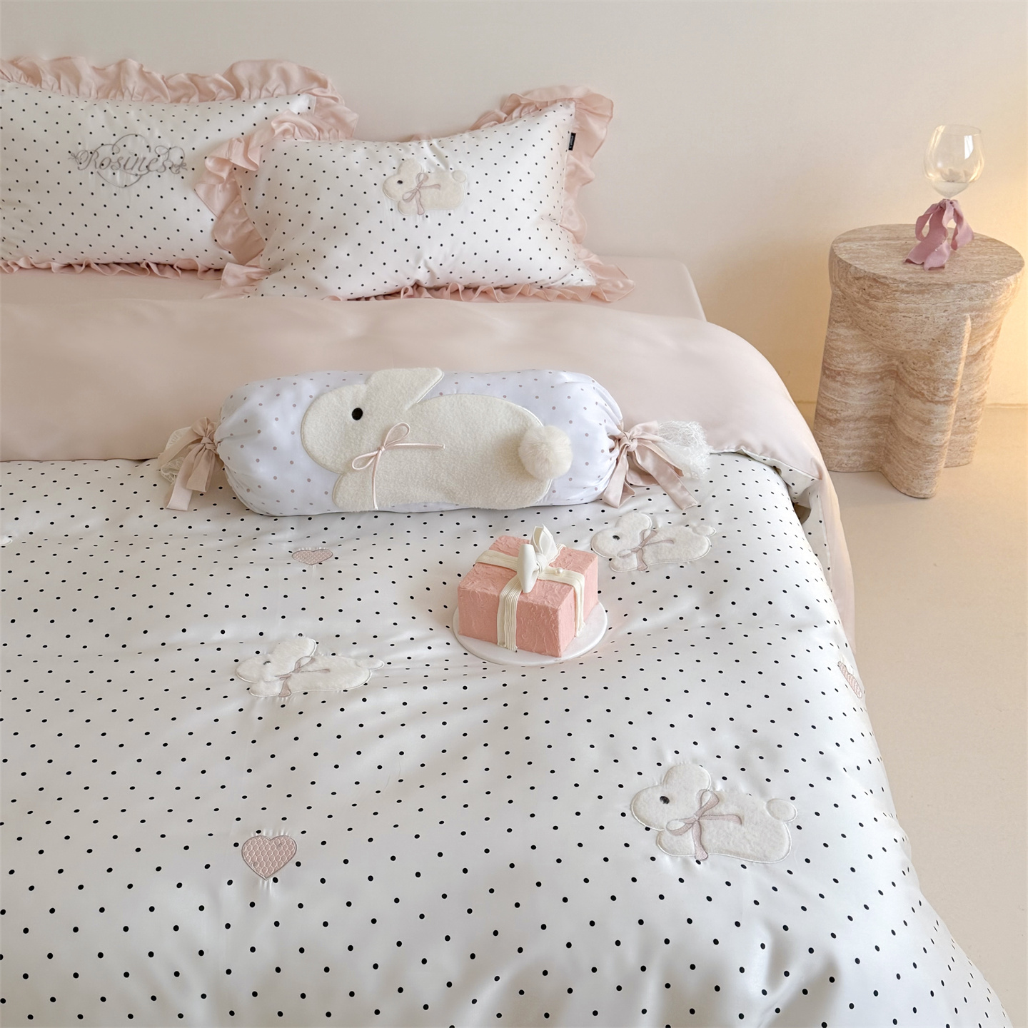 当前位置: 91家纺网 > 商品网购 > 床品套件 > 四件套 > 莱赛尔四件套 > 鹿班家居 2026新款60S兰精天丝贴布绣四件套-奶油甜兔【标准会员-20元】 奶油甜兔-黑波点