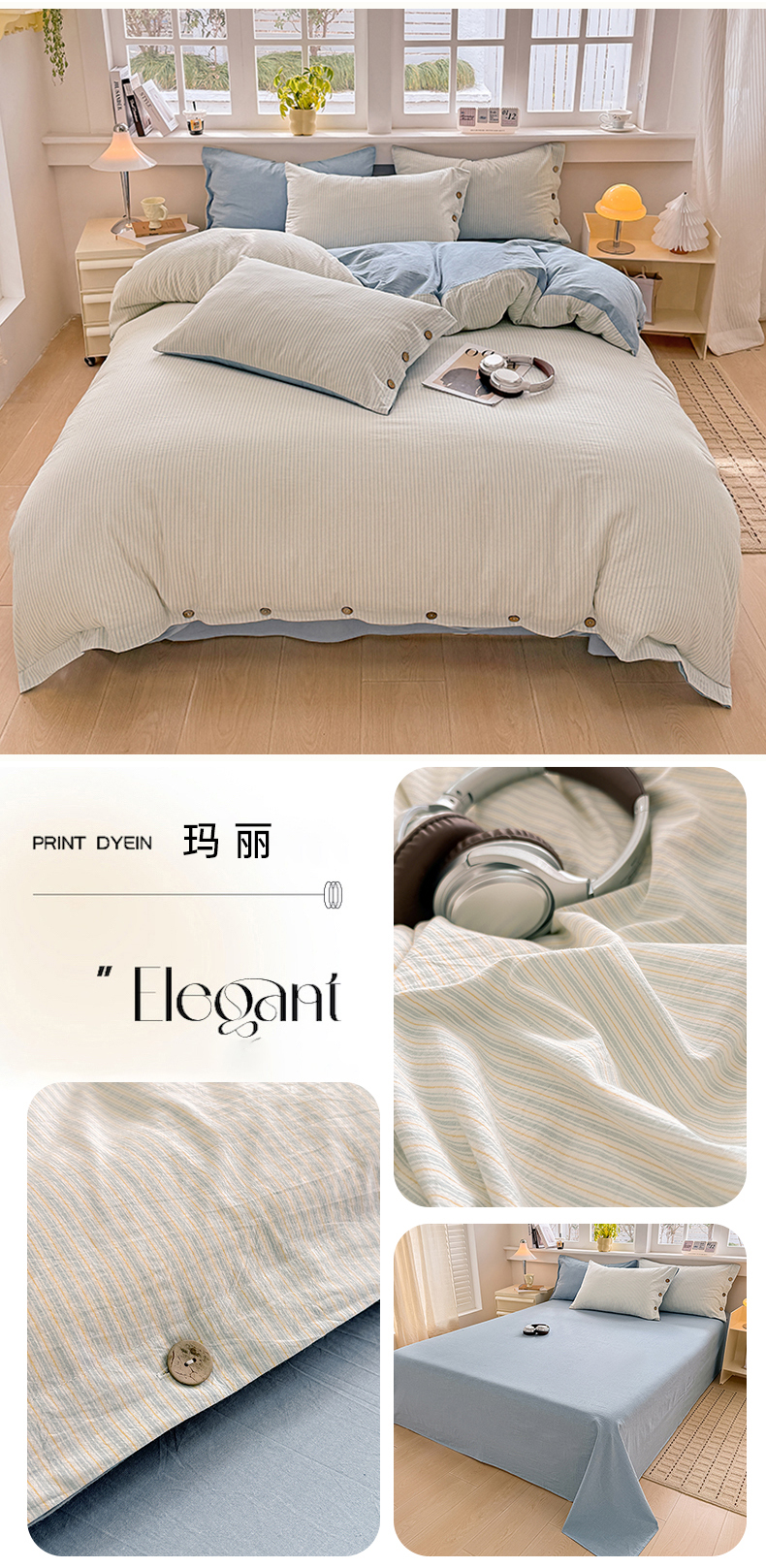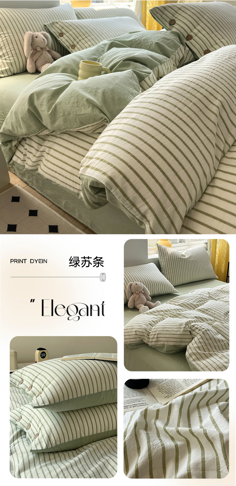 (总)梦依依 2025新款全棉色织水洗棉纽扣款四件套学生三件套全棉纯棉三件套,粉苏条,黑苏条,蓝苏条,绿苏条,米细条,黑细条,灰细条