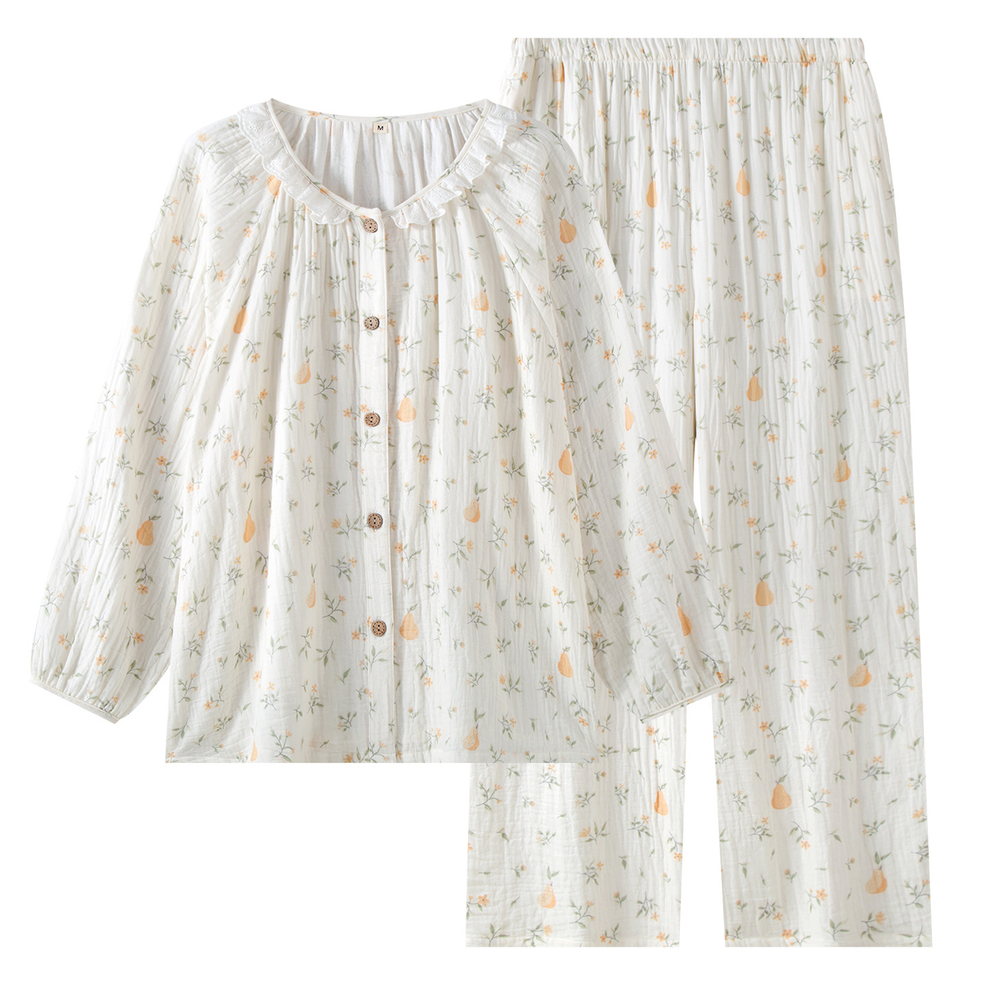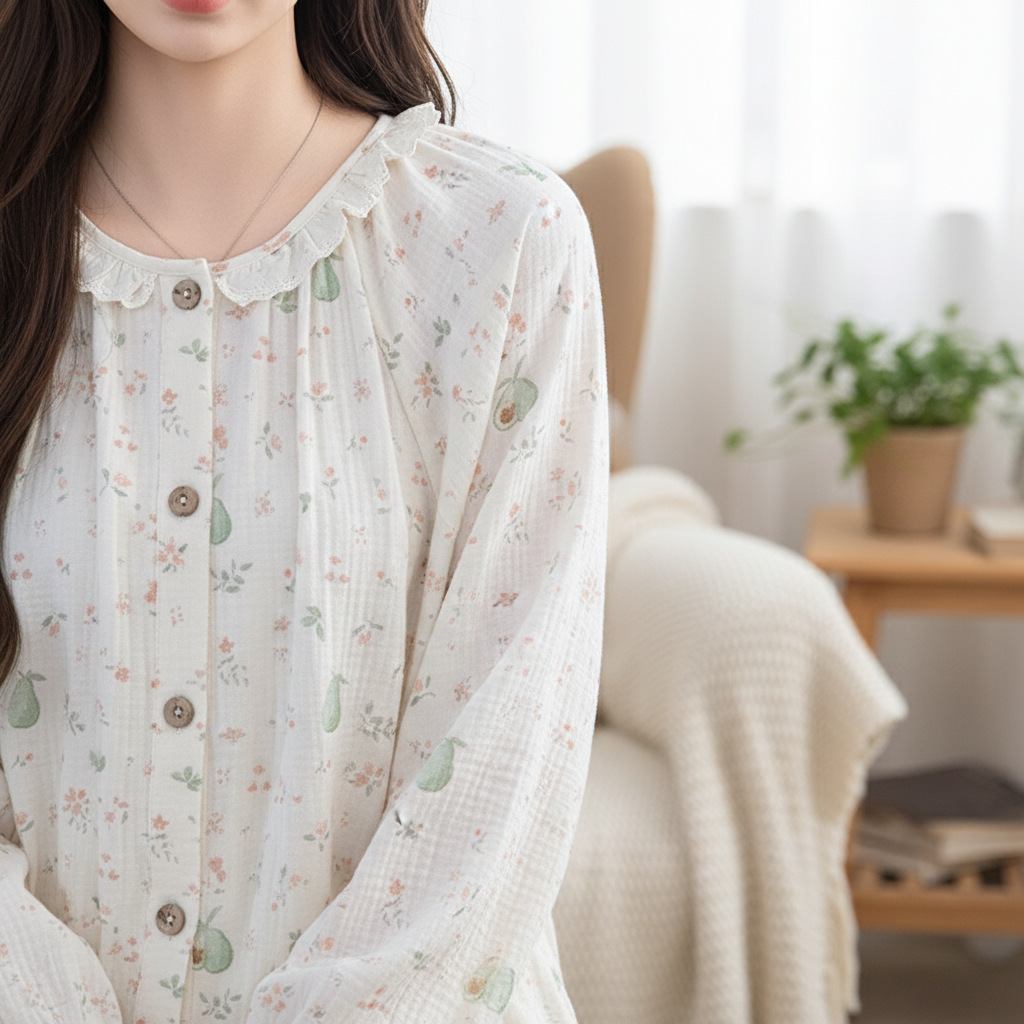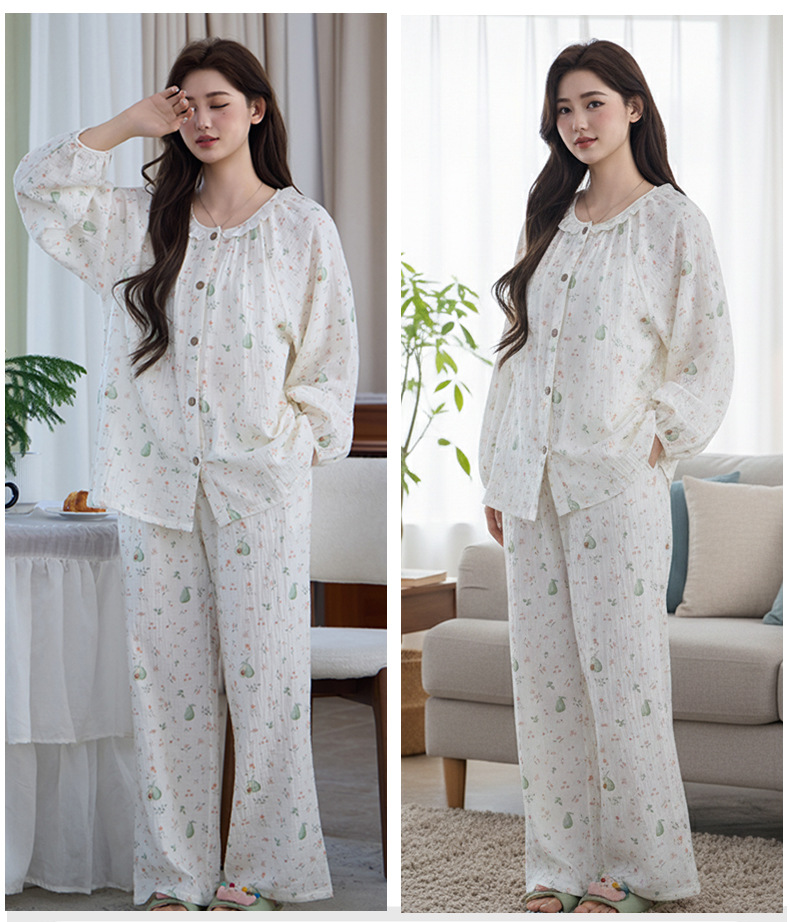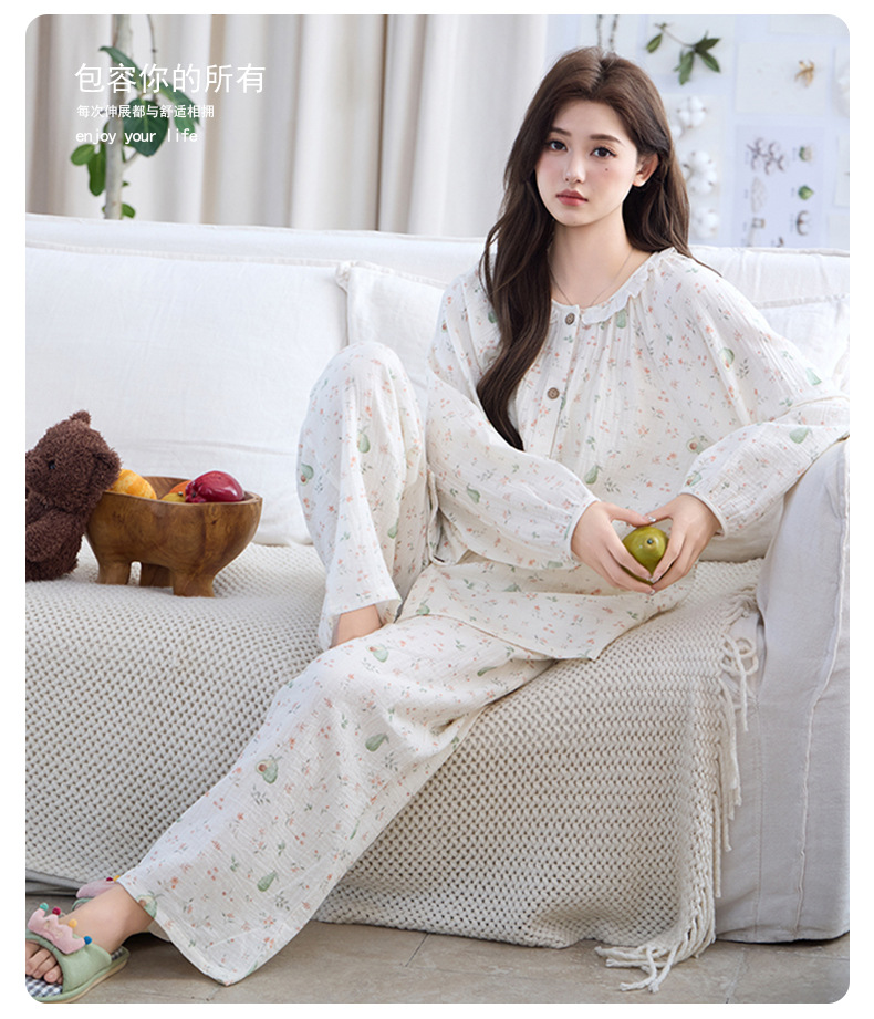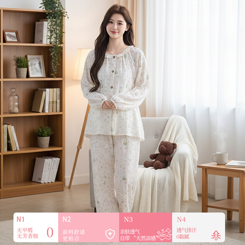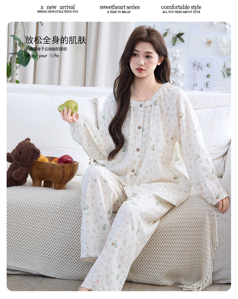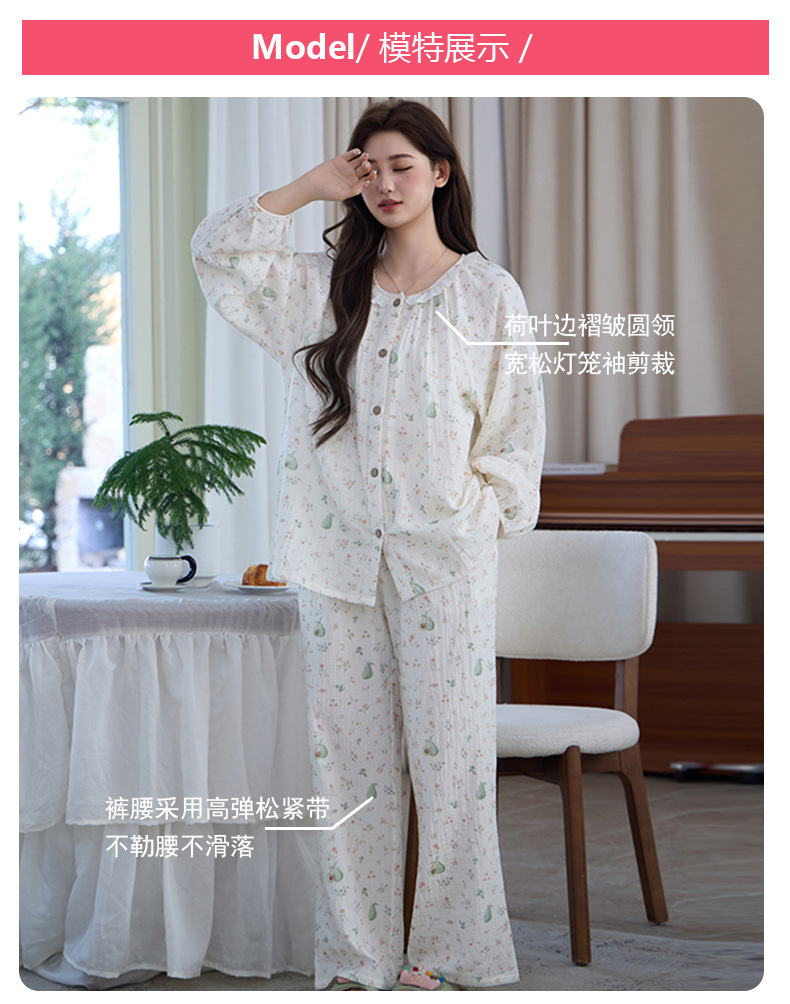 (总)洛兰沙家居馆 竹棉睡衣女款春秋季新款棉纱家居服女薄款花边圆领长袖睡衣居家服