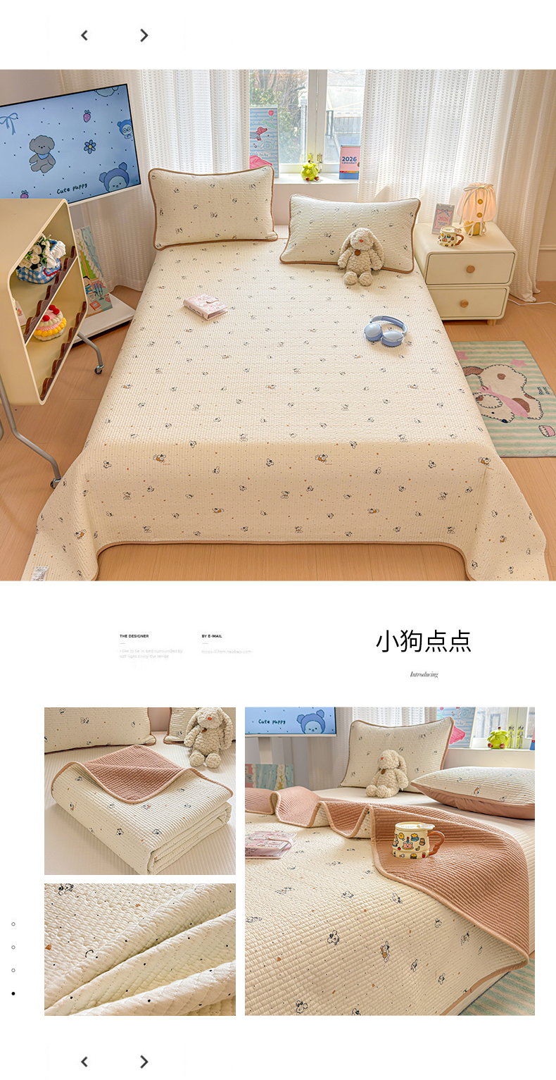 (总)雅萱家纺 2026新款森系全棉夹棉印花床盖,晨雾碎花,萌兔乐园,奶黄星星熊,雾蓝花境,星星猫,豹纹小狗,橙意满满,蛋糕熊仔,动物园,格纹萌犬,花丛小熊,简约时代,焦糖腊肠犬,咖啡小熊,洛克花园,墨兰樱桃,奶油兔叽,色块絮语,绅士狗,松鼠乐园,桃气修狗,兔彼得,夏日小黄花,仙草兔,心意满满,星星小象,樱桃小狗,郁金香狗