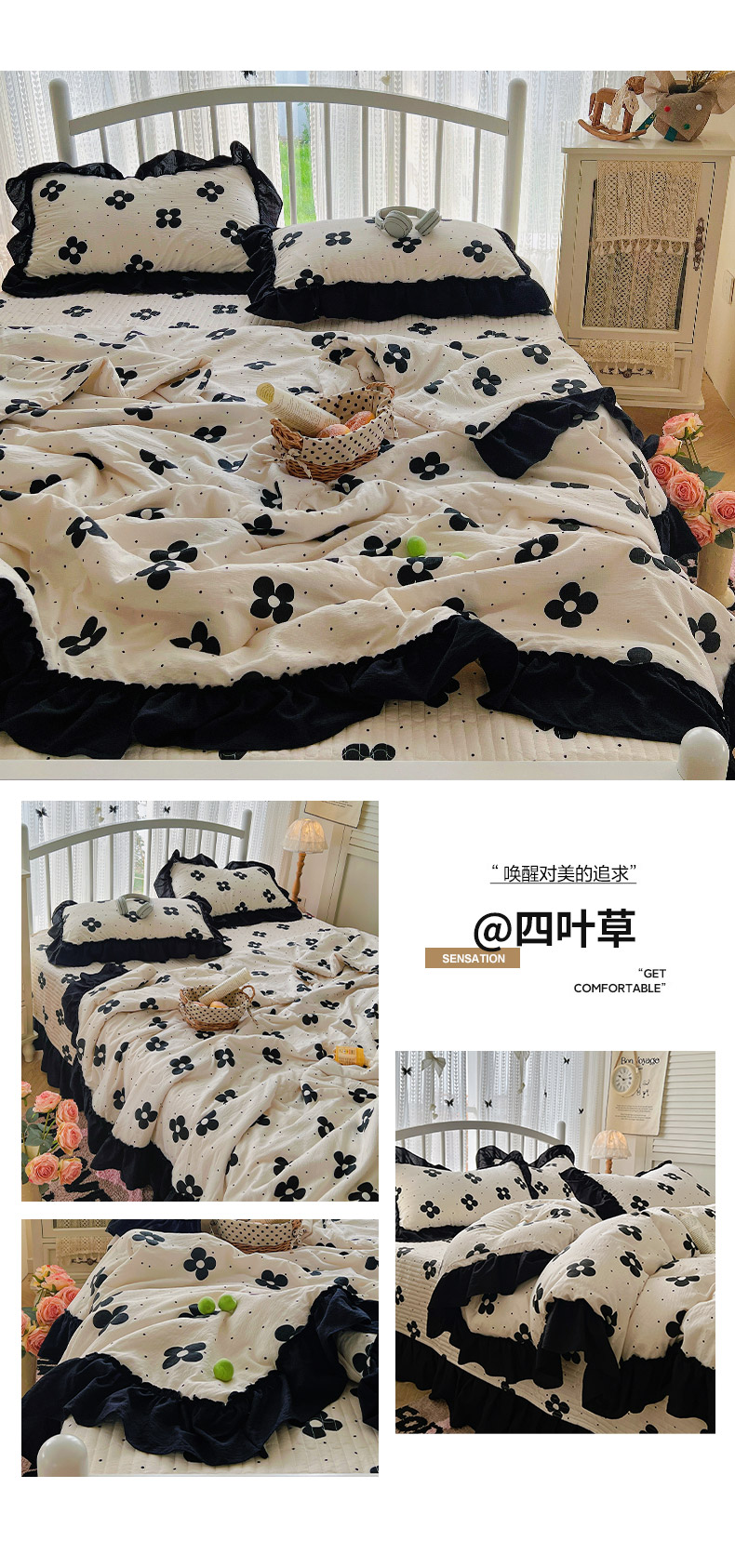 当前位置: 91家纺网 > 商品网购 > 床品套件 > 四件套 > 夏被四件套 > 金梦拉家纺 2026新款皱皱纱泡泡纱法式赫本系列床盖大花边四件套夏被四件套 四叶草