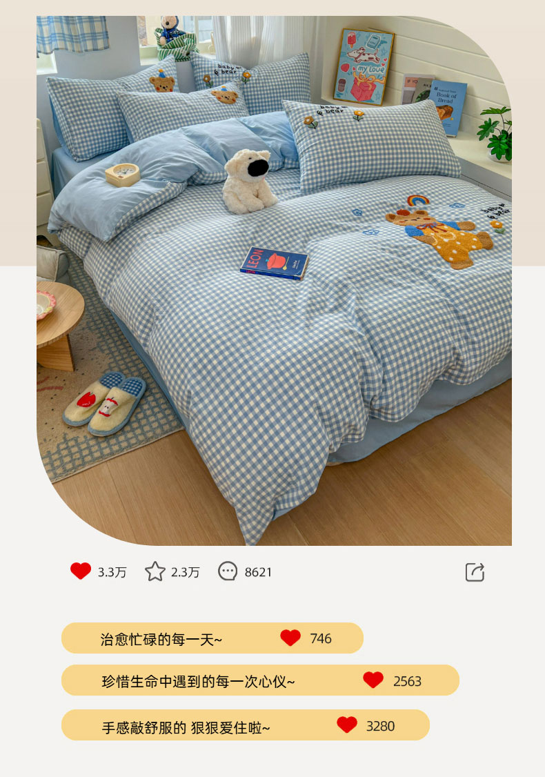 商品名称:一比一家纺 2026新款仿棉毛巾绣四件套 蓝格小熊