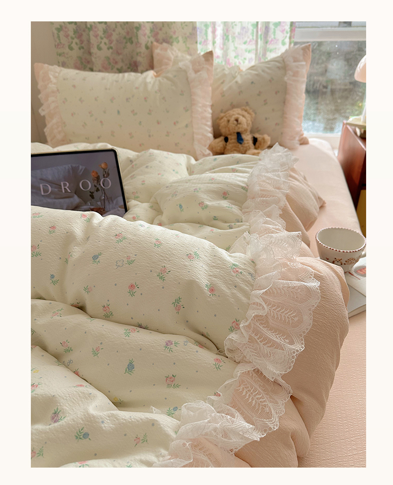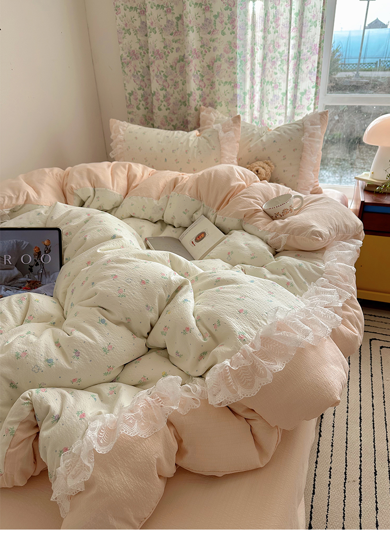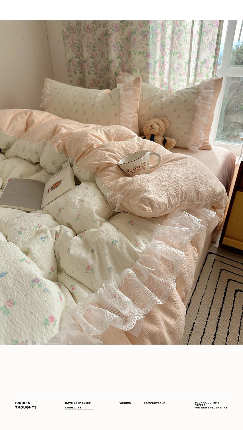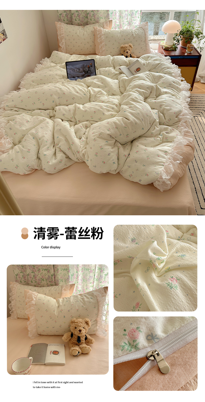 山茶家居-原创设计(原山茶家纺) 2026新款皱皱纱水洗棉花边四件套-清雾系列 清雾-蕾丝粉