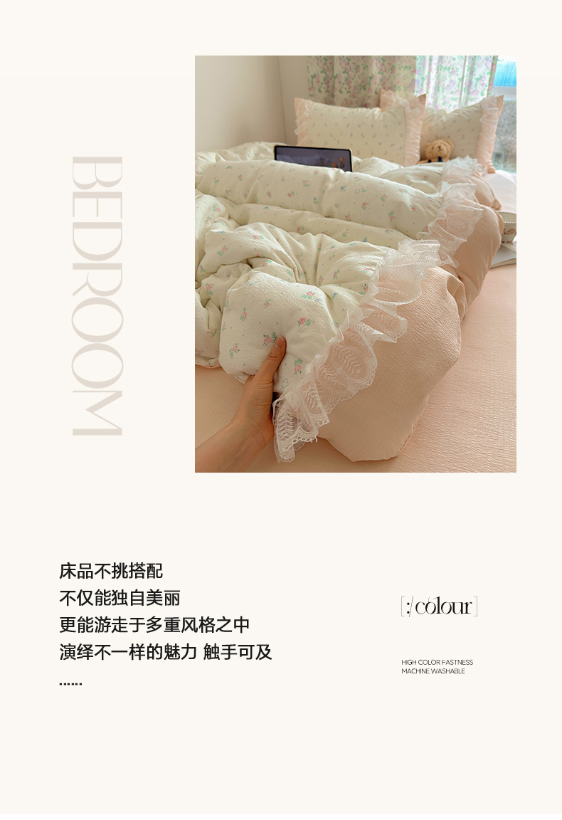 商品名称:山茶家居-原创设计(原山茶家纺) 2026新款皱皱纱水洗棉花边四件套-清雾系列 清雾-蕾丝粉