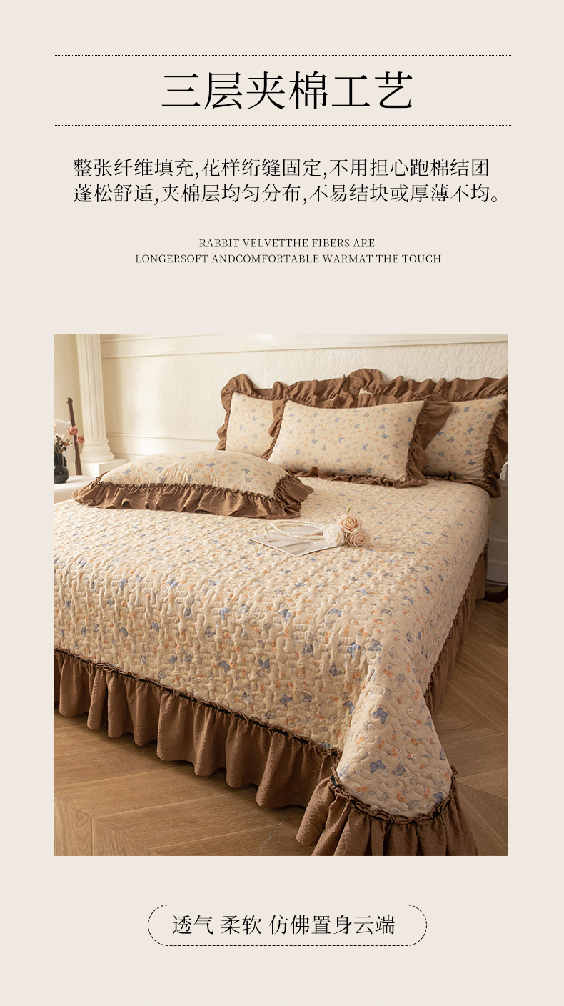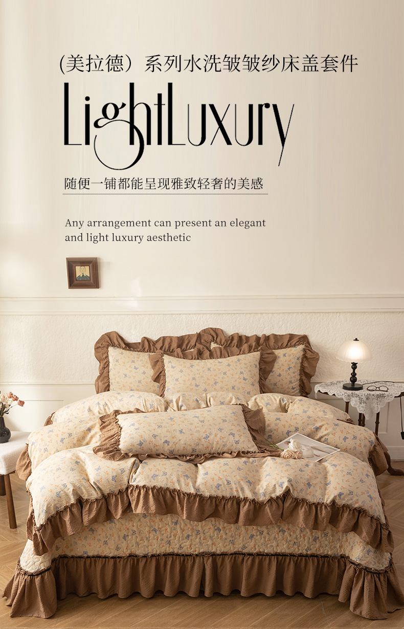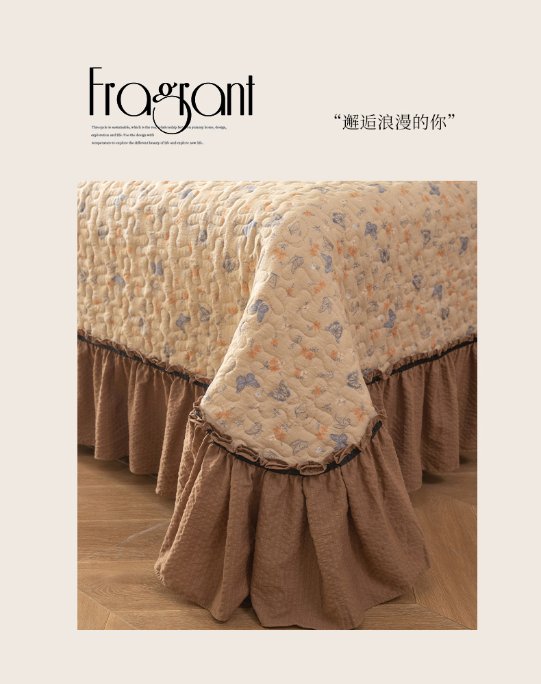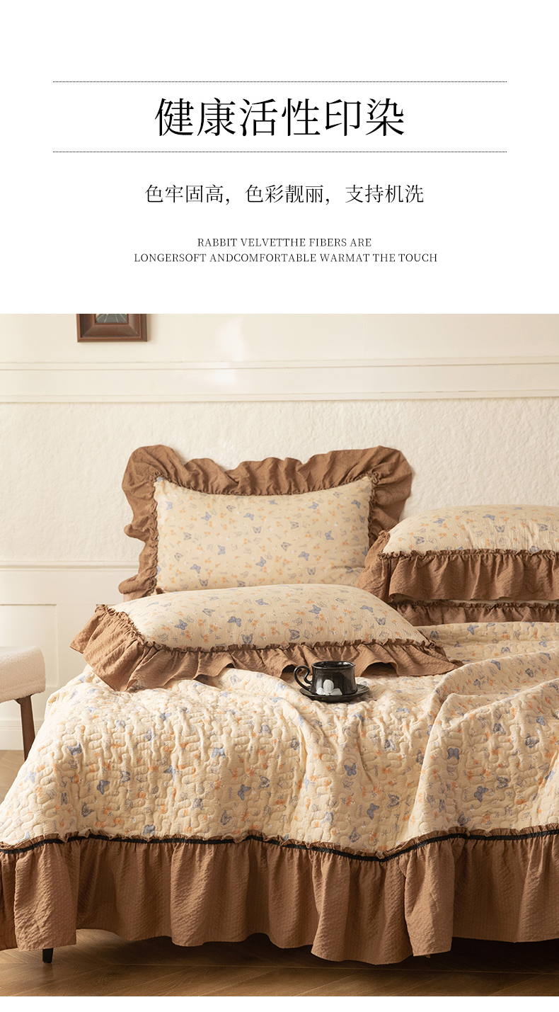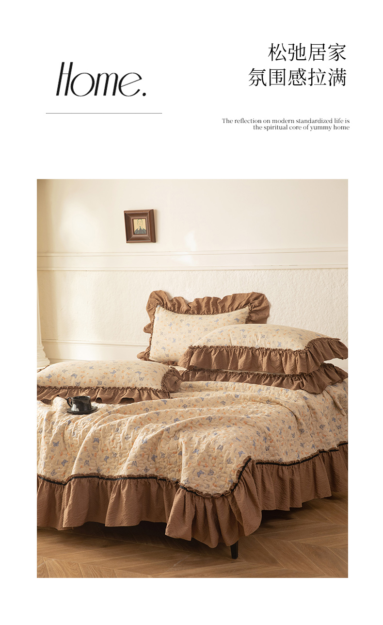 • 91家纺网 家纺一手货源 找家纺 贝凯瑞 2026新款(美拉德)系列双层纱木棉水洗棉法式花边单件三件四件床盖 美拉德-唐彩