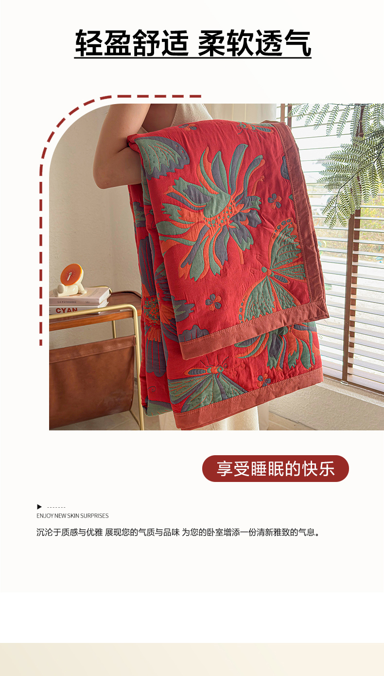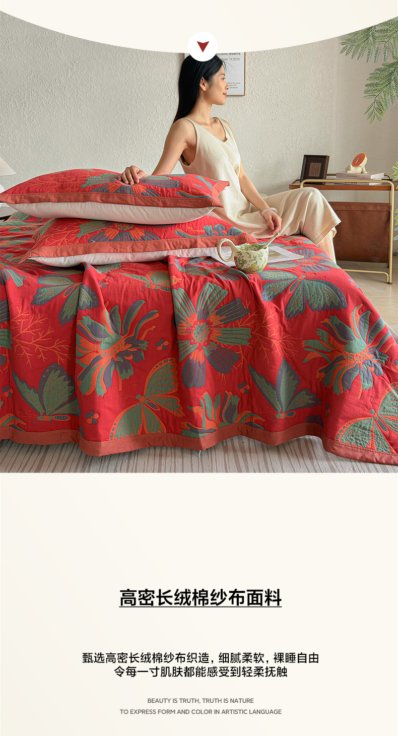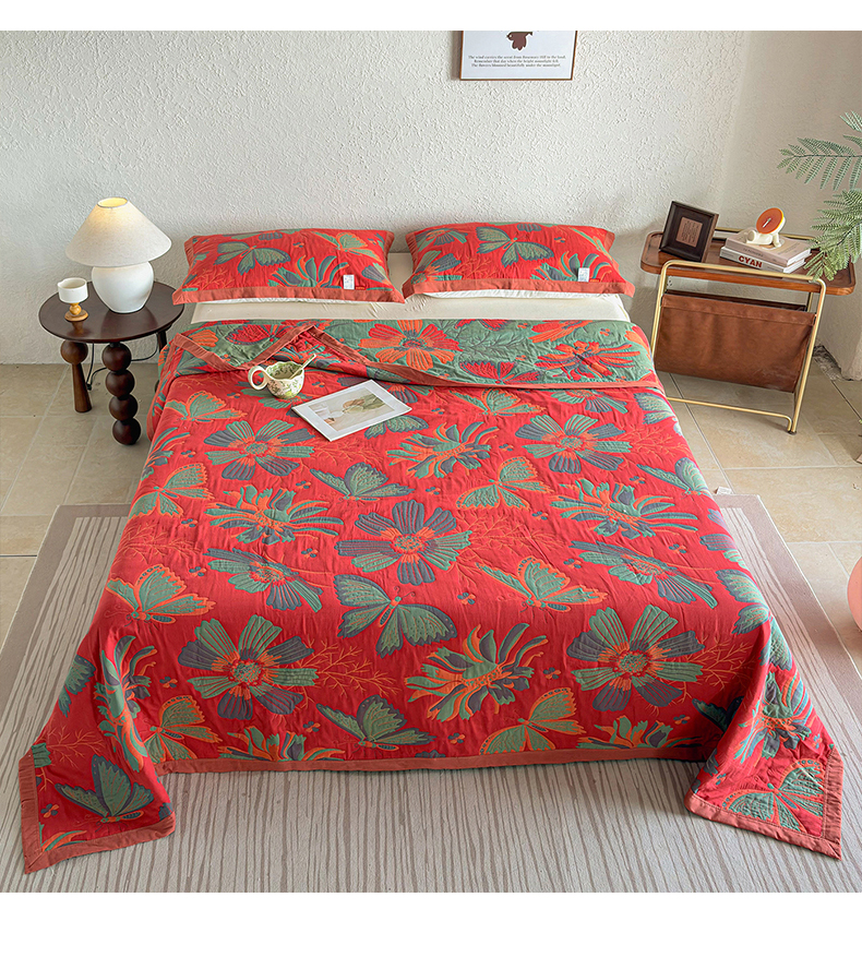 • 91家纺网 家纺一手货源 找家纺 棠薇家纺 2026新款纱布盖毯长绒棉纱布毛巾被夏被单双人棉纱盖毯毛巾毯夏季夏凉被空调被毯子可铺可盖床盖 花样蝶舞红
