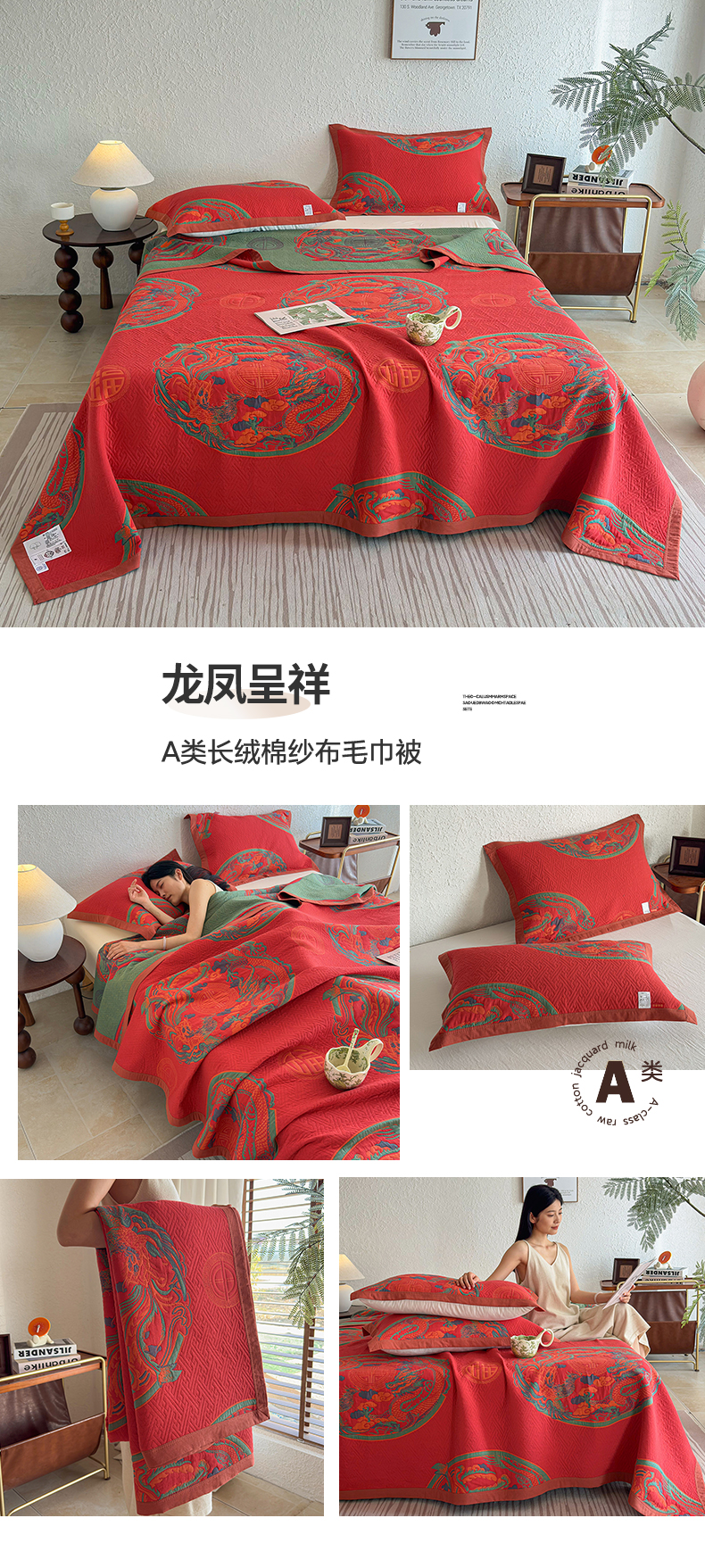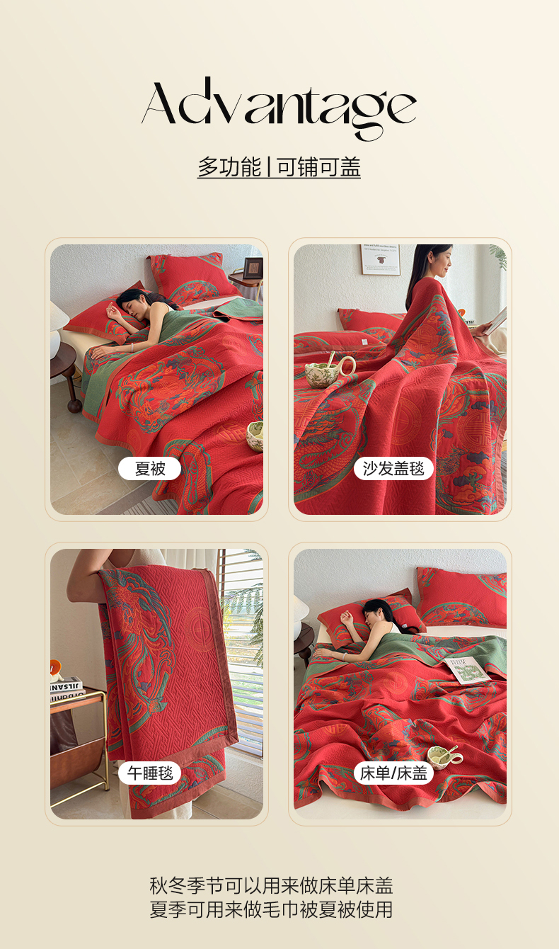 当前位置: 91家纺网 > 商品网购 > 被子 > 夏被 > 棠薇家纺 2026新款纱布盖毯长绒棉纱布毛巾被夏被单双人棉纱盖毯毛巾毯夏季夏凉被空调被毯子可铺可盖床盖 龙凤呈祥