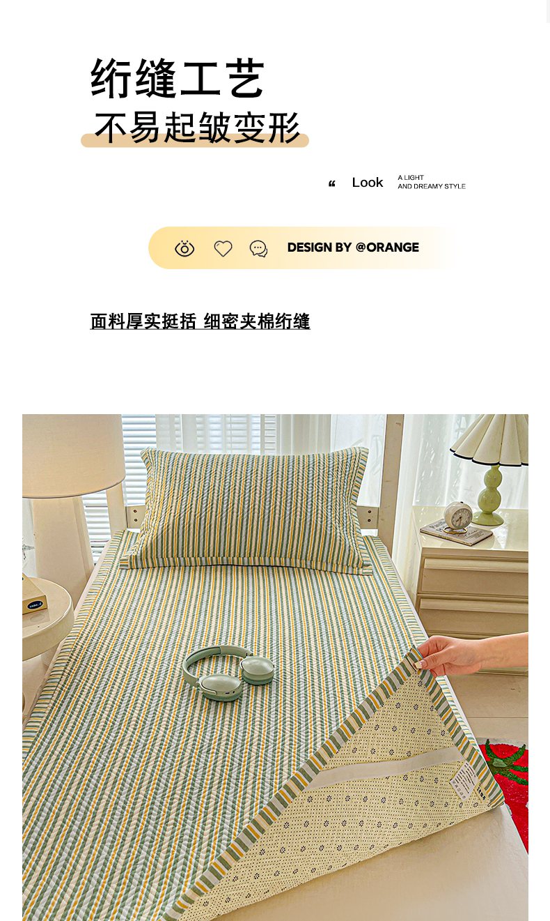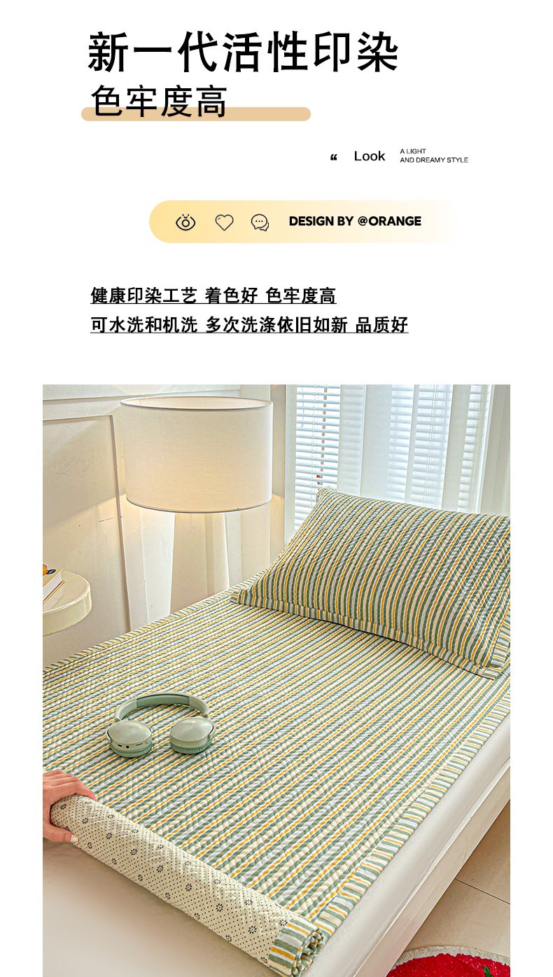 • 91家纺网 家纺一手货源 找家纺 忆生活家纺 2026新款学生床全棉老粗布软凉席夹棉床盖 条纹绿
