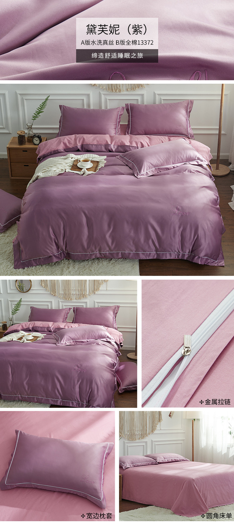 (总)意尚风情2023水洗真丝拼色绣花工艺款四件套,宝石蓝,皓月白+绅士灰,魅紫+浅咖,深海蓝+樱花粉,水绿+樱花粉,香槟+绅士灰,樱花粉+绅士灰,祖母绿+姜黄