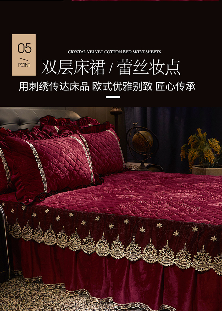 宜凡家纺 2019新款水晶绒夹棉床裙两边 花之都-酒红