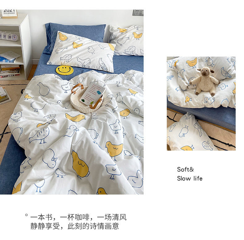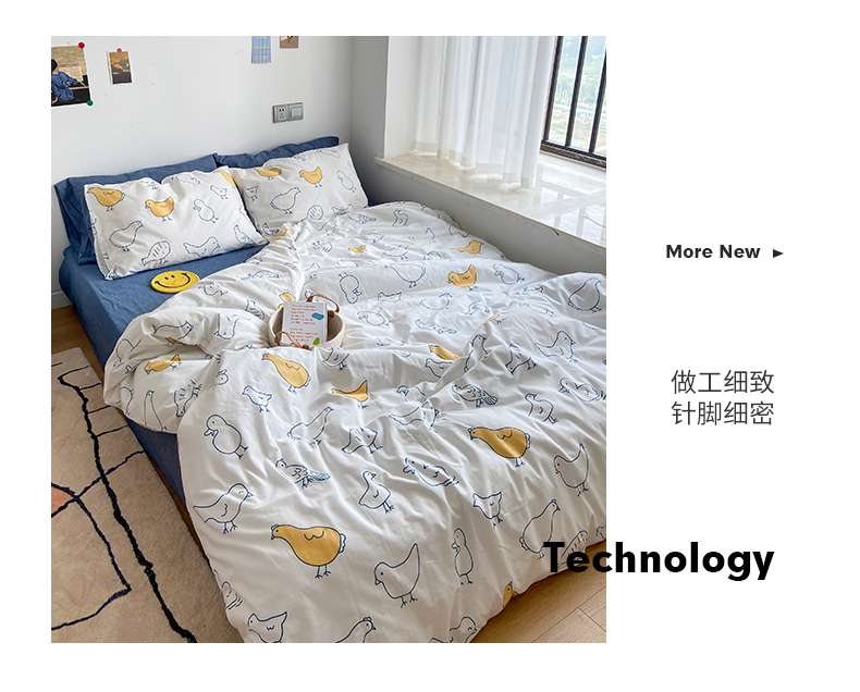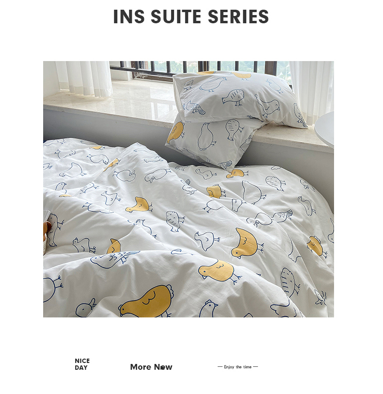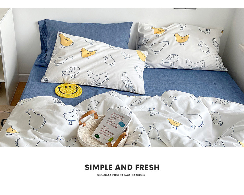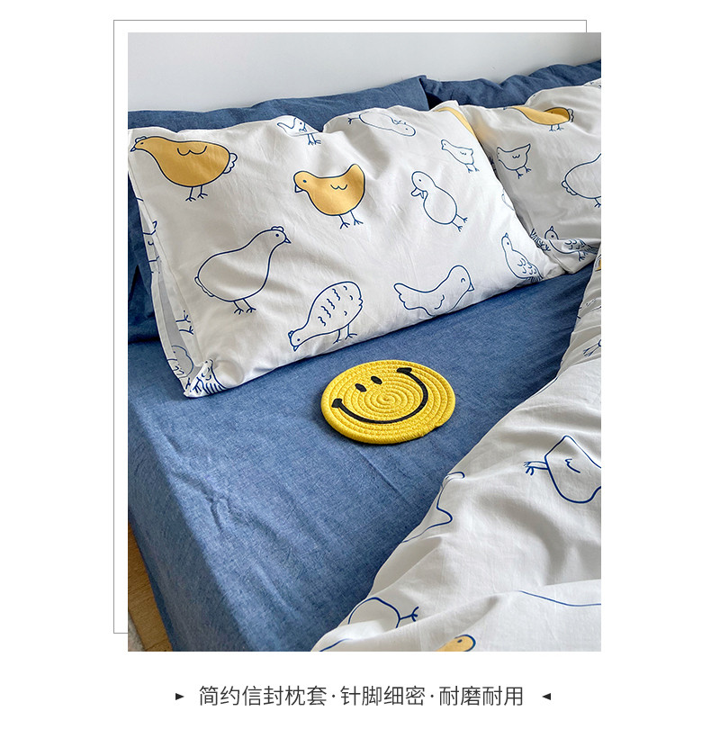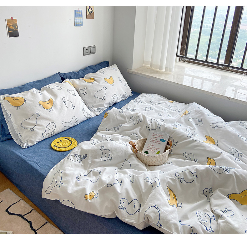 当前位置: 91家纺网 > 商品网购 > 床品套件 > 四件套 > 全棉普通四件套 > 尺素 纯棉ins印花水洗棉卡通可爱全棉被套纯色床单四件套 可爱小鸡白