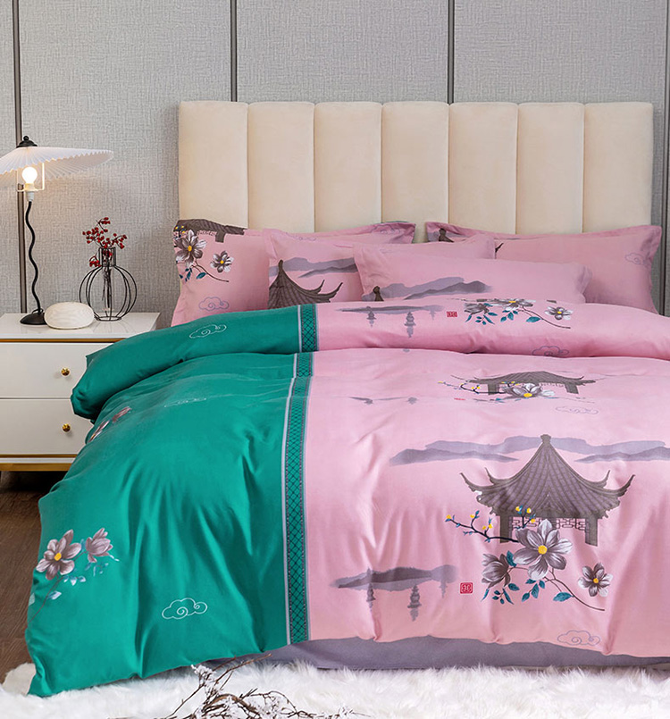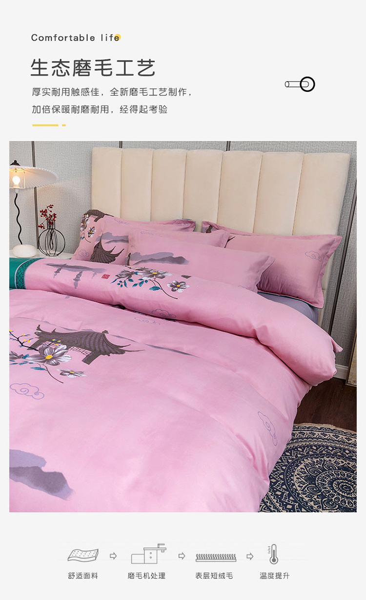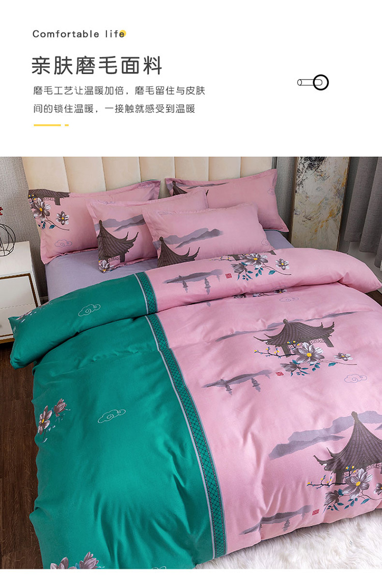 优尚 2021新款亲肤磨毛中国风大版花系列四件套 粉棠黛绿