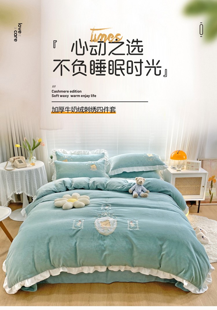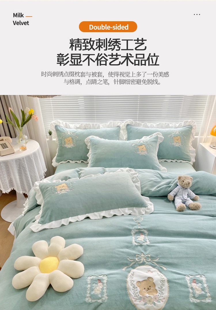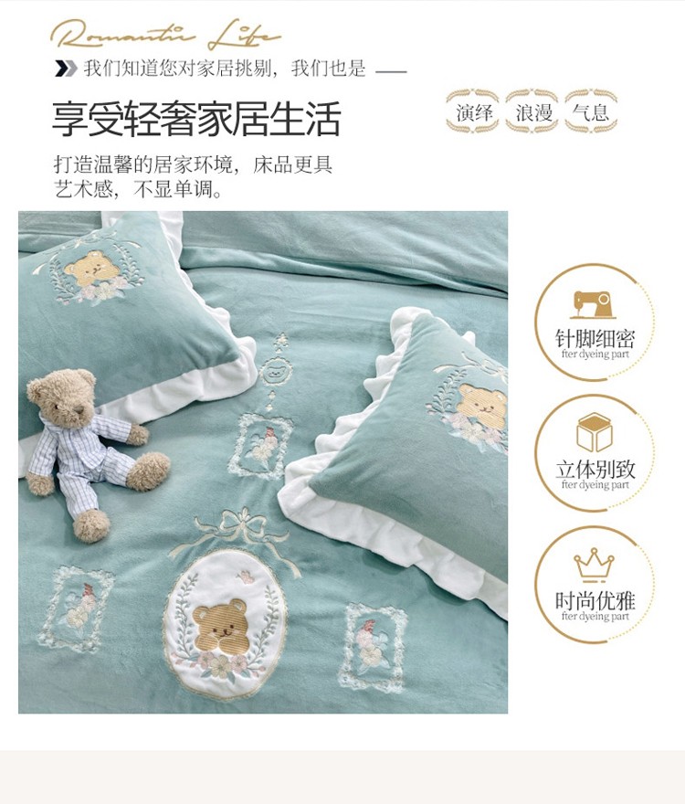 星尚 高品质牛奶绒绣花四件套加厚法莱宝宝婴儿绒-乖乖熊 水绿