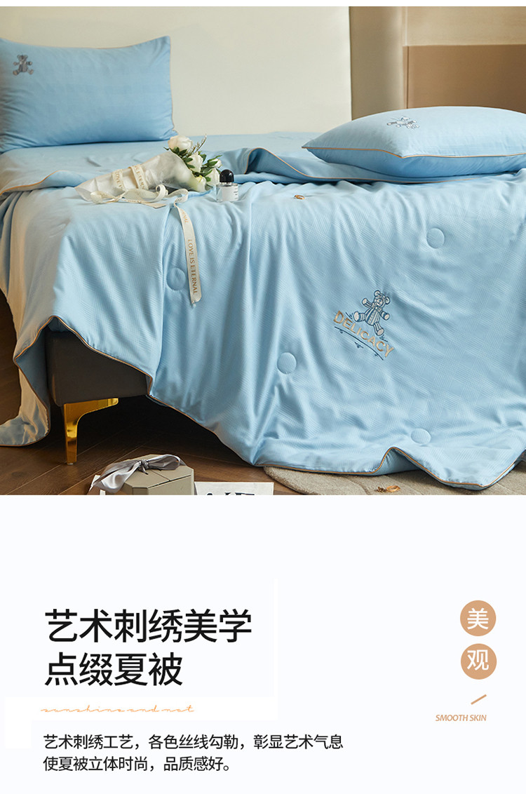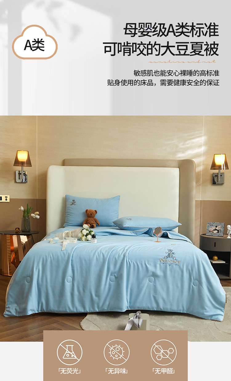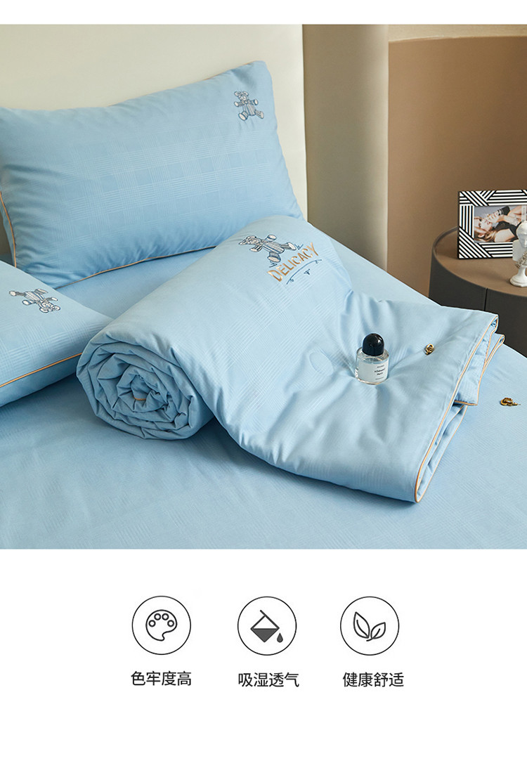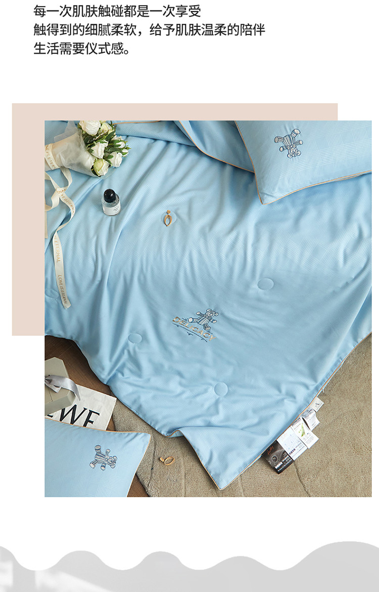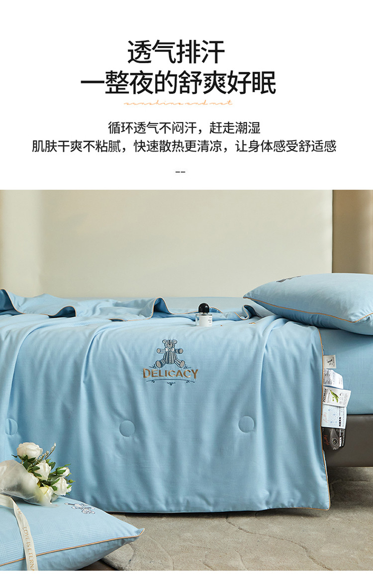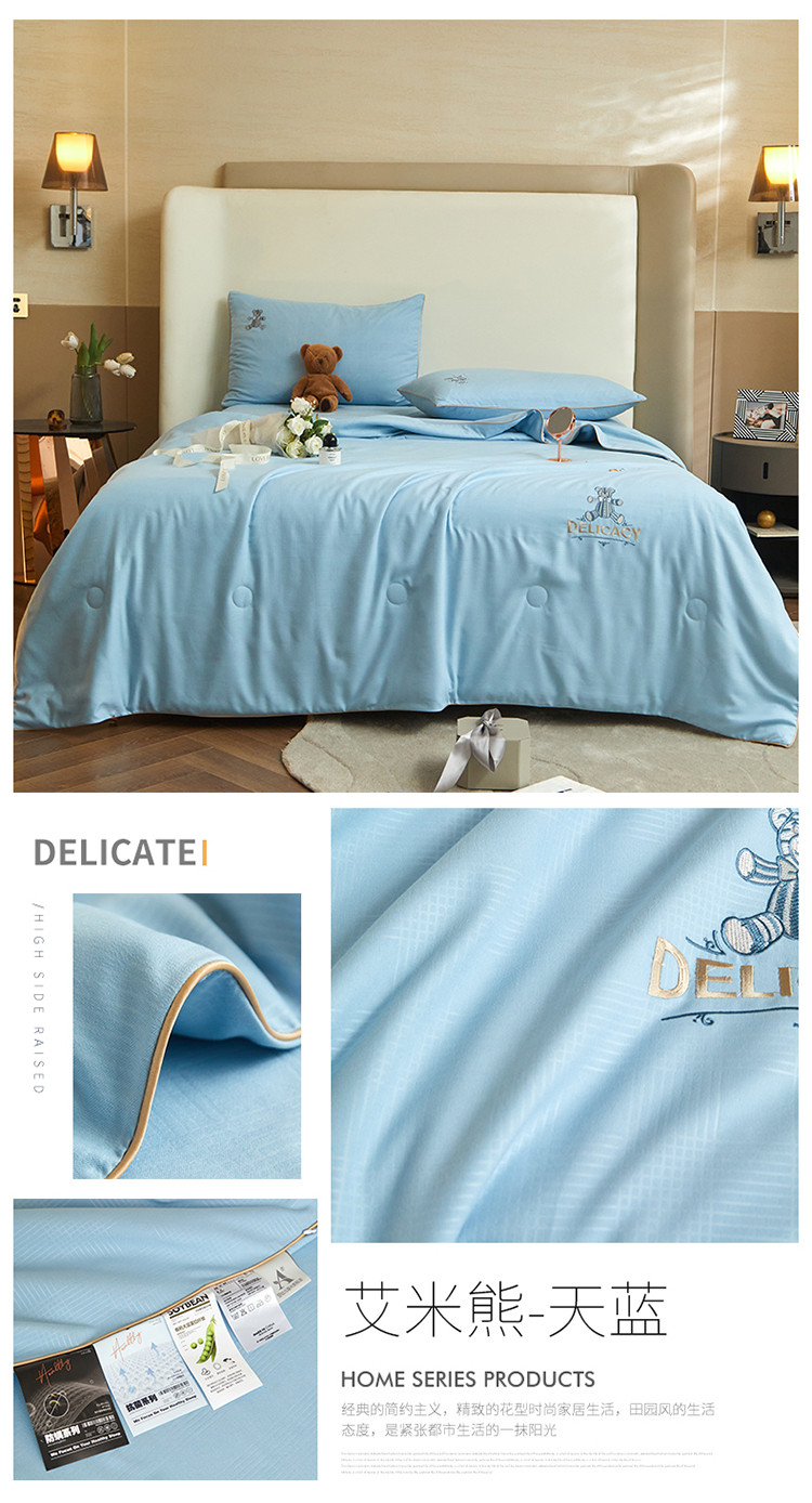 当前位置: 91家纺网 > 商品网购 > 床品套件 > 四件套 > 夏被四件套 > 头等舱 2022甄柔棉A类雕花大豆抗菌防螨夏被艾米熊-天蓝