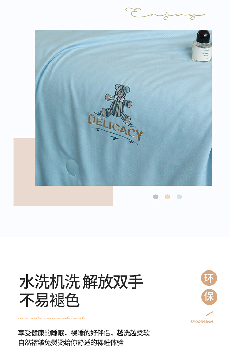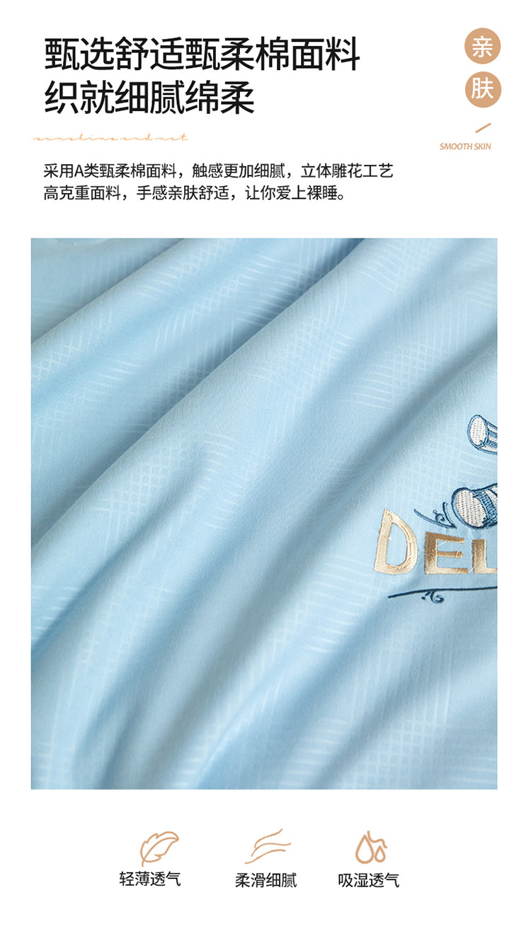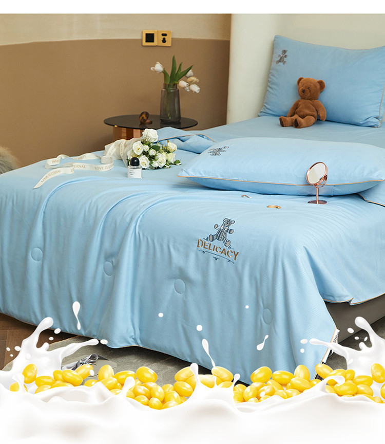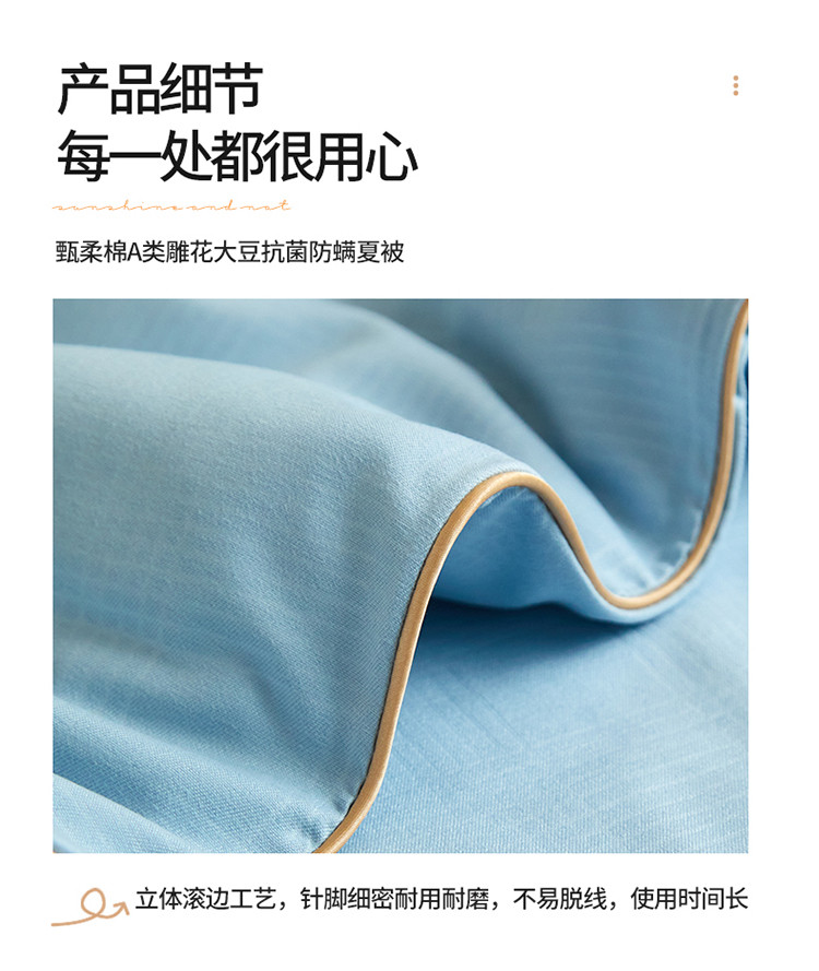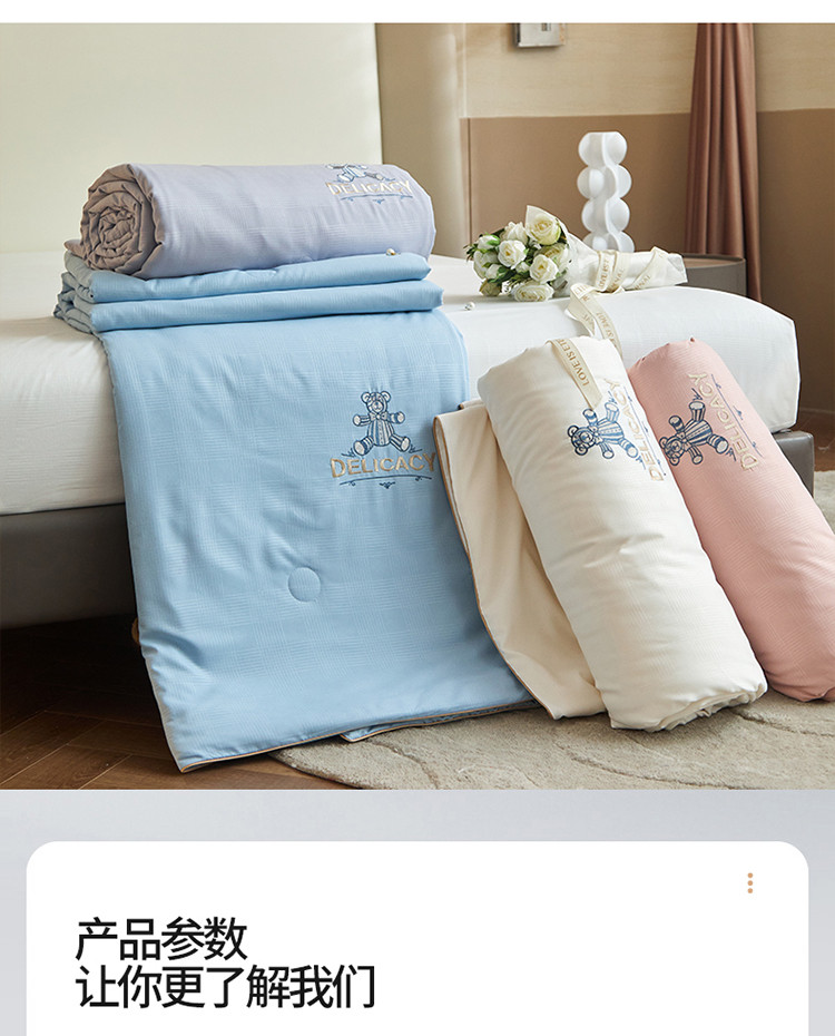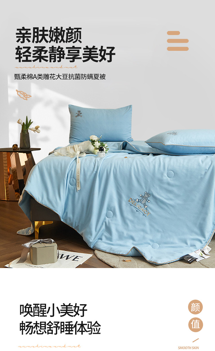 当前位置: 91家纺网 > 商品网购 > 床品套件 > 四件套 > 夏被四件套 > 头等舱 2022甄柔棉A类雕花大豆抗菌防螨夏被艾米熊-天蓝