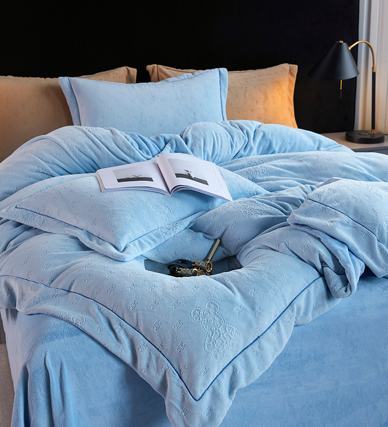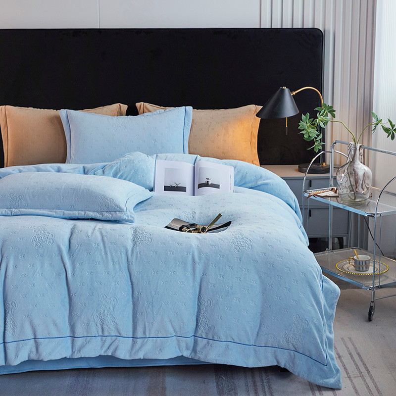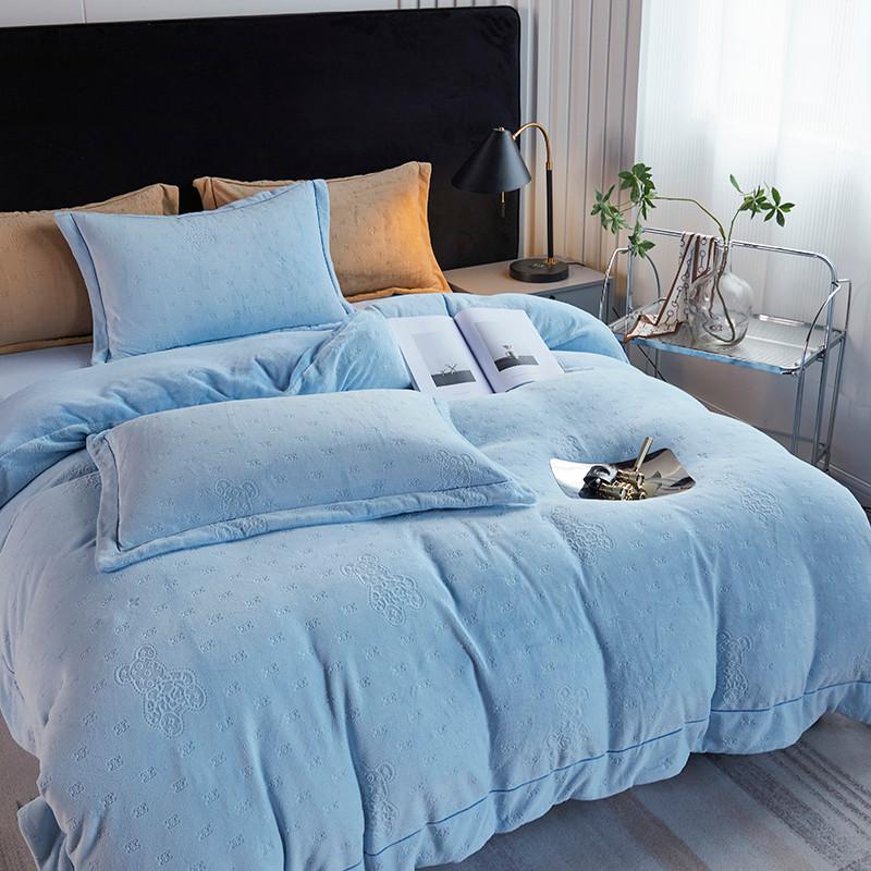 凡客家居 2022新款牛奶绒雕花系列四件套 靓仔熊-智慧蓝