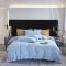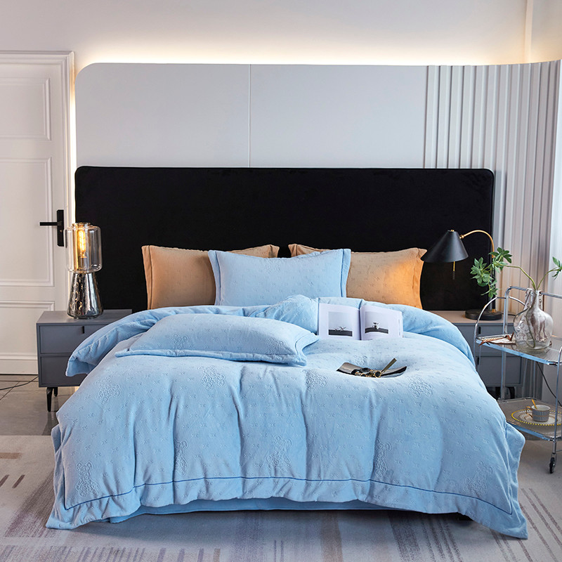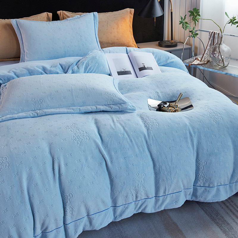 商品名称:凡客家居 2022新款牛奶绒雕花系列四件套 靓仔熊-智慧蓝