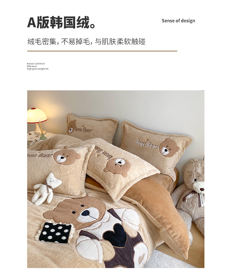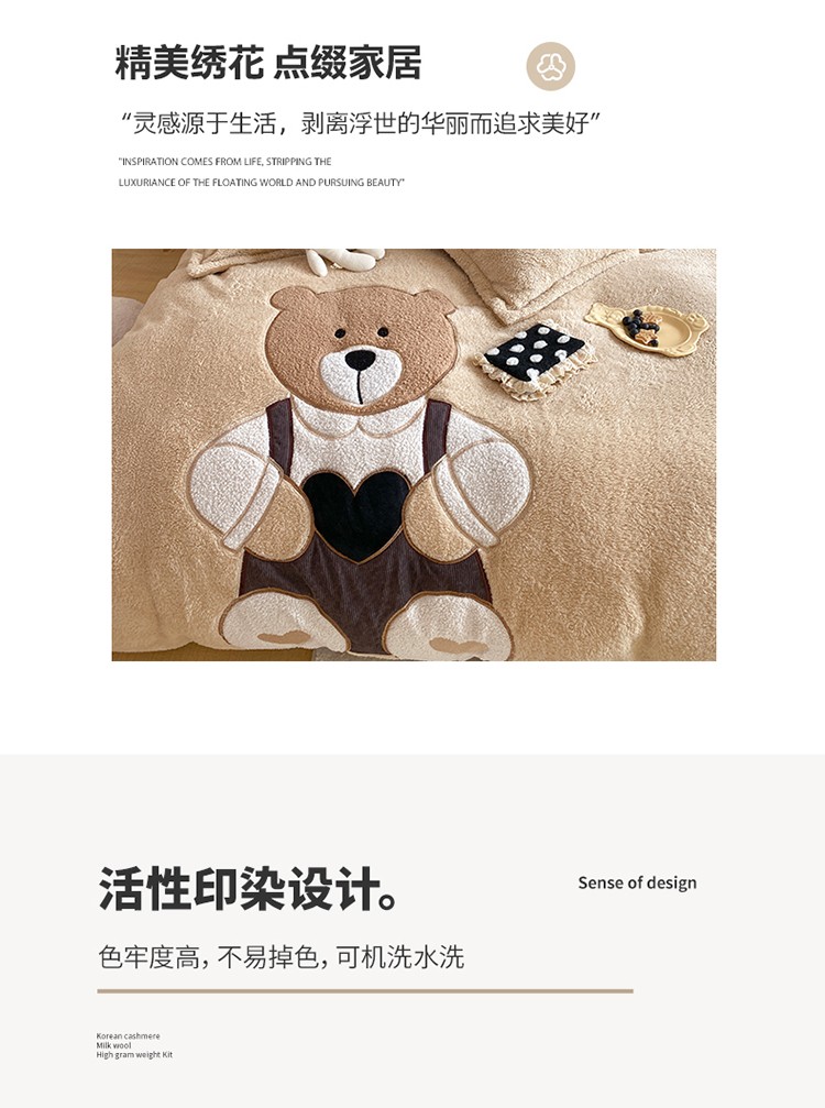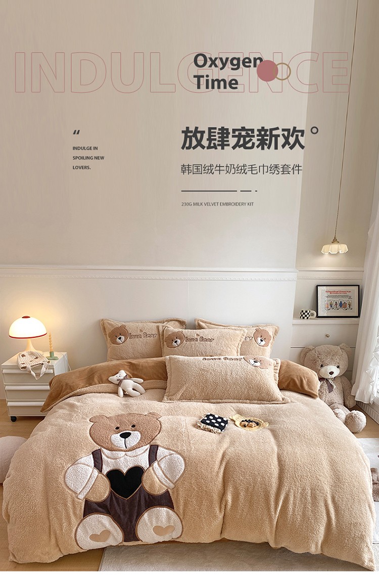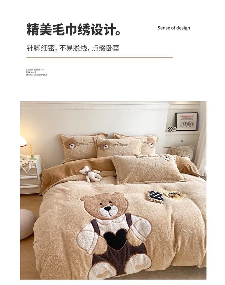 眠屿 2022新款韩国绒绣花四件套-爱心熊 奶茶咖