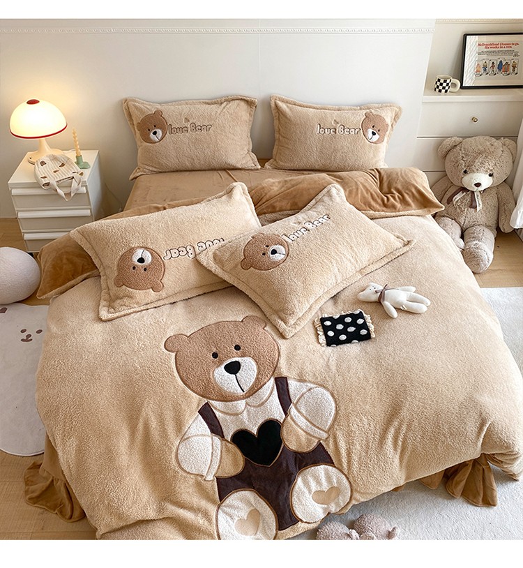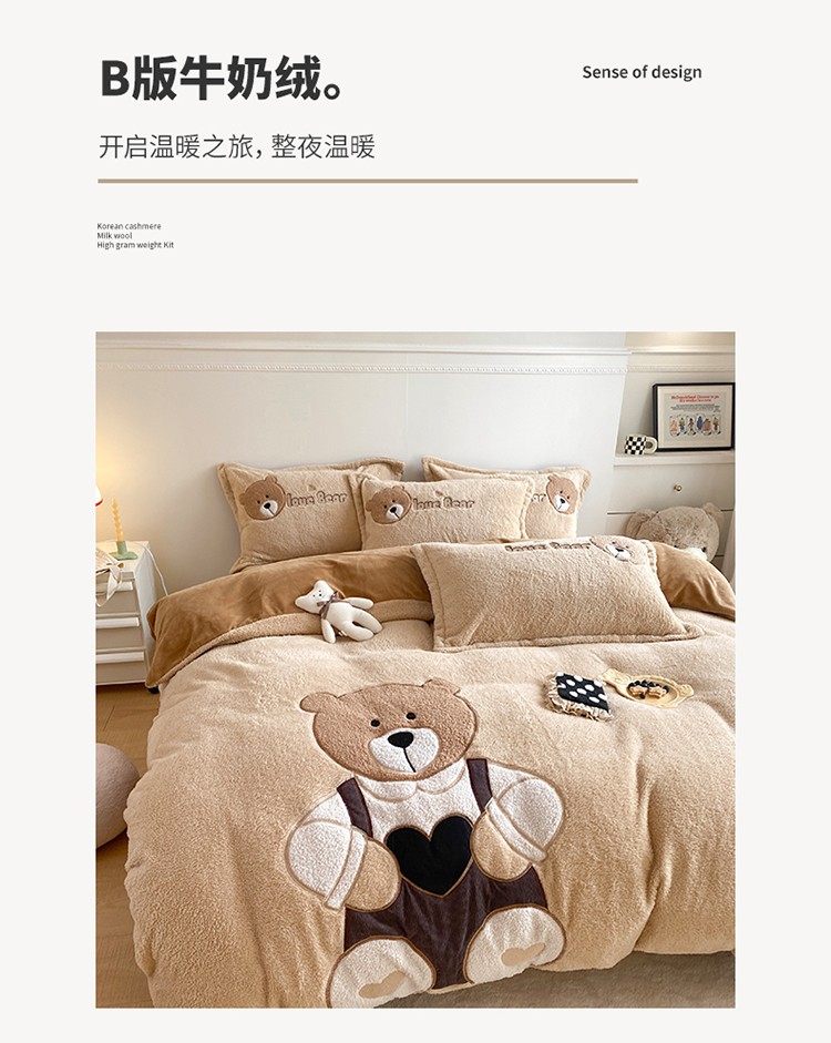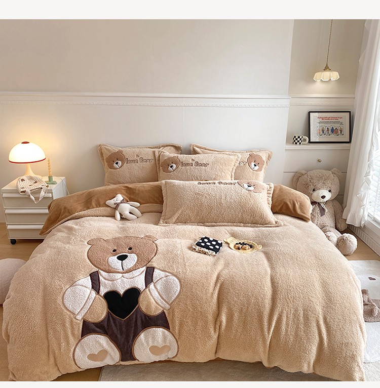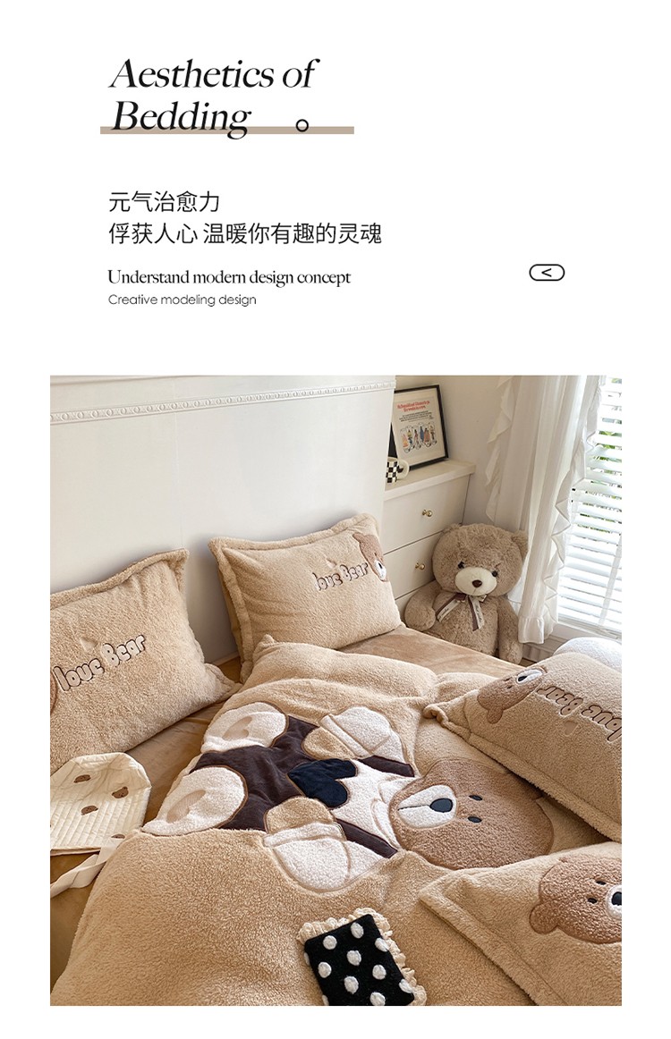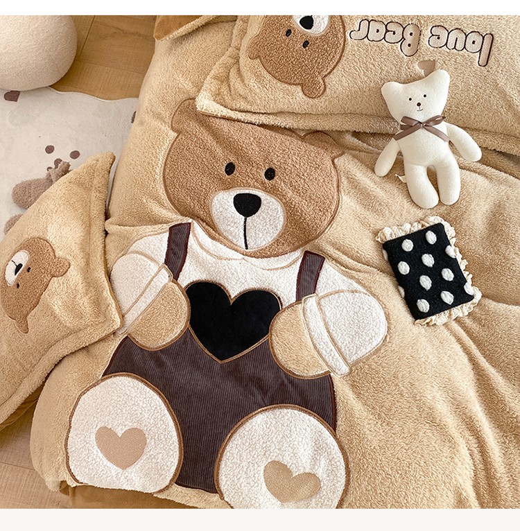 眠屿 2022新款韩国绒绣花四件套-爱心熊 奶茶咖