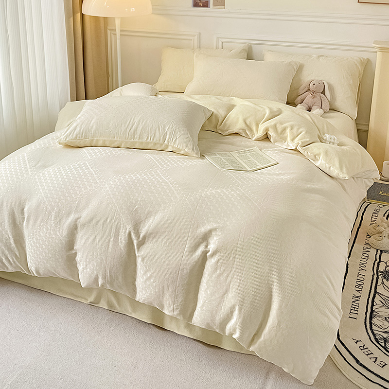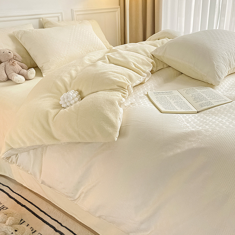 金丝鸟 2022全棉华夫格提花加牛奶绒四件套 拉夫格白