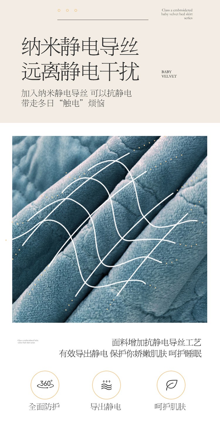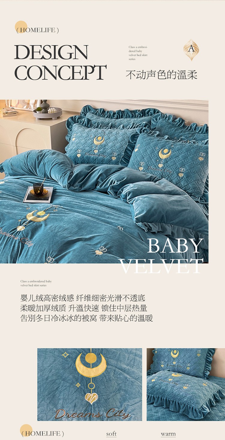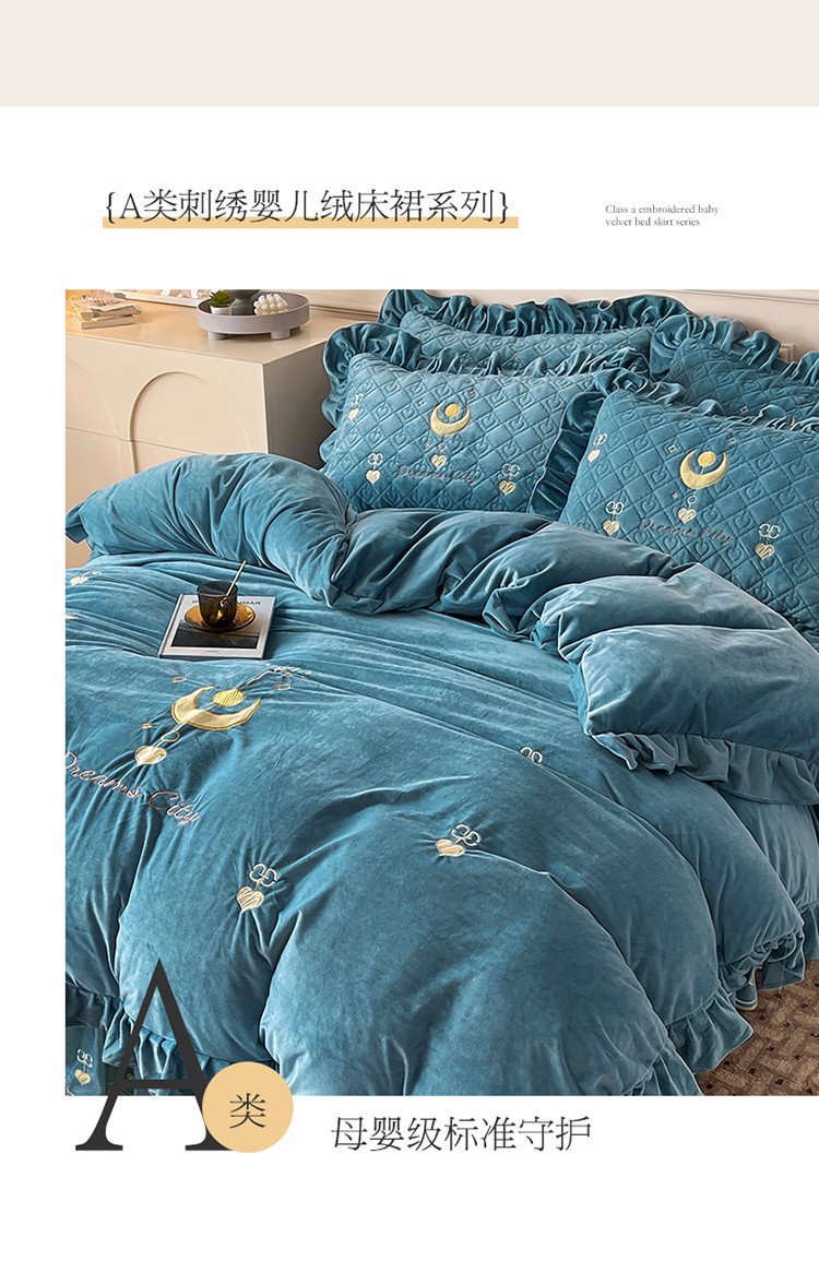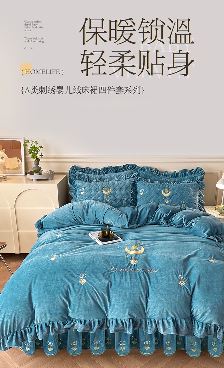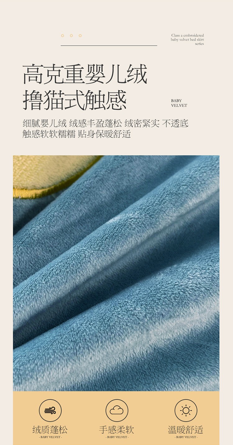 当前位置: 91家纺网 > 商品网购 > 床品套件 > 四件套 > 宝宝绒四件套 > 宜凡家纺 2022新款A类婴儿绒床裙星悦系列四件套 星悦-海盐蓝