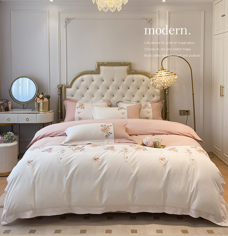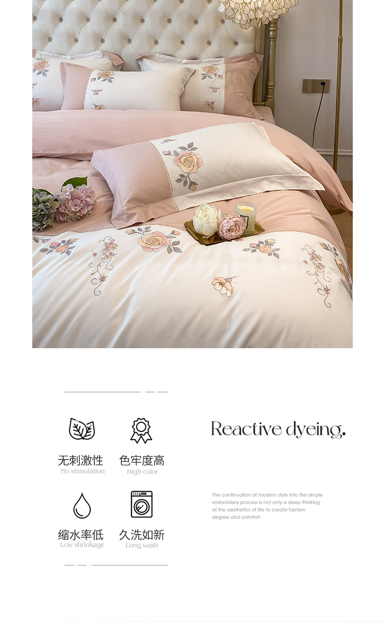 (总)理想家家纺 2025新款纯棉轻奢刺绣四件套--心愿系列场景二,心愿粉,心愿红,心愿黄,心愿蓝