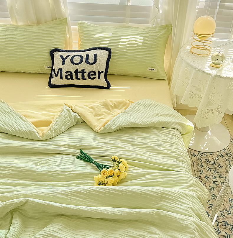 优选良品 2025新款韩版轻奢皱皱纱水洗棉拼色床单床笠四件套三件套-抹茶绿,抹茶绿