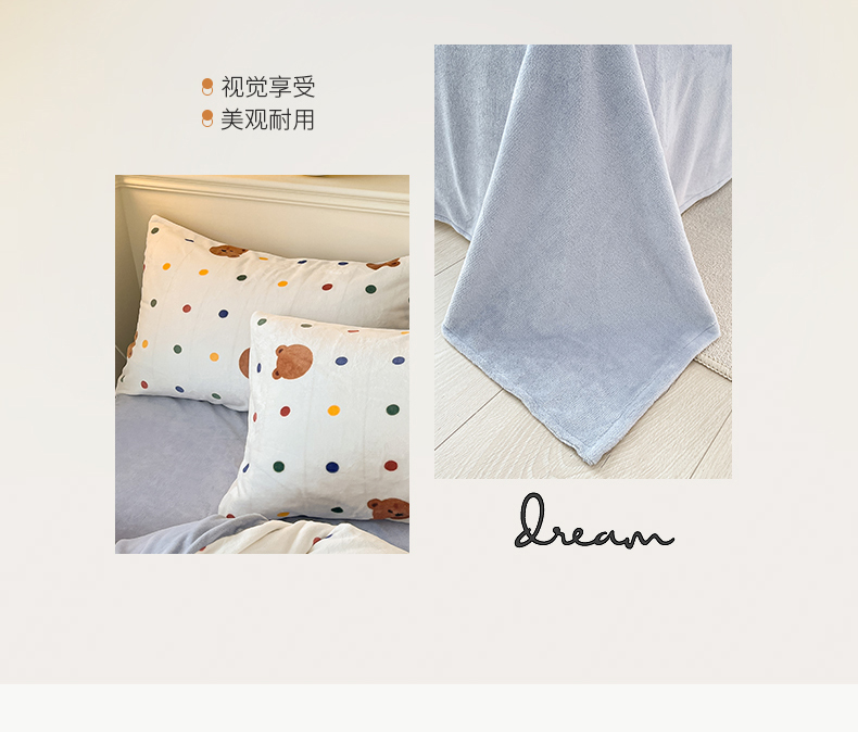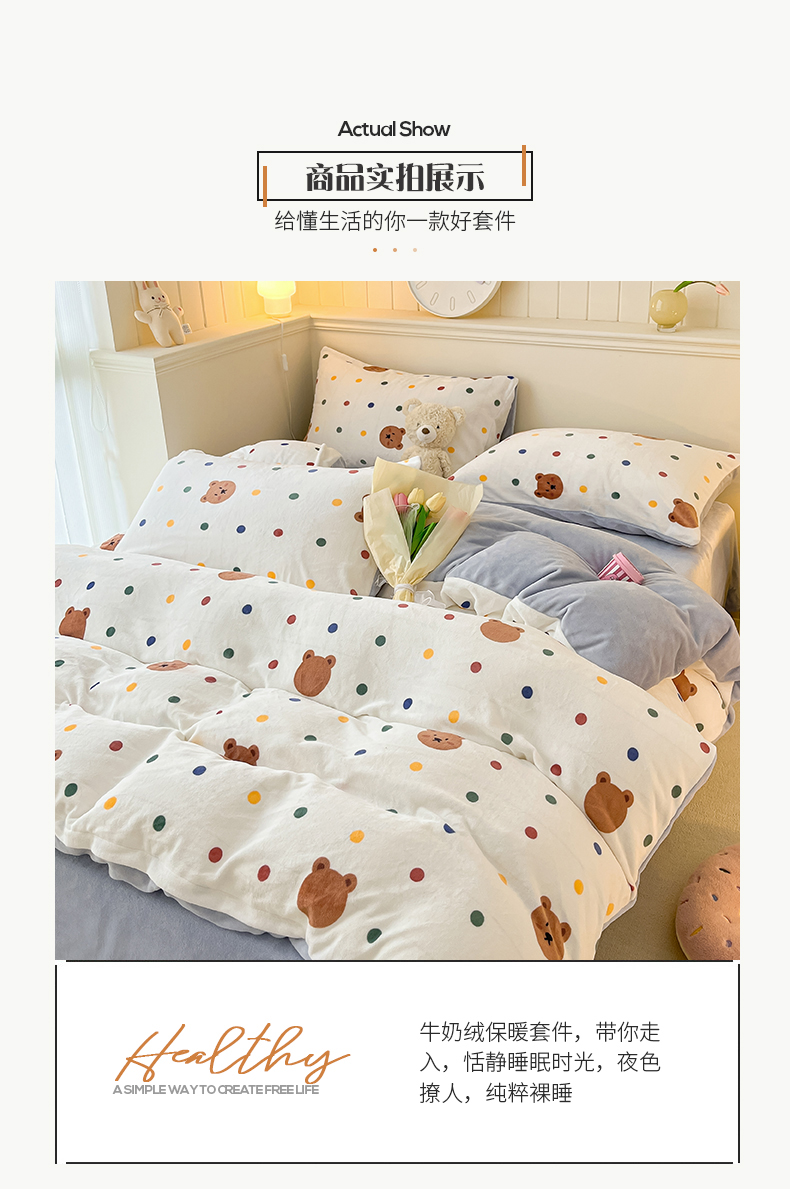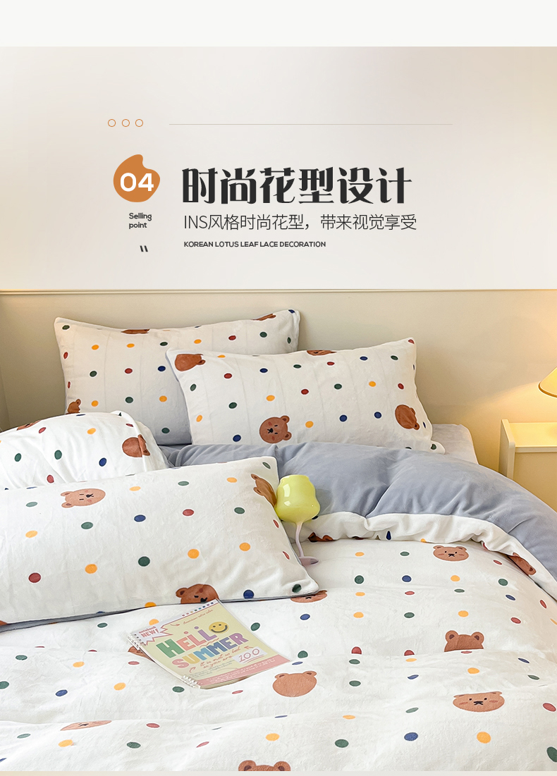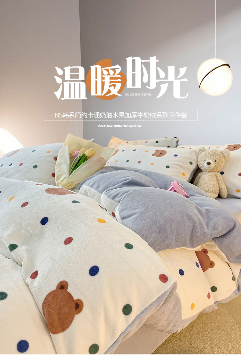 桃子家居 2023新款ins韩系简约卡通奶油小清新加厚牛奶绒系列四件套 绒-点点熊
