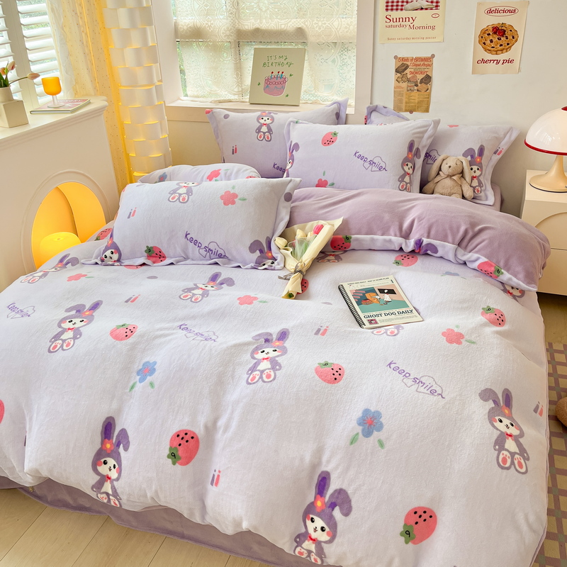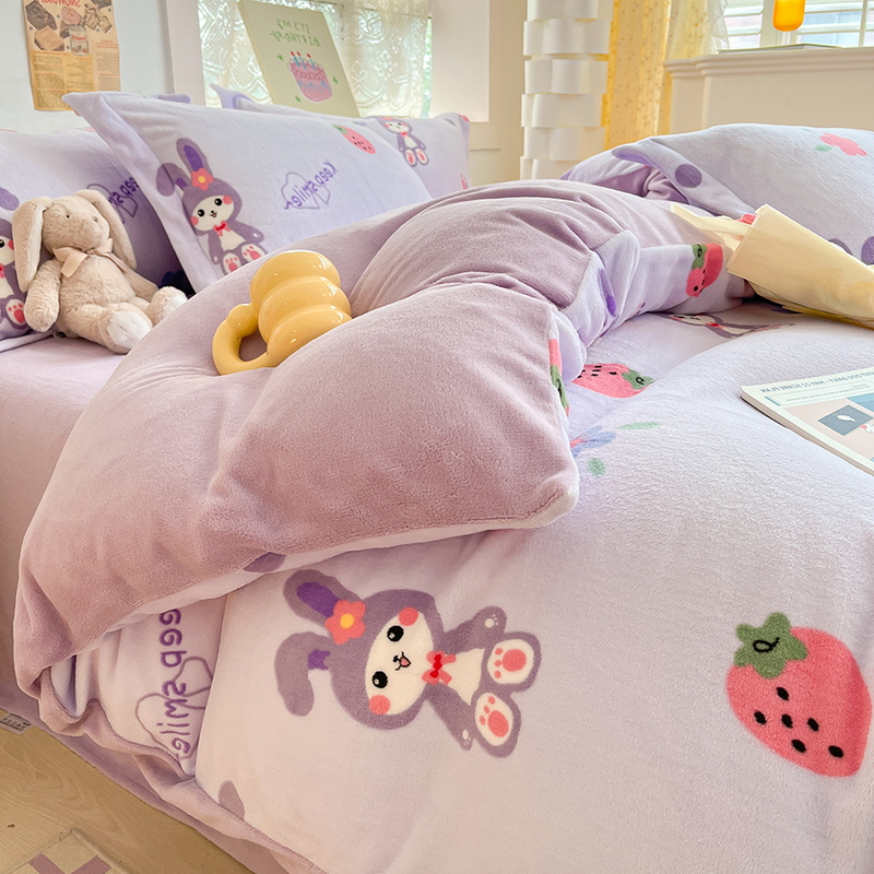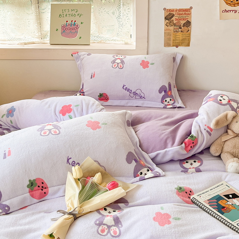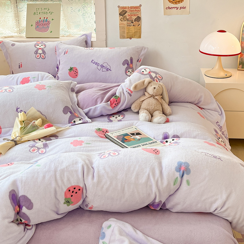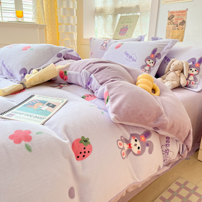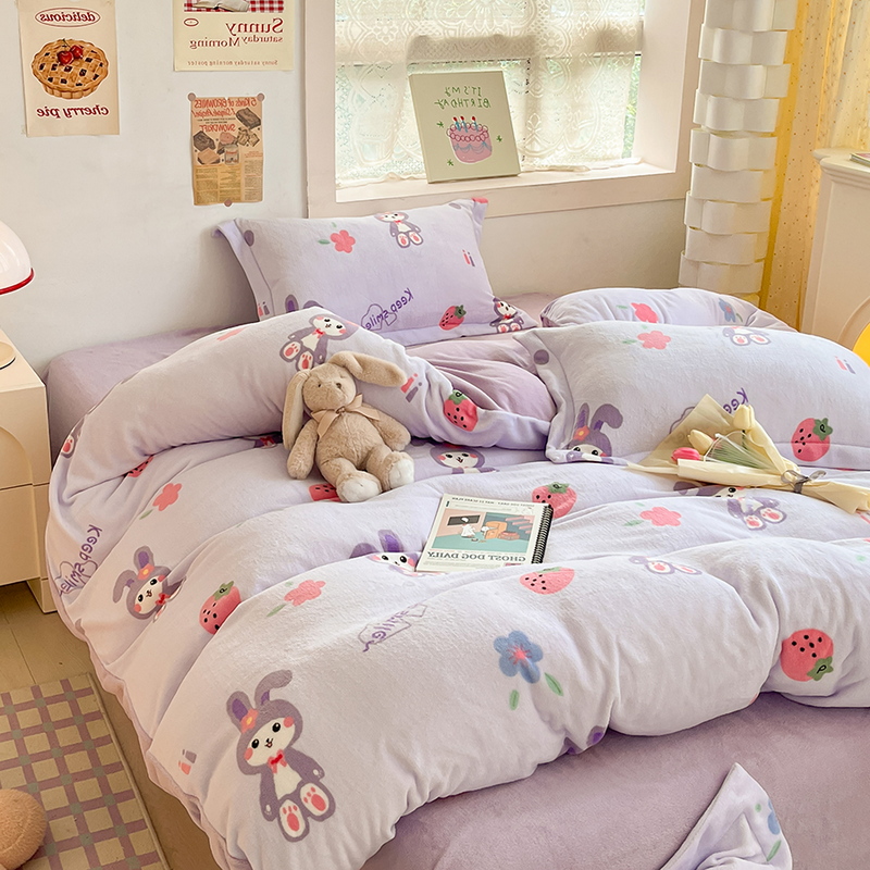 当前位置: 91家纺网 > 商品网购 > 床品套件 > 四件套 > 牛奶绒四件套 > 丝羽坊 2023新款加厚小清新牛奶绒印花四件套单被套 草莓兔