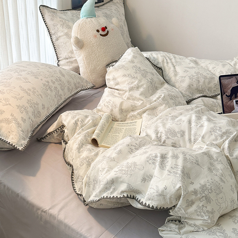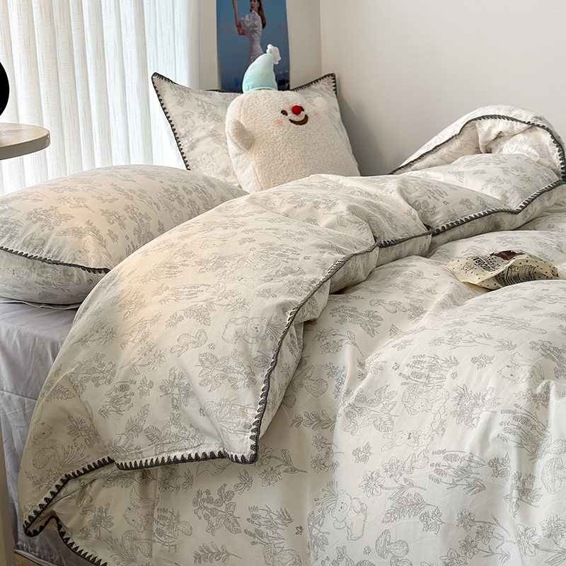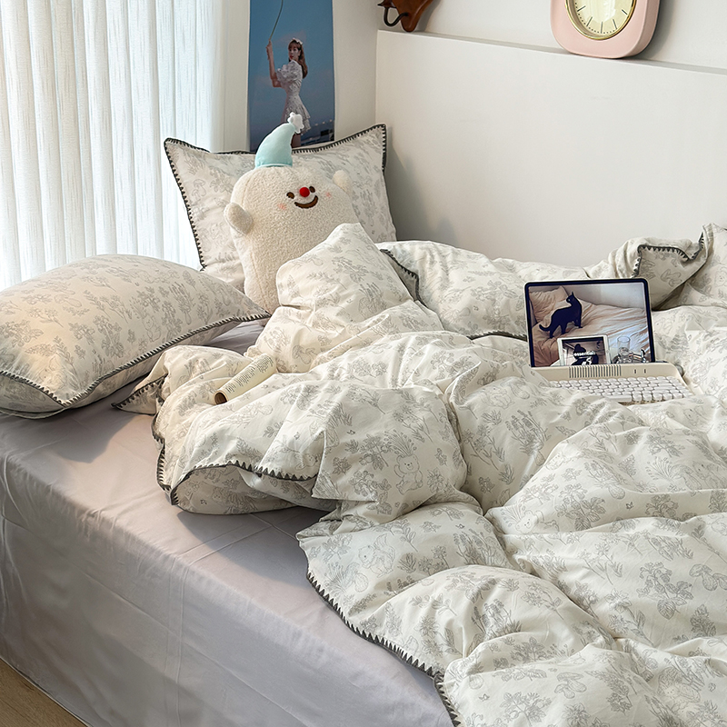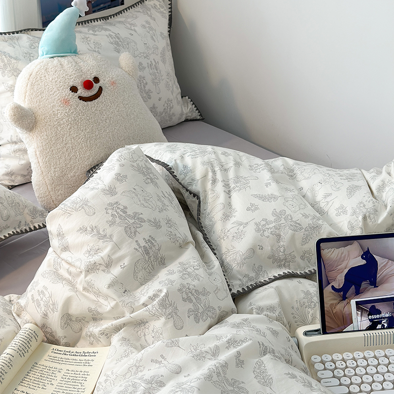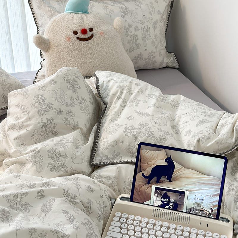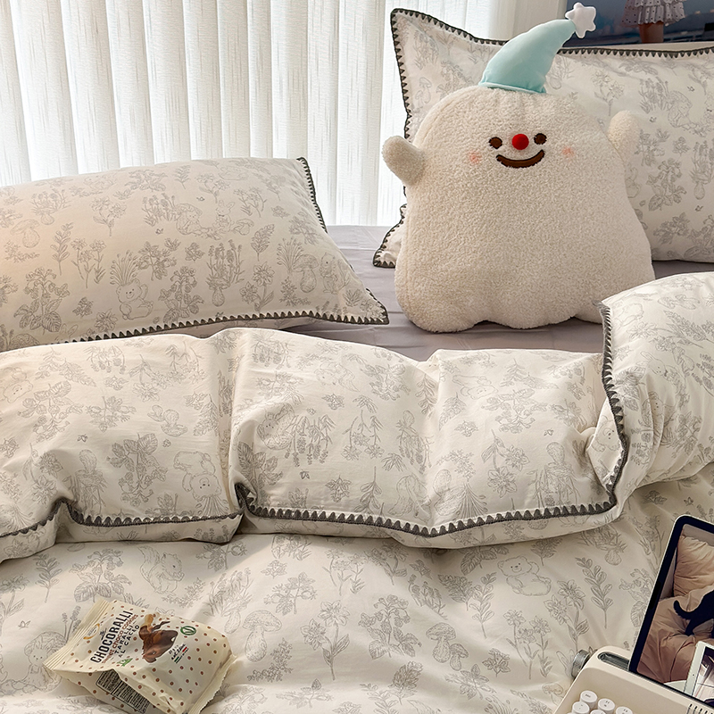 2023新款全棉印花贝壳三角针四件套 素描小卡通灰