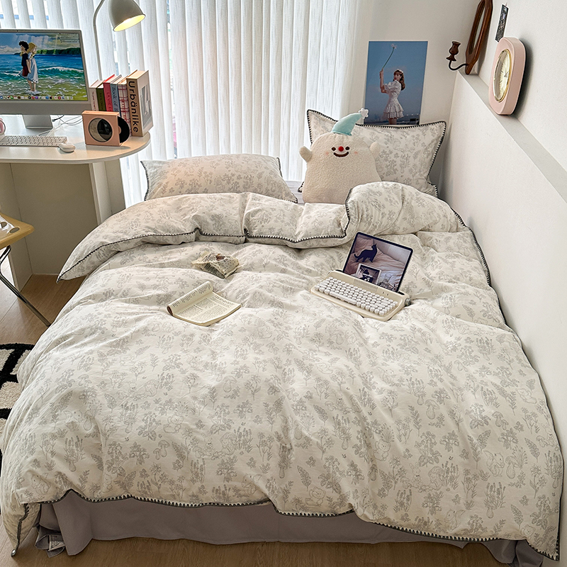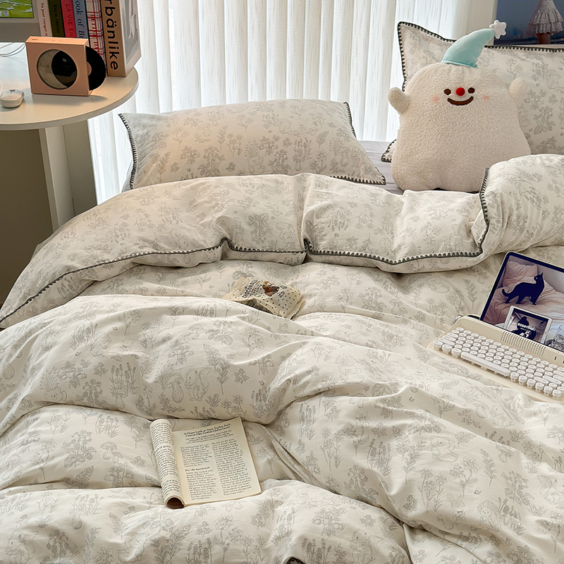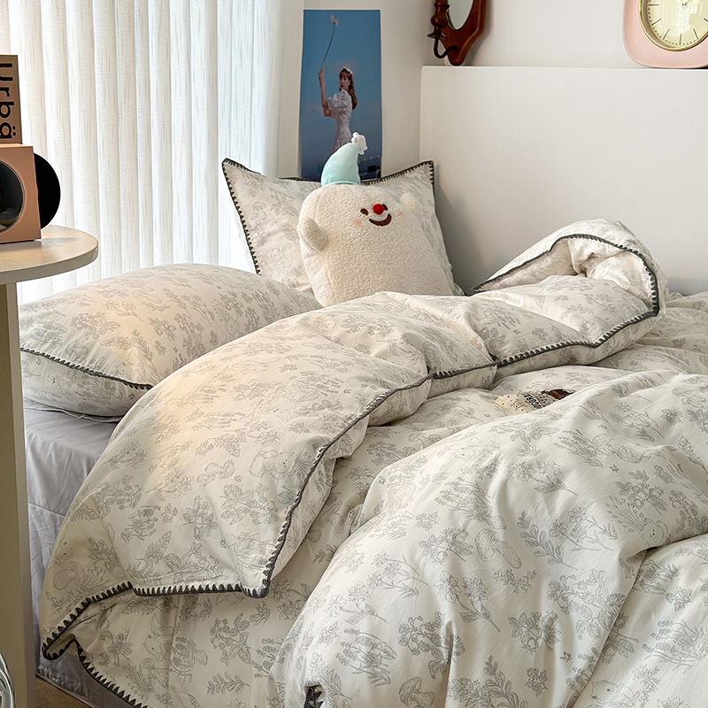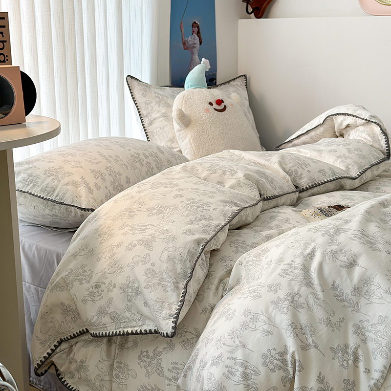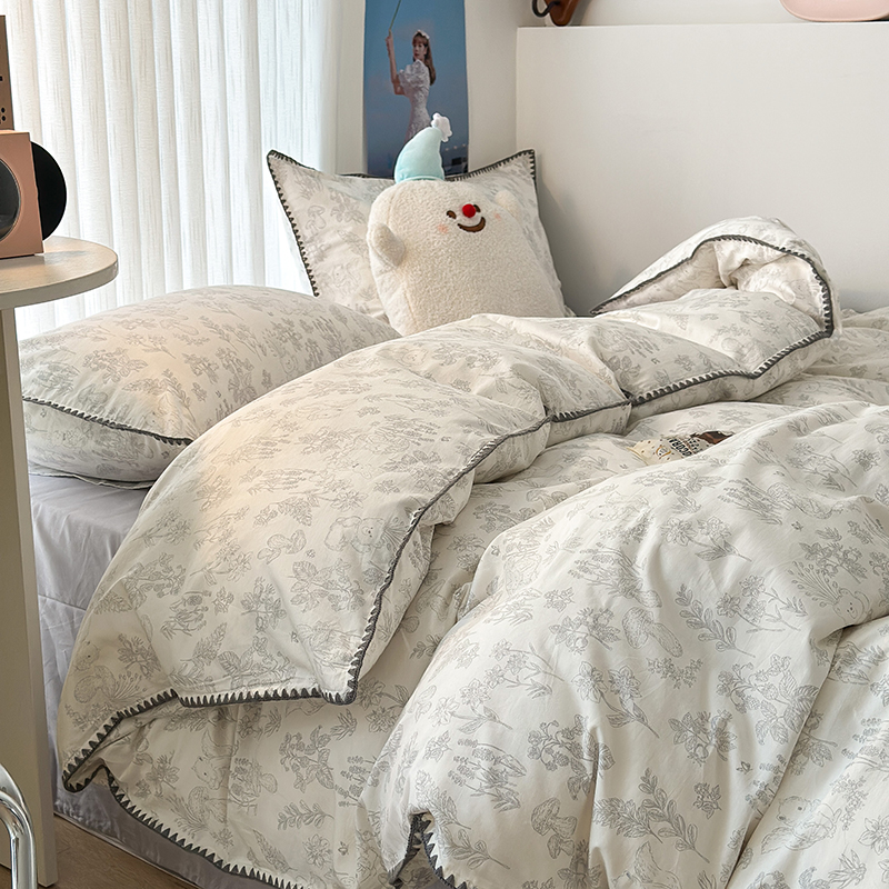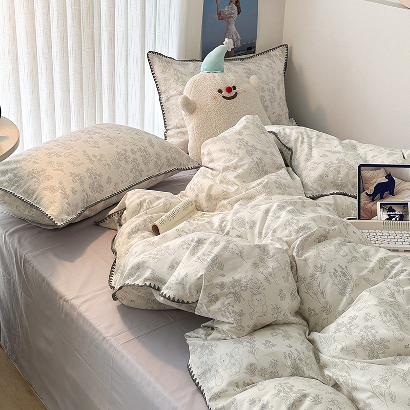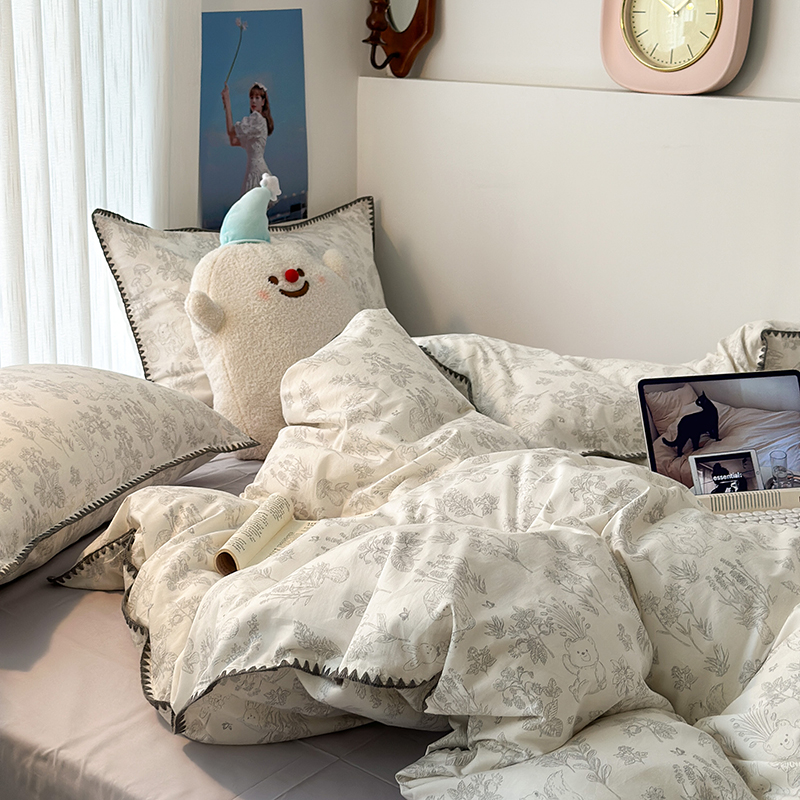 2023新款全棉印花贝壳三角针四件套 素描小卡通灰