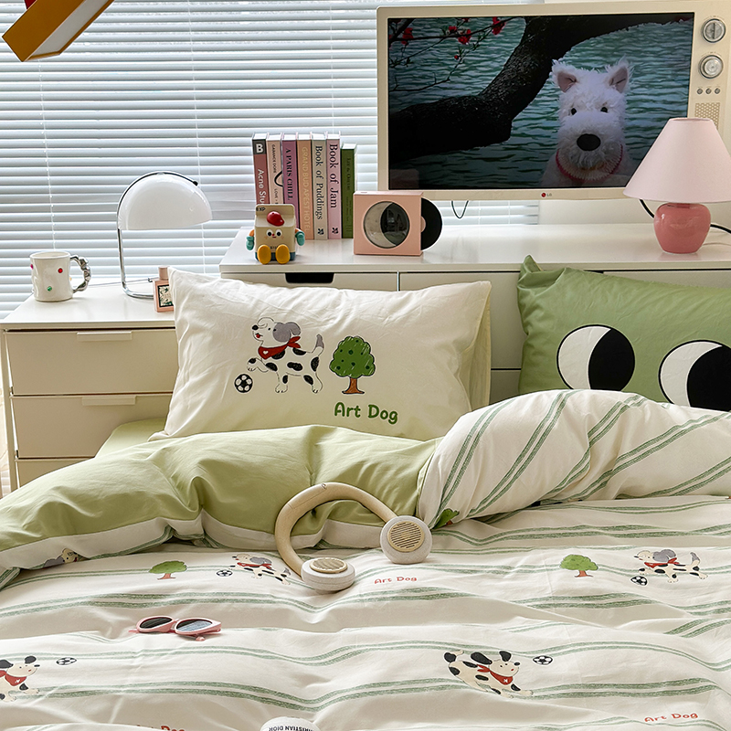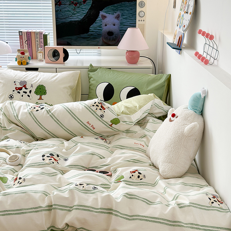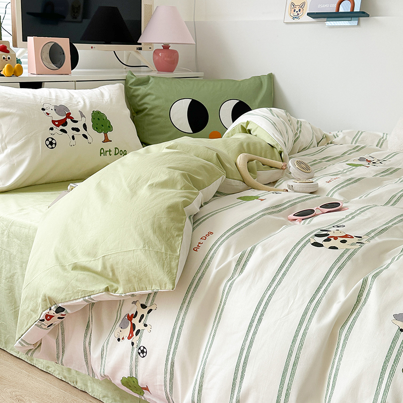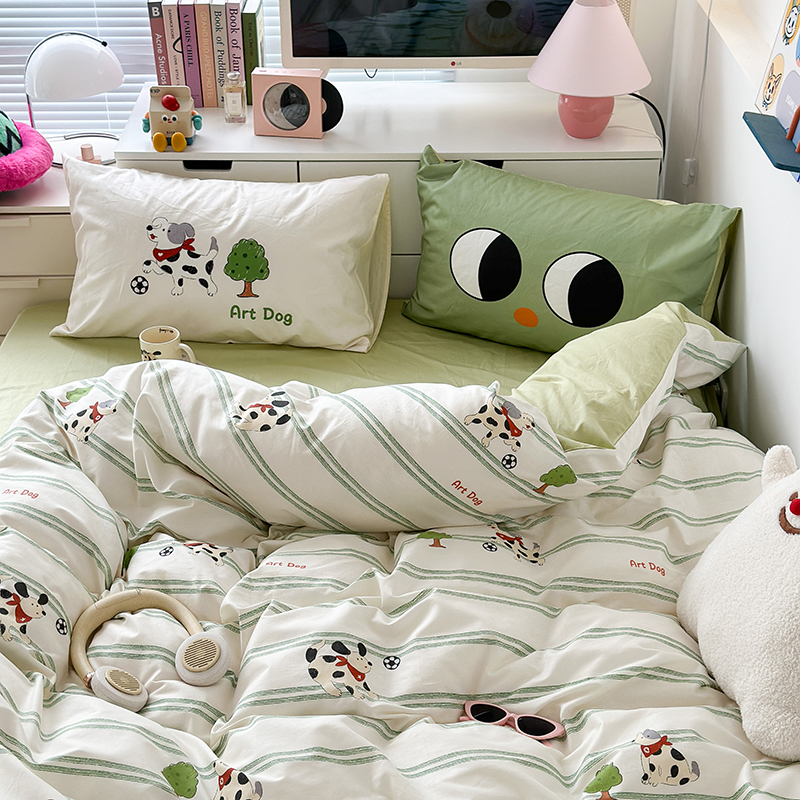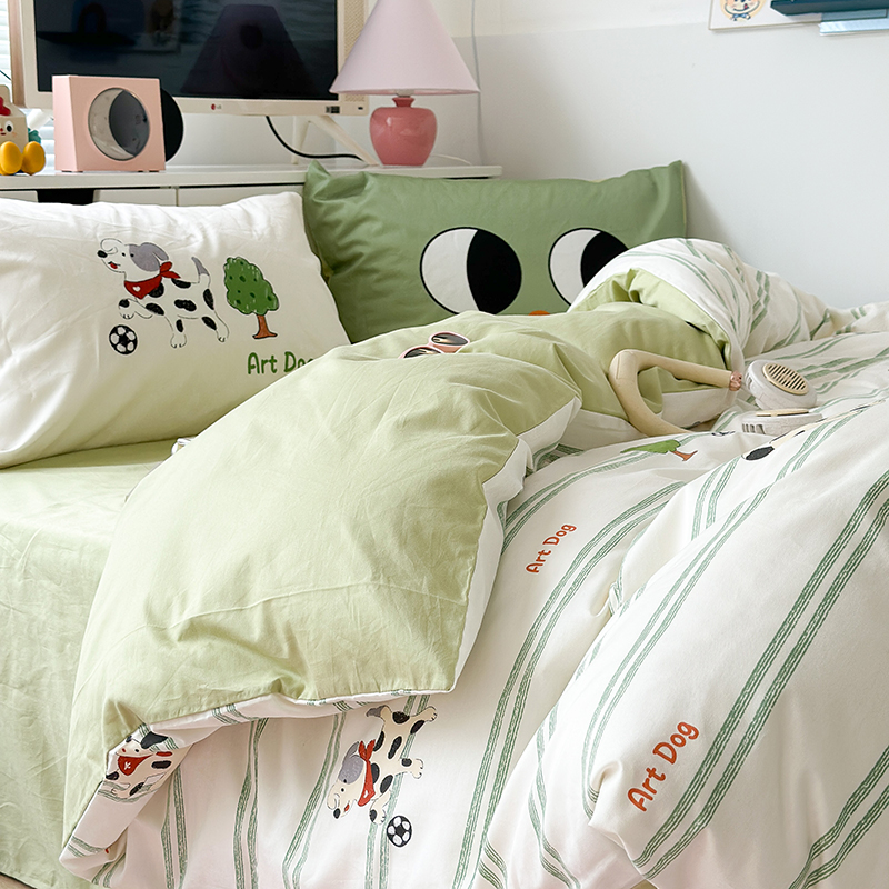 商品名称:昔可家纺 2023新款全棉大版数码枕套四件套 绿条狗狗