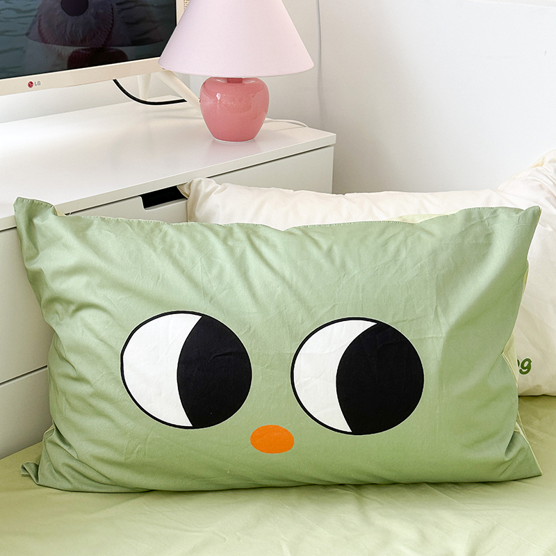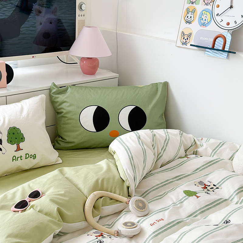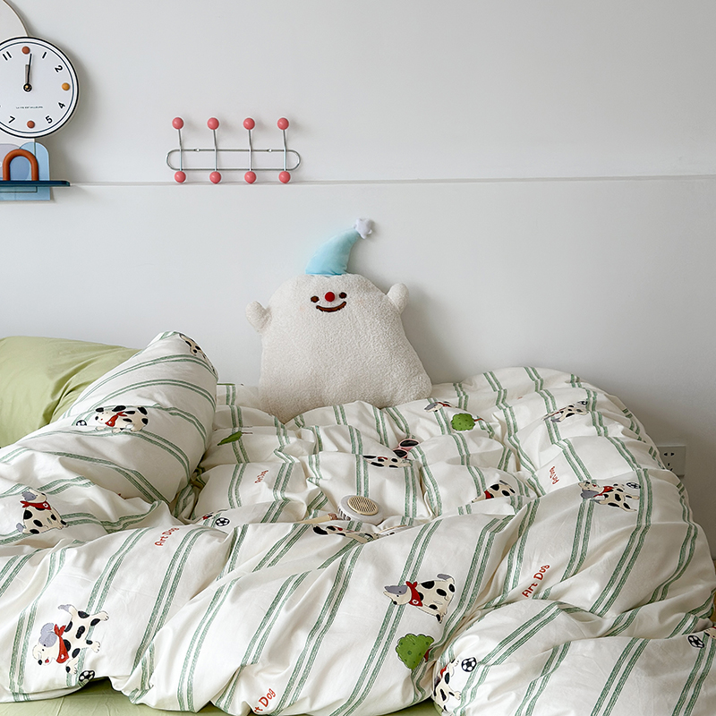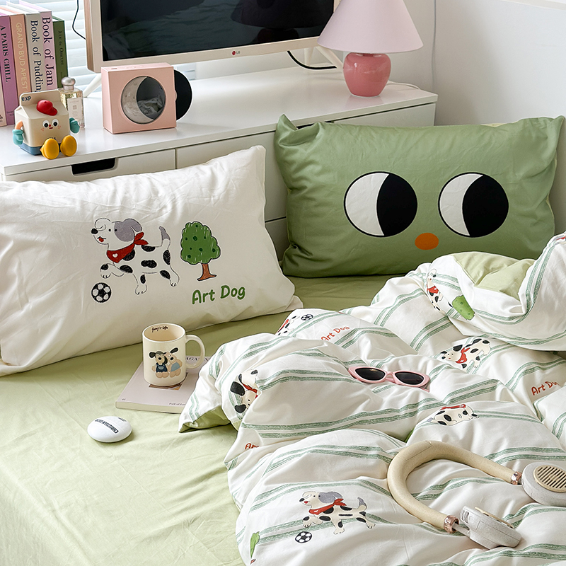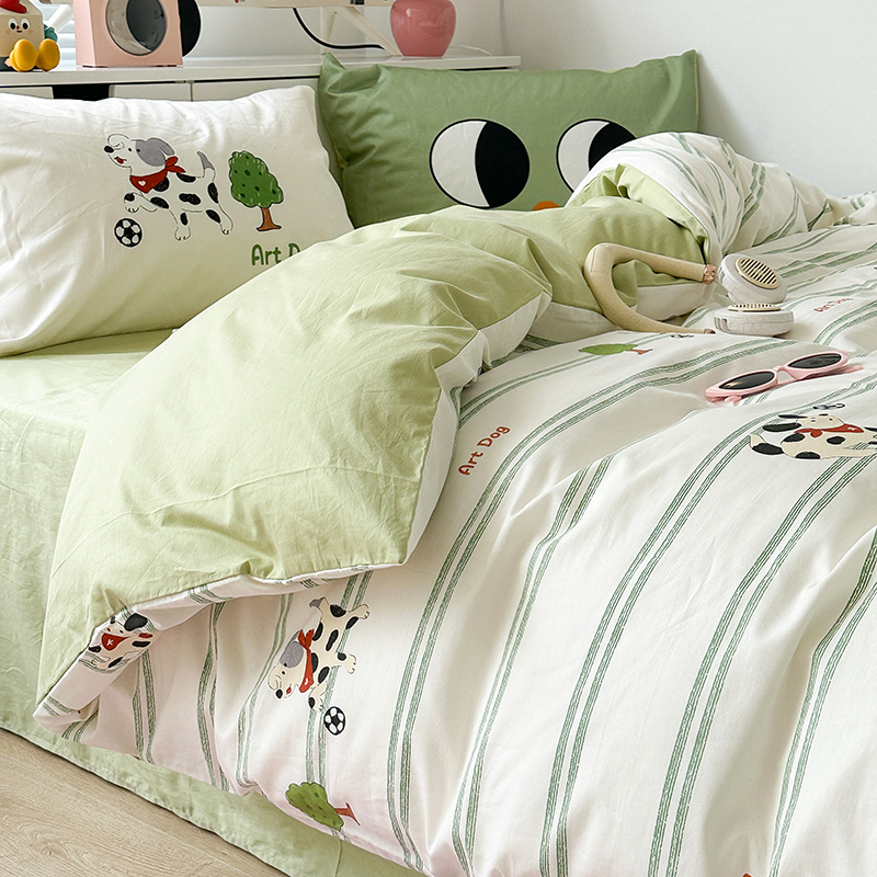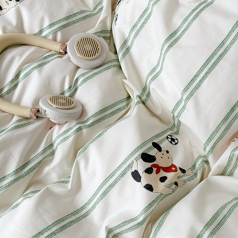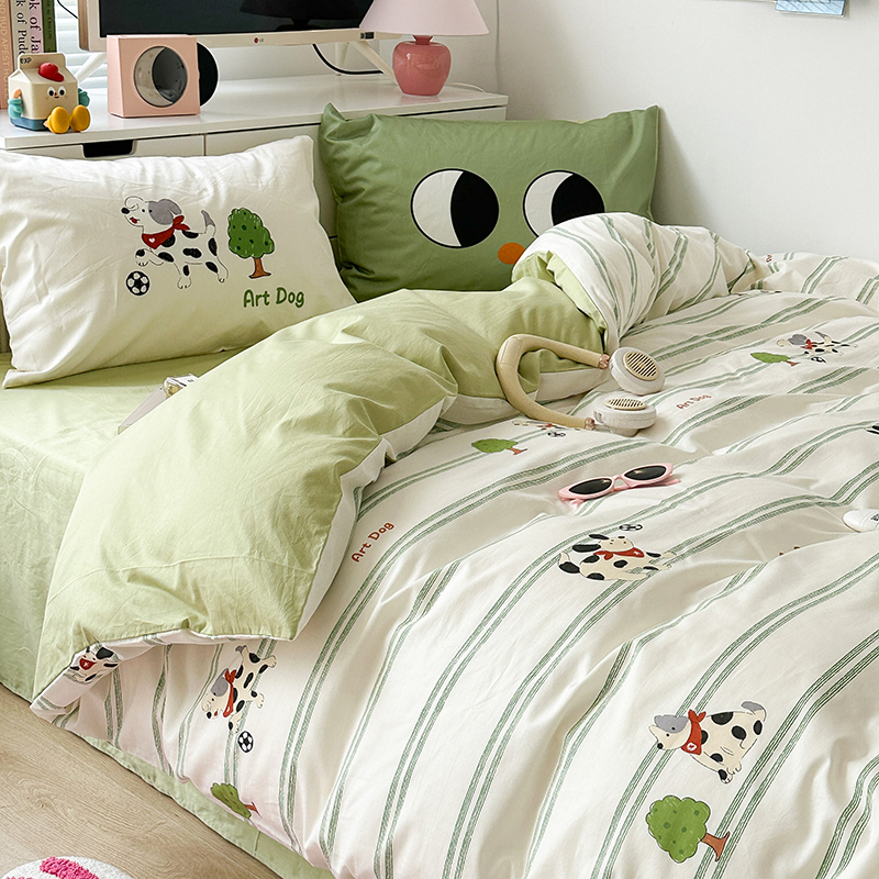 昔可家纺 2023新款全棉大版数码枕套四件套 绿条狗狗