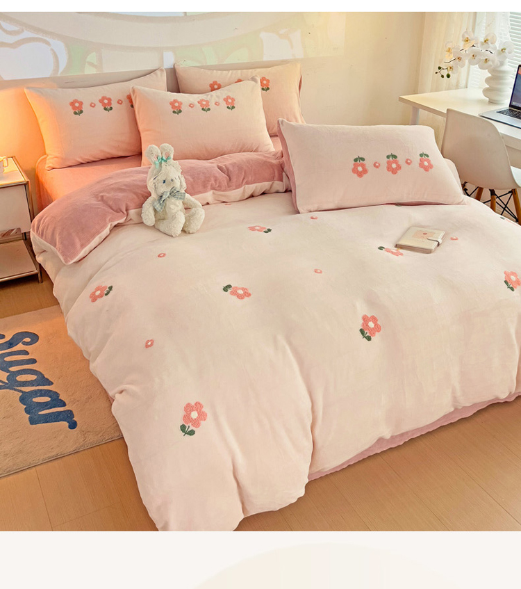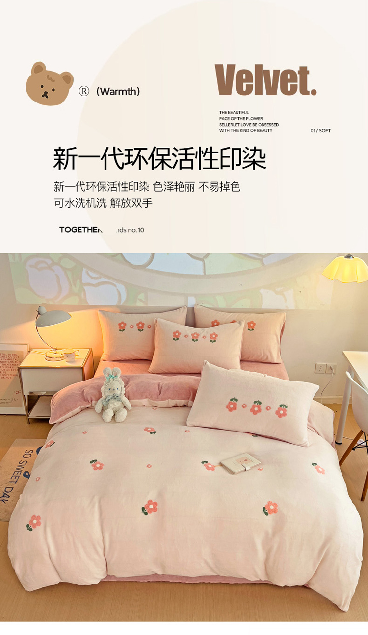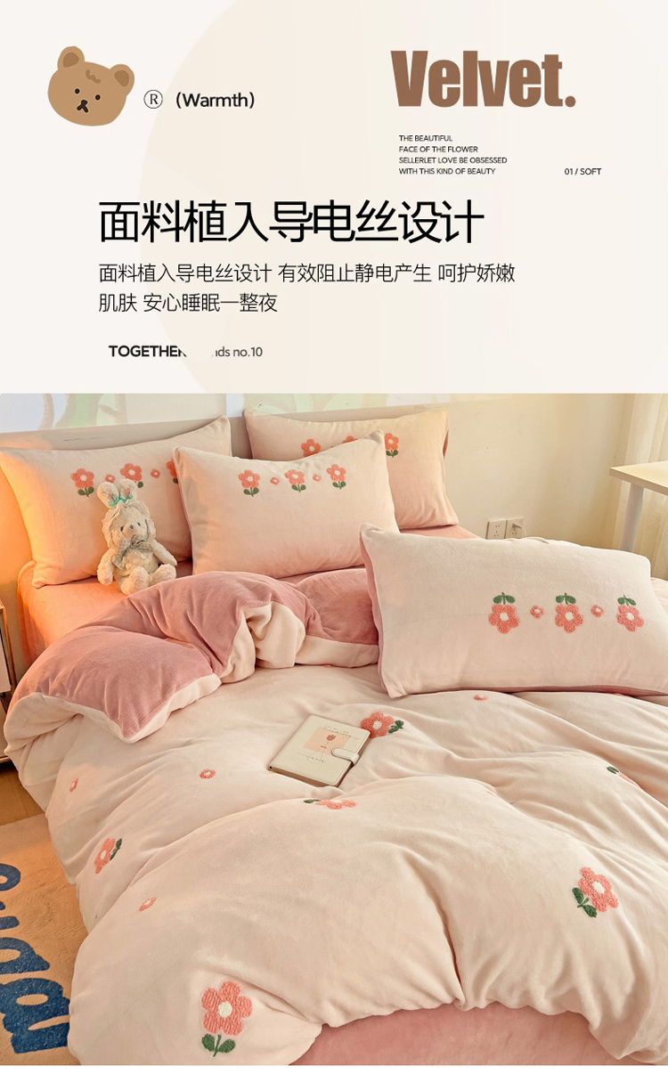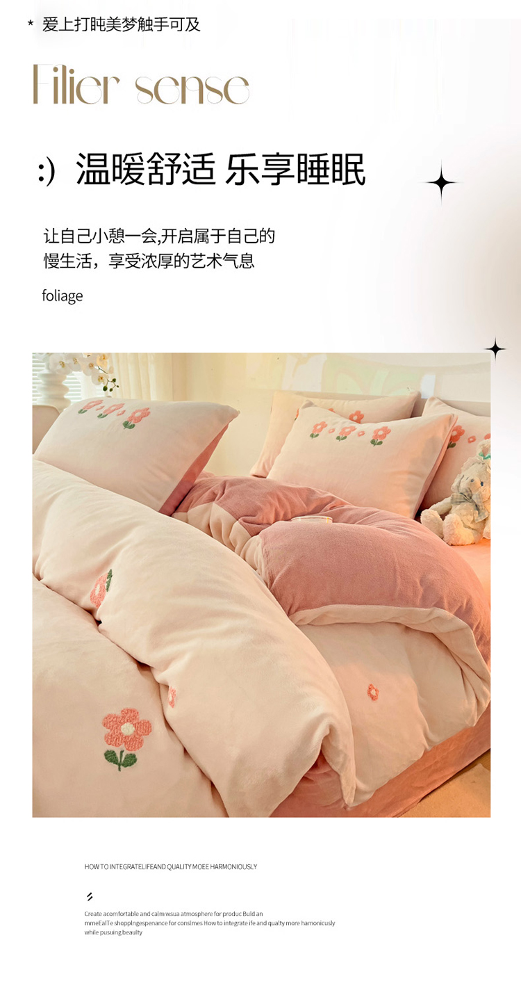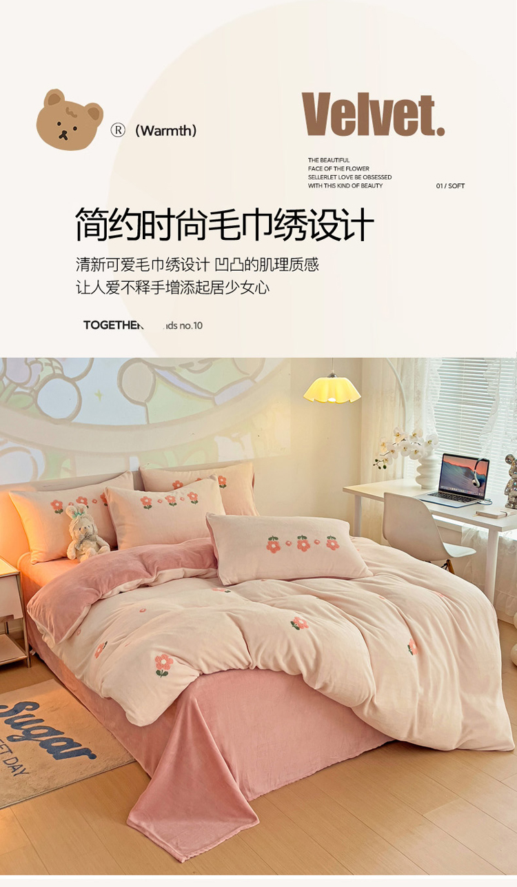 商品名称:寐居家纺 2023新款高克重牛奶绒毛巾绣四件套 朵朵花开-粉白