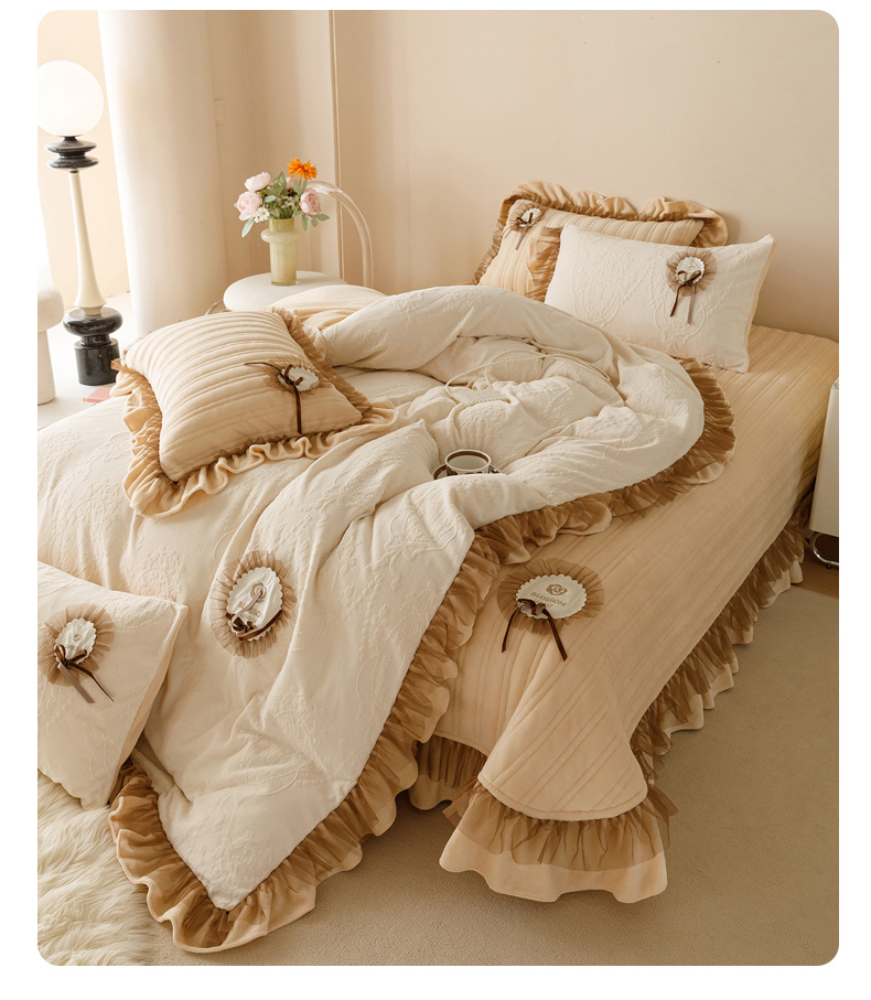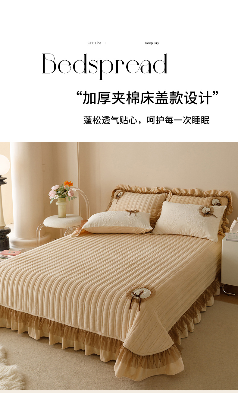 2024高克重牛奶绒纯色蕾丝荷叶边夹棉单床盖单件保暖床盖三件套 千玺米