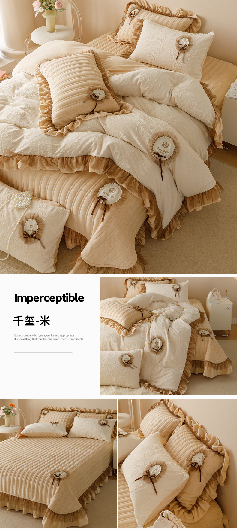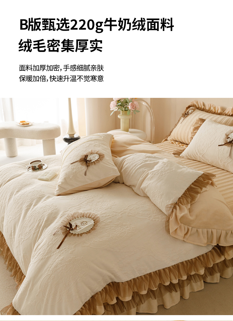 商品名称:2024高克重牛奶绒纯色蕾丝荷叶边夹棉单床盖单件保暖床盖三件套 千玺米