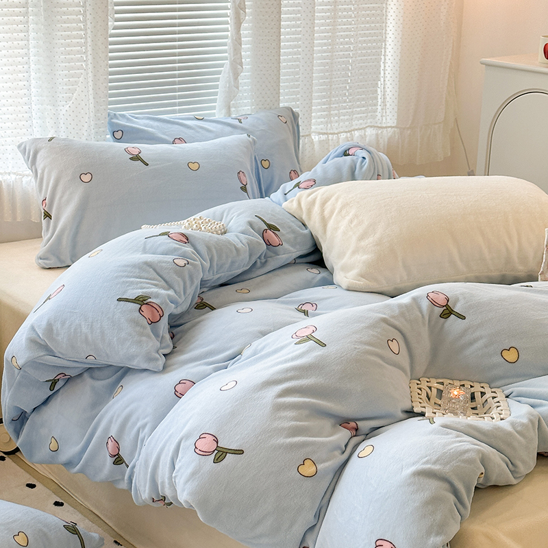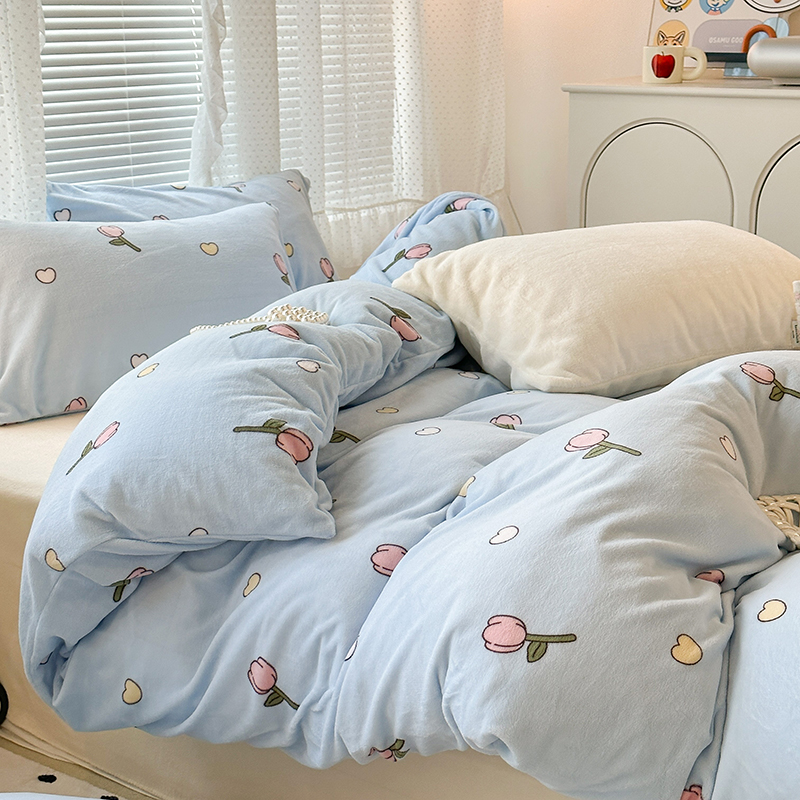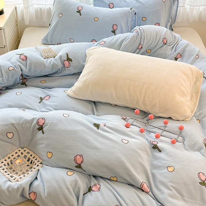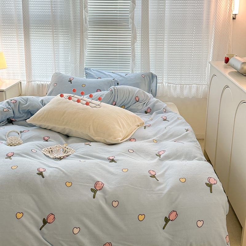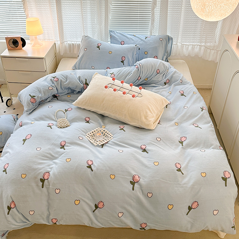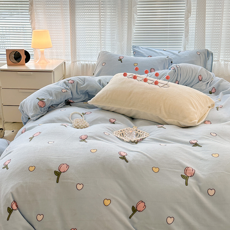 商品名称:昔可家纺 2023新款高克重印花牛奶绒小清新系列四件套 奶蓝爱心郁金香