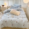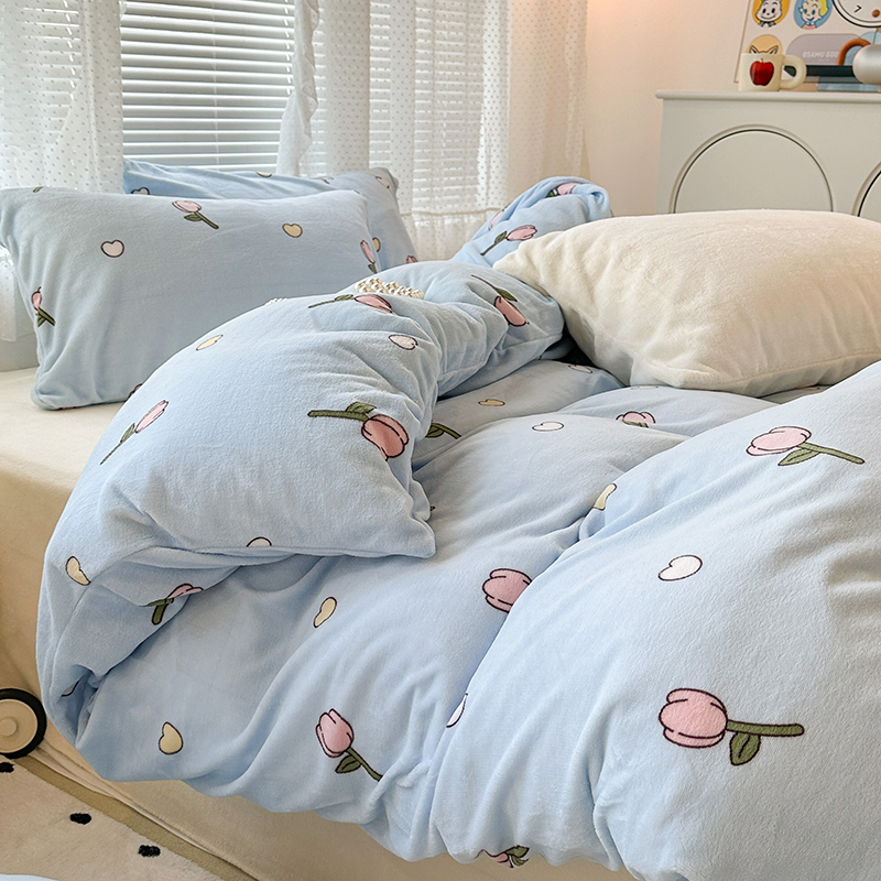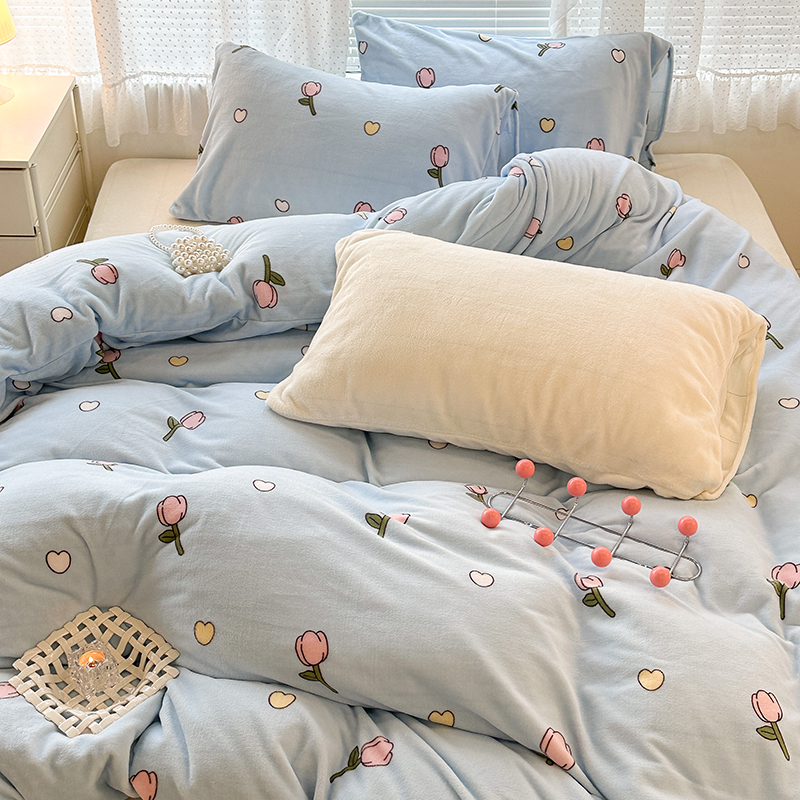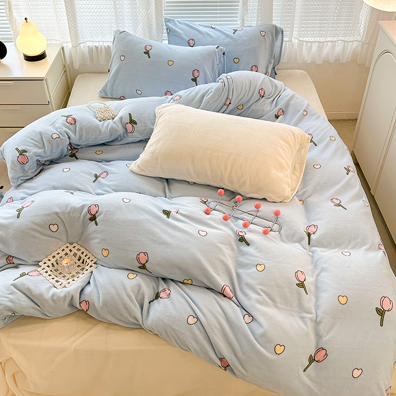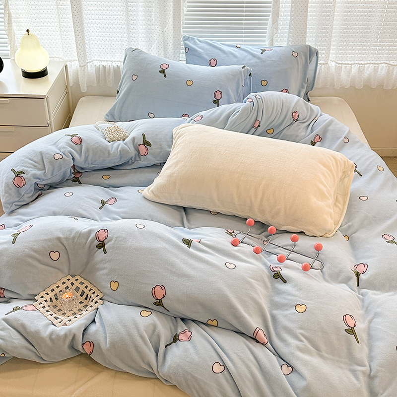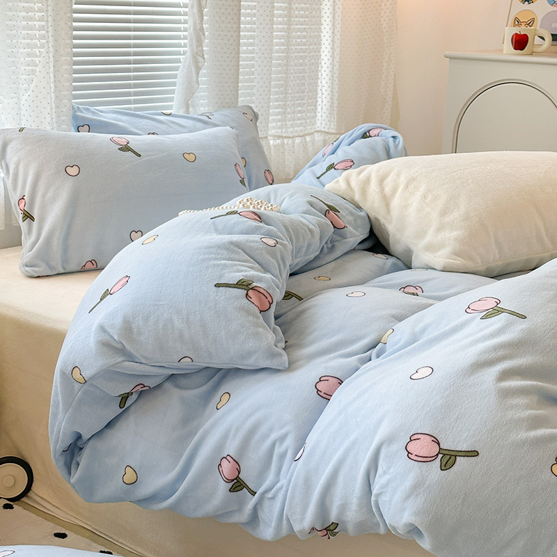 商品名称:昔可家纺 2023新款高克重印花牛奶绒小清新系列四件套 奶蓝爱心郁金香