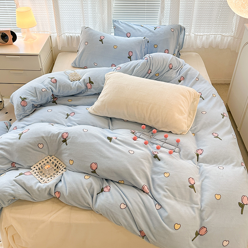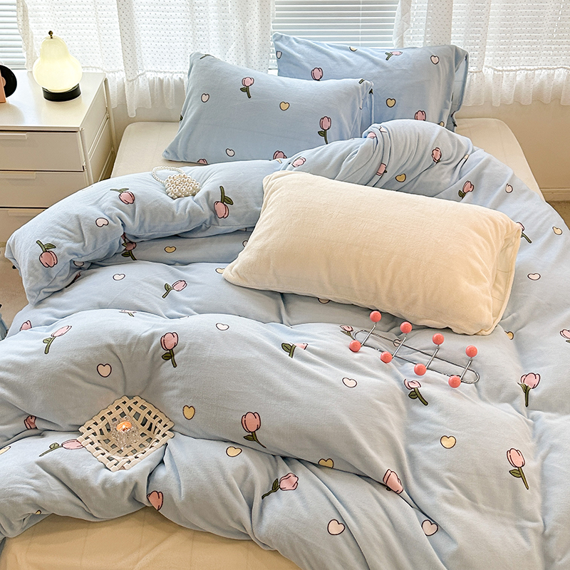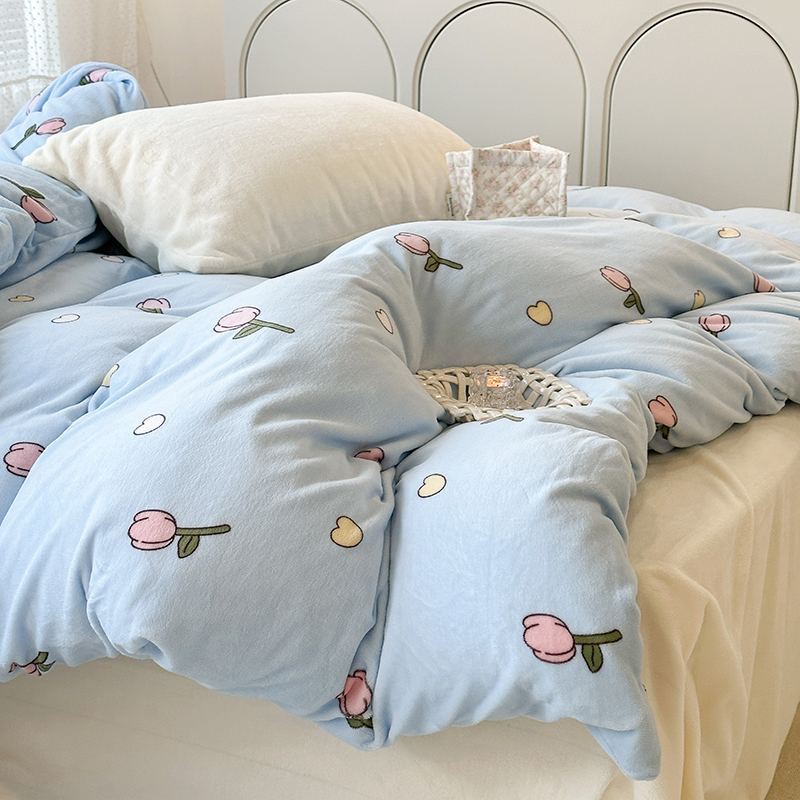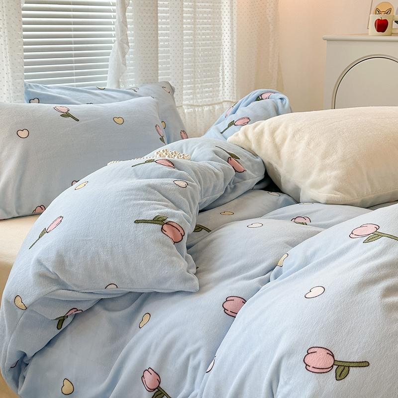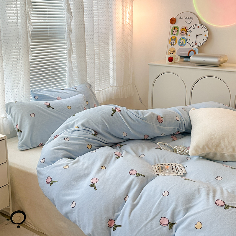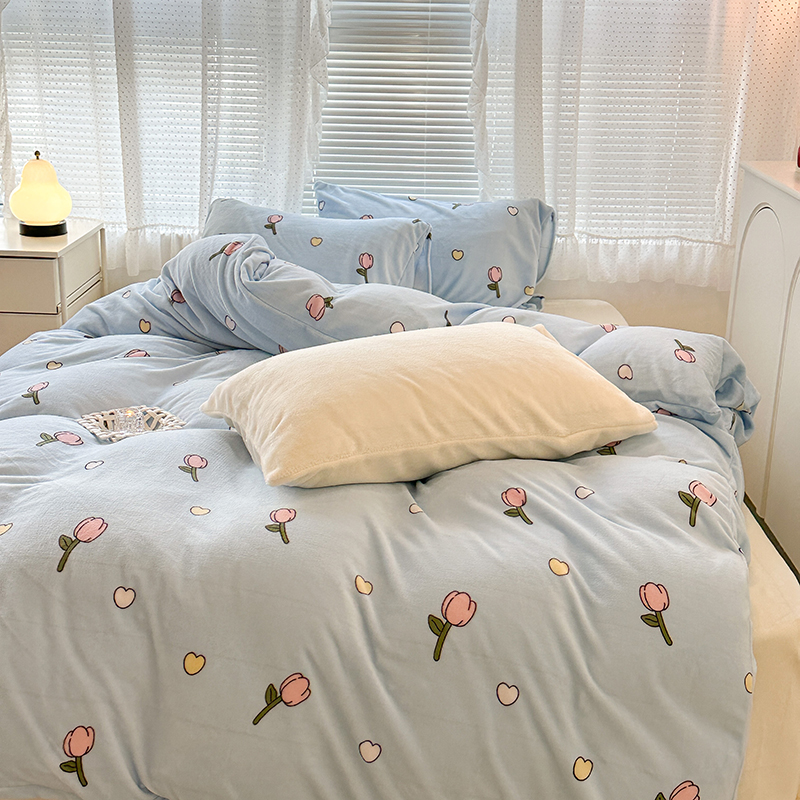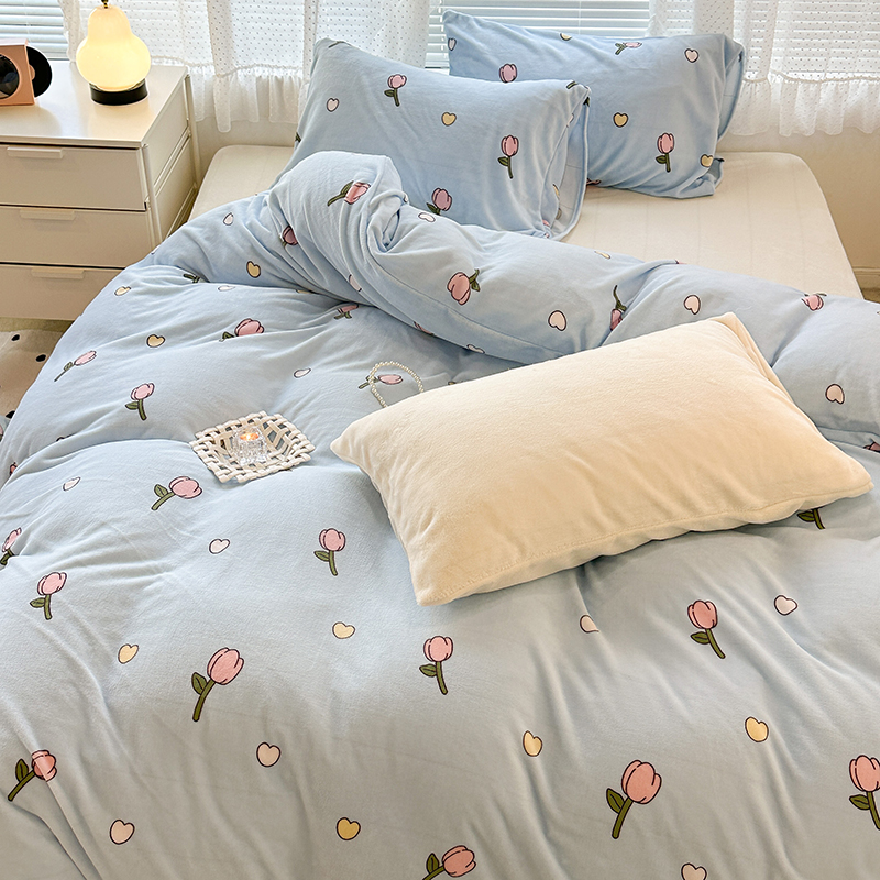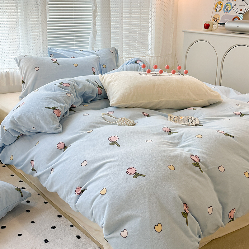 昔可家纺 2023新款高克重印花牛奶绒小清新系列四件套 奶蓝爱心郁金香