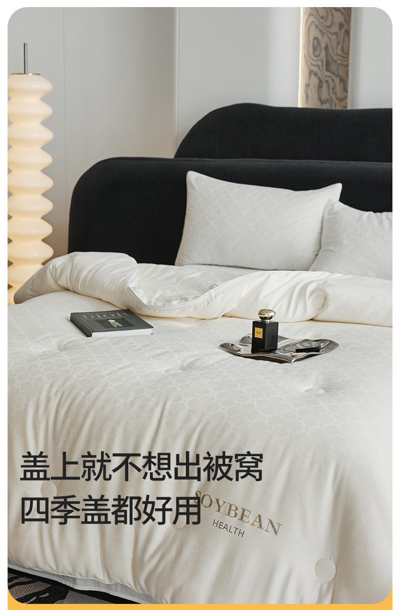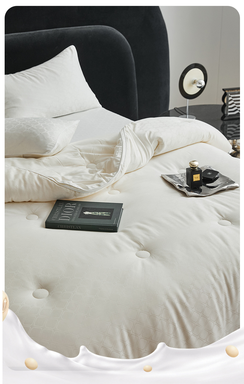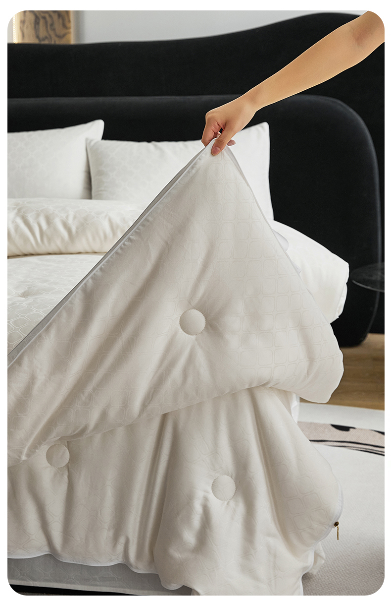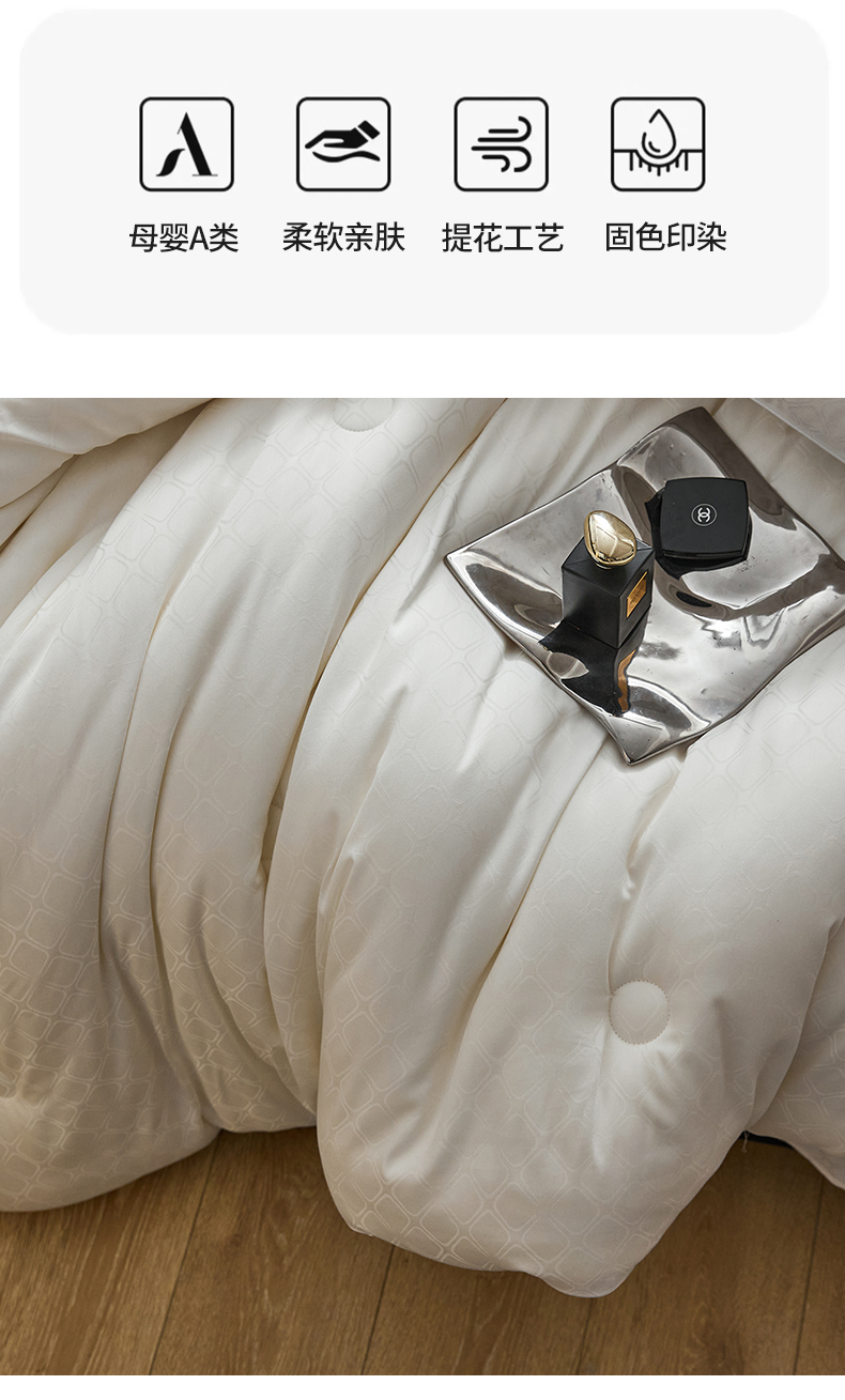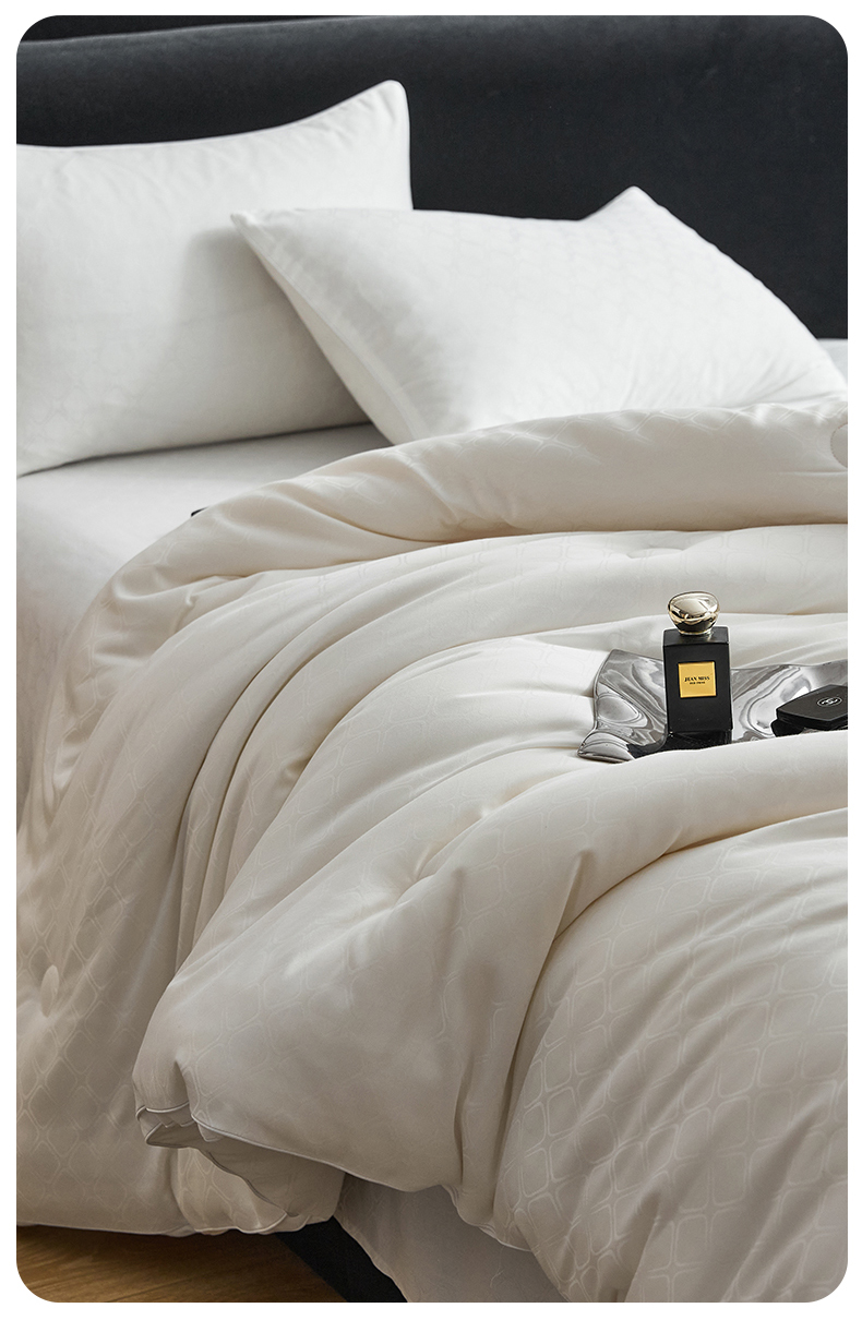 • 91家纺网 家纺一手货源 找家纺 (总)头等舱 2025新款天棉缎大提花55莱赛尔大豆7A抗菌秋冬被(模特图),卡布丽娜,慕斯,配包装