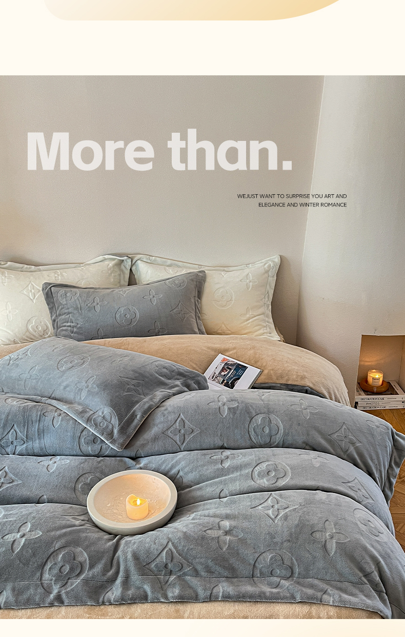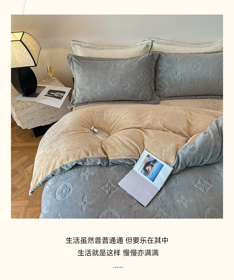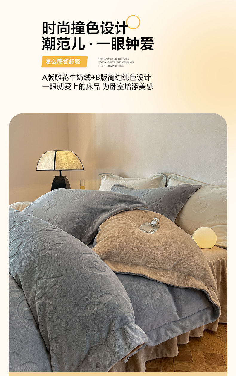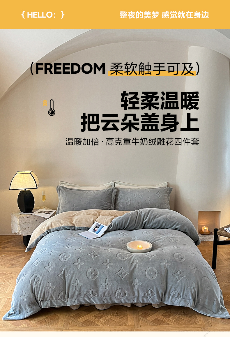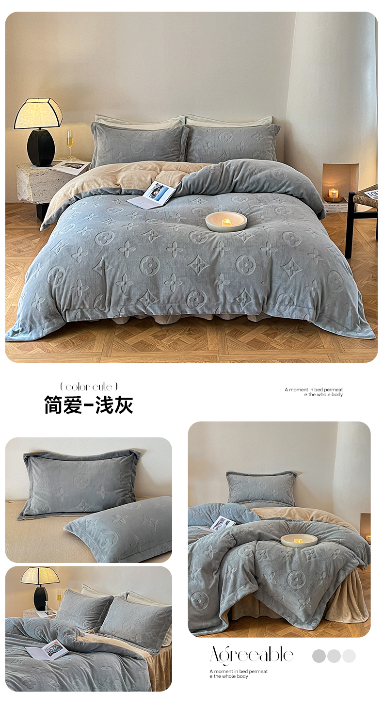 当前位置: 91家纺网 > 商品网购 > 床品套件 > 四件套 > 牛奶绒四件套 > 金麦家纺 2023新款230g高克重牛奶绒雕花四件套 简爱-浅灰