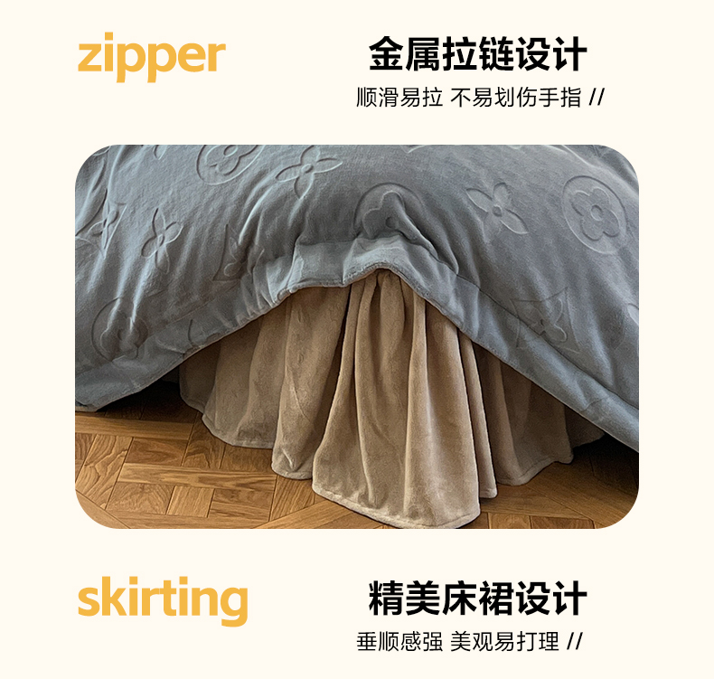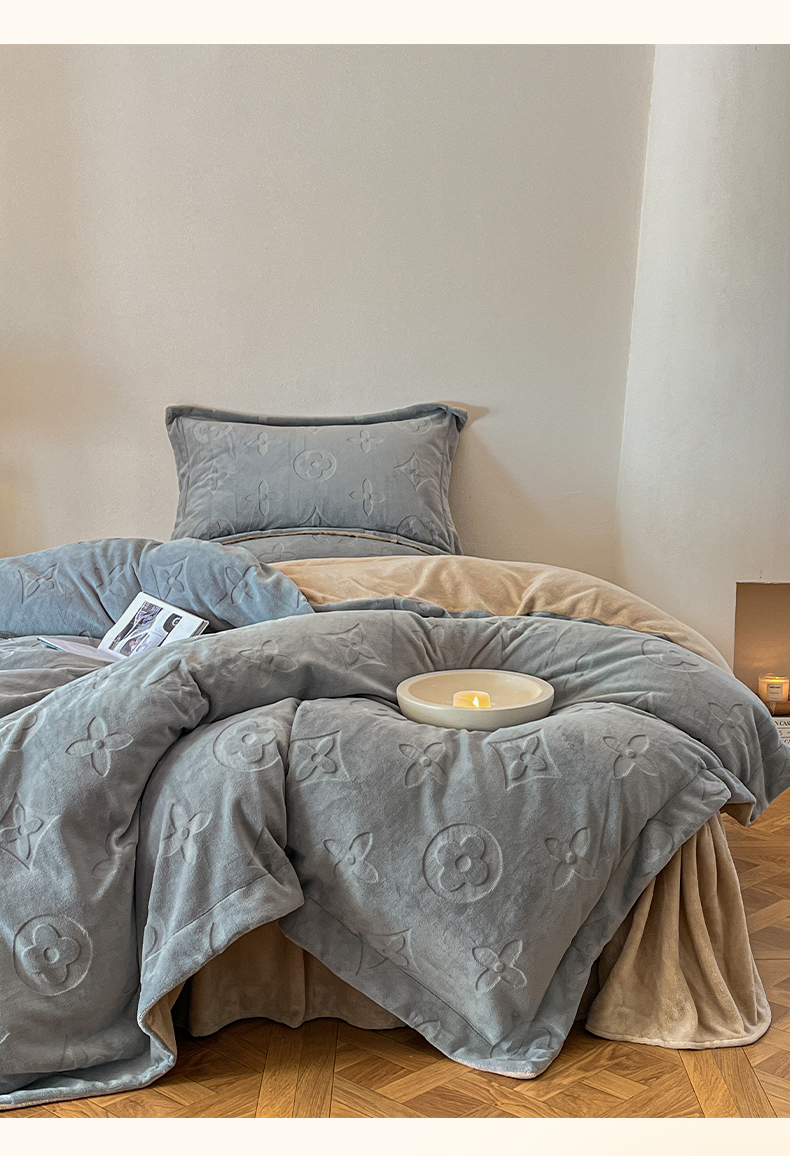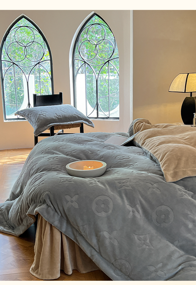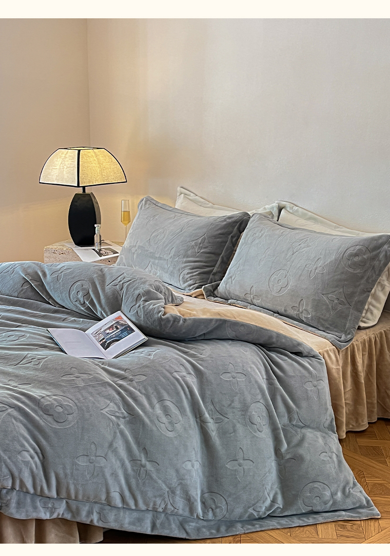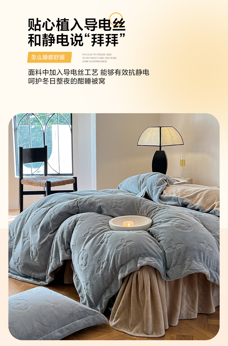 当前位置: 91家纺网 > 商品网购 > 床品套件 > 四件套 > 牛奶绒四件套 > 金麦家纺 2023新款230g高克重牛奶绒雕花四件套 简爱-浅灰