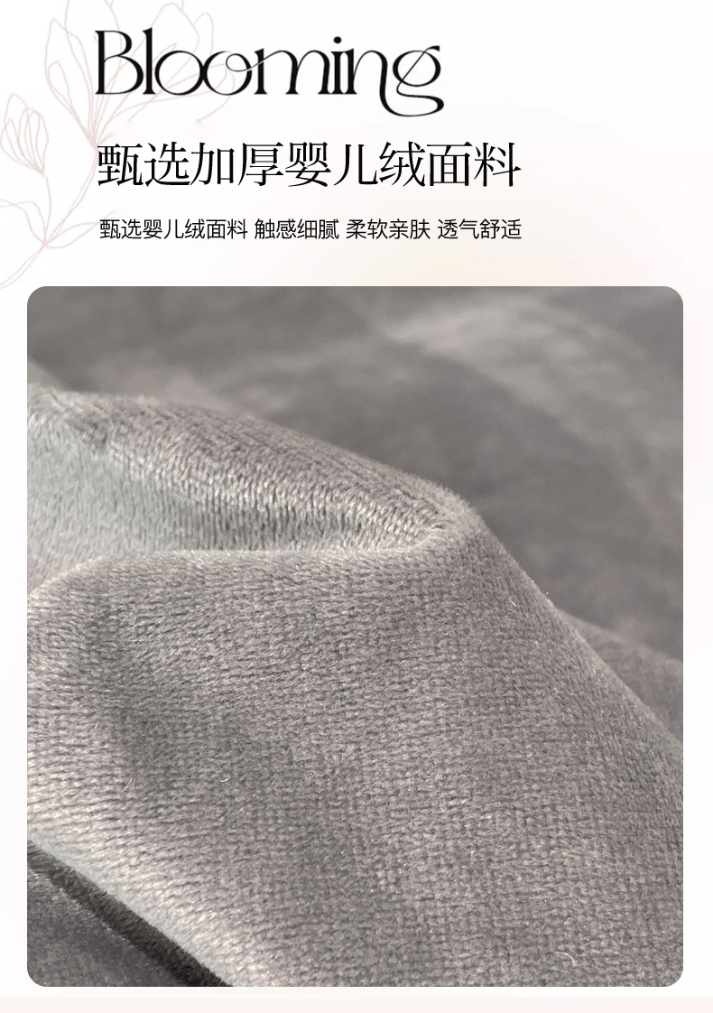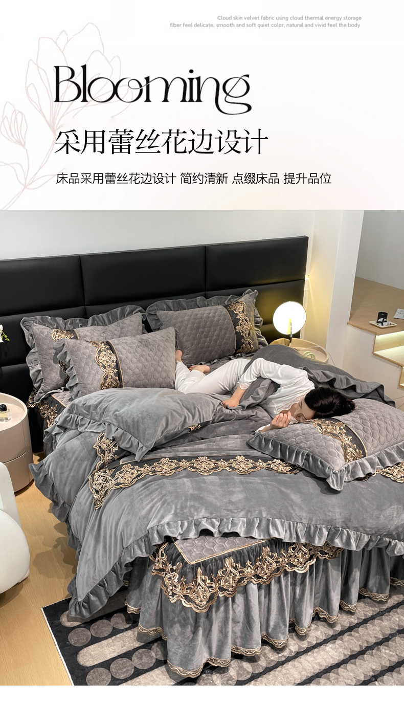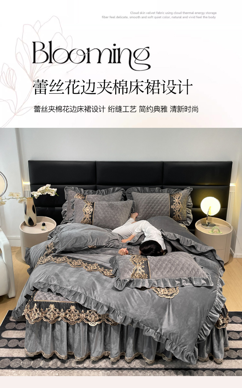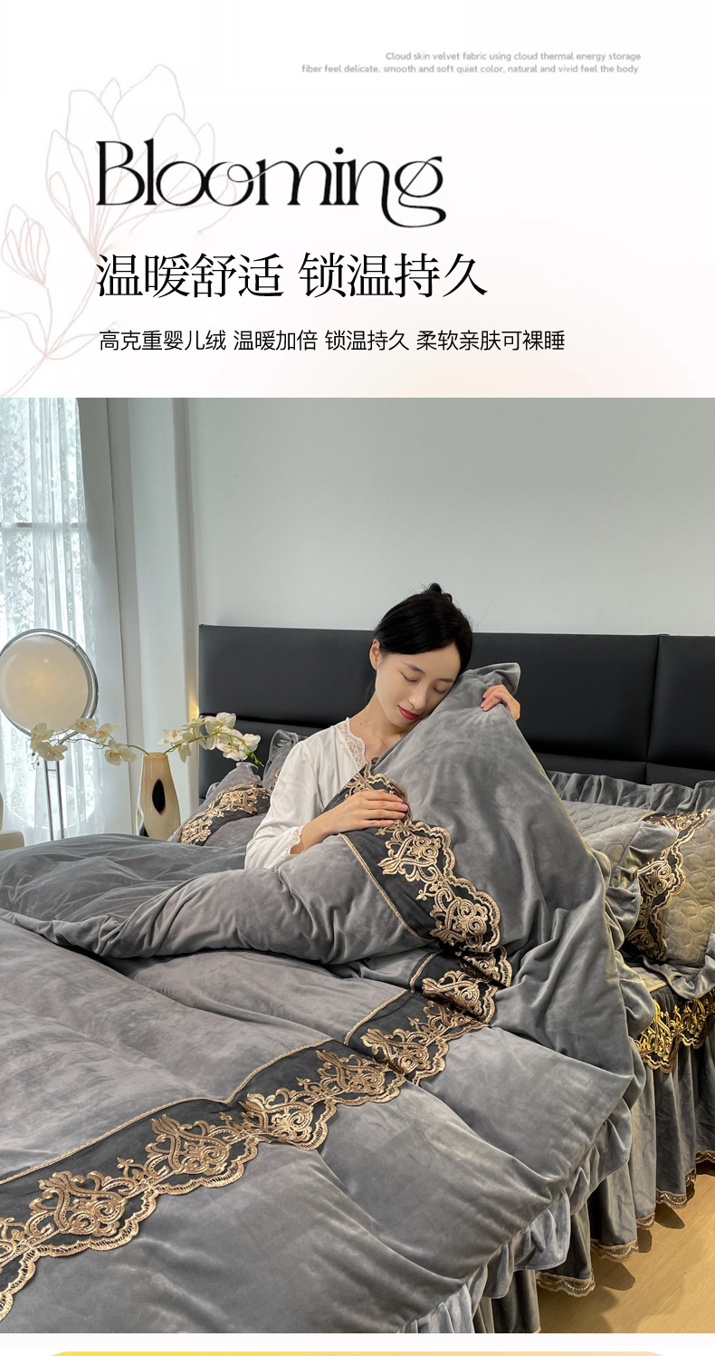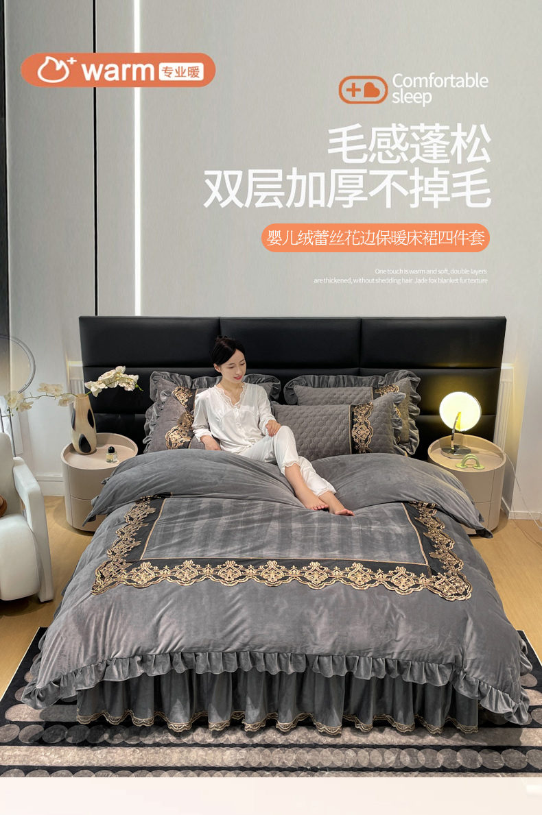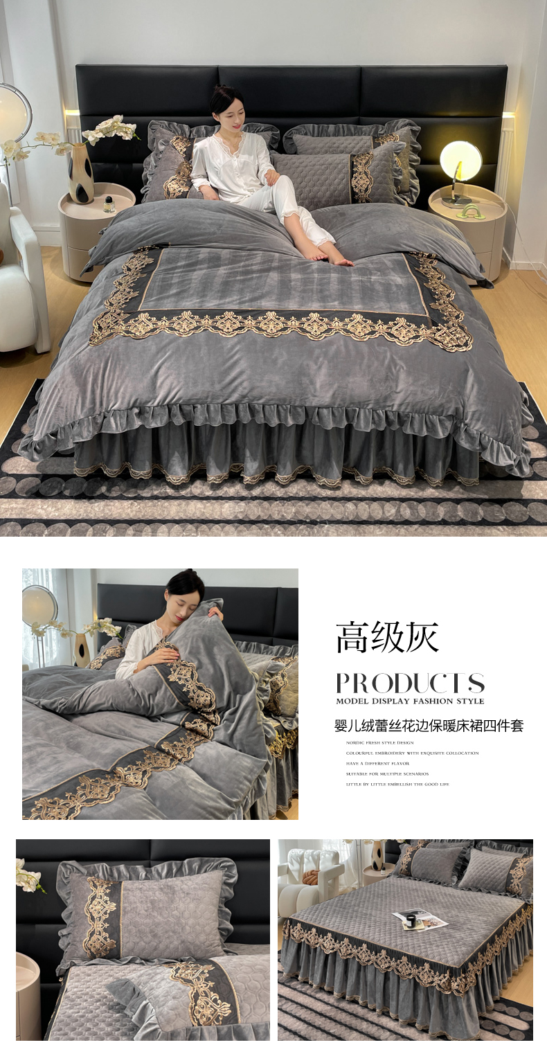 当前位置: 91家纺网 > 商品网购 > 床品套件 > 四件套 > 宝宝绒四件套 > 忘忧草 2023新款婴儿绒夹棉床裙四件套-爱莎 高级灰