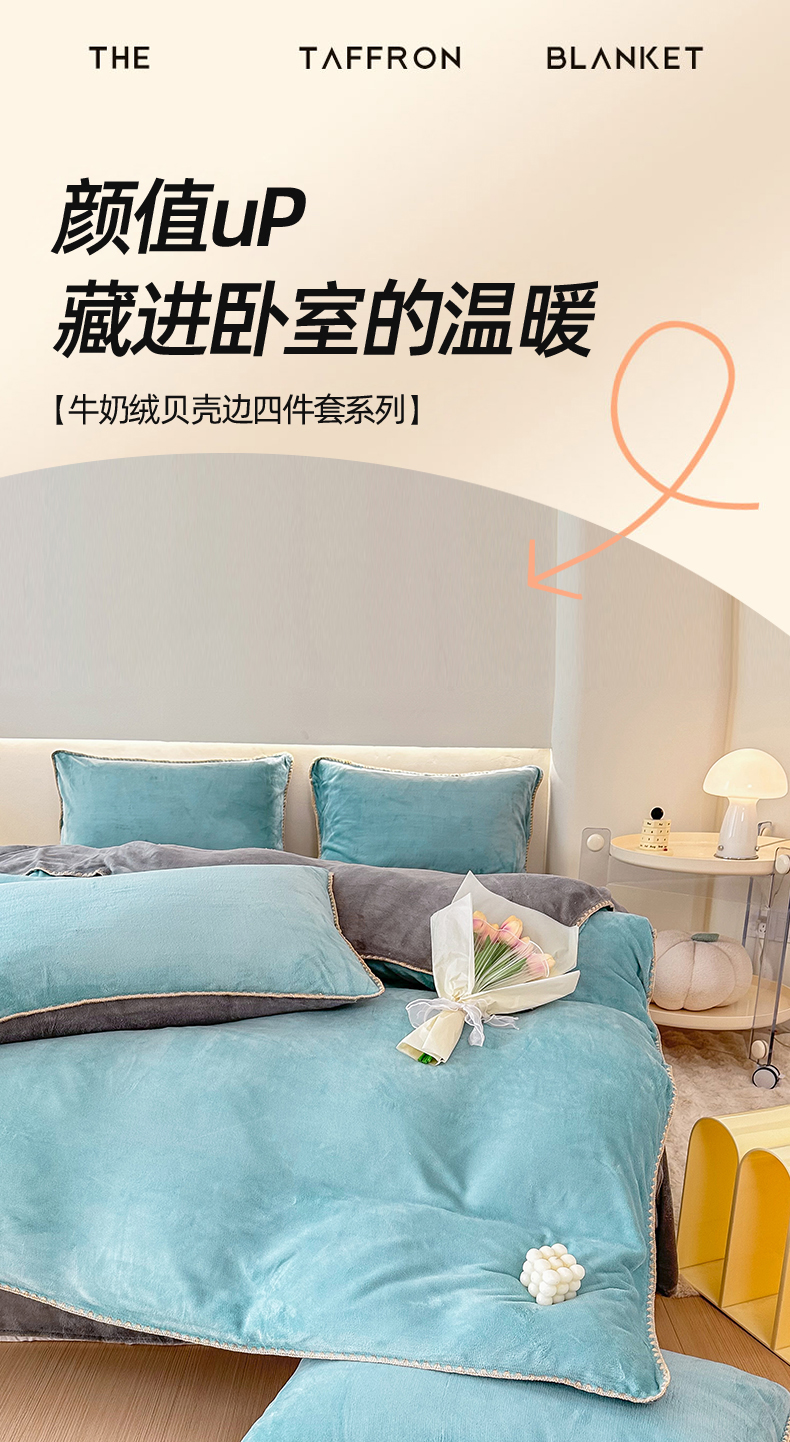 (总)迷仙巢家纺 2023新款贝壳绒四件套,白加卡其,白加天空蓝,粉玉加奶油黄,奶油黄加焦糖,奶油黄加浅紫,奶油黄加天空蓝,浅绿灰,浅紫加粉玉,天空蓝加粉玉,天空蓝加奶油黄