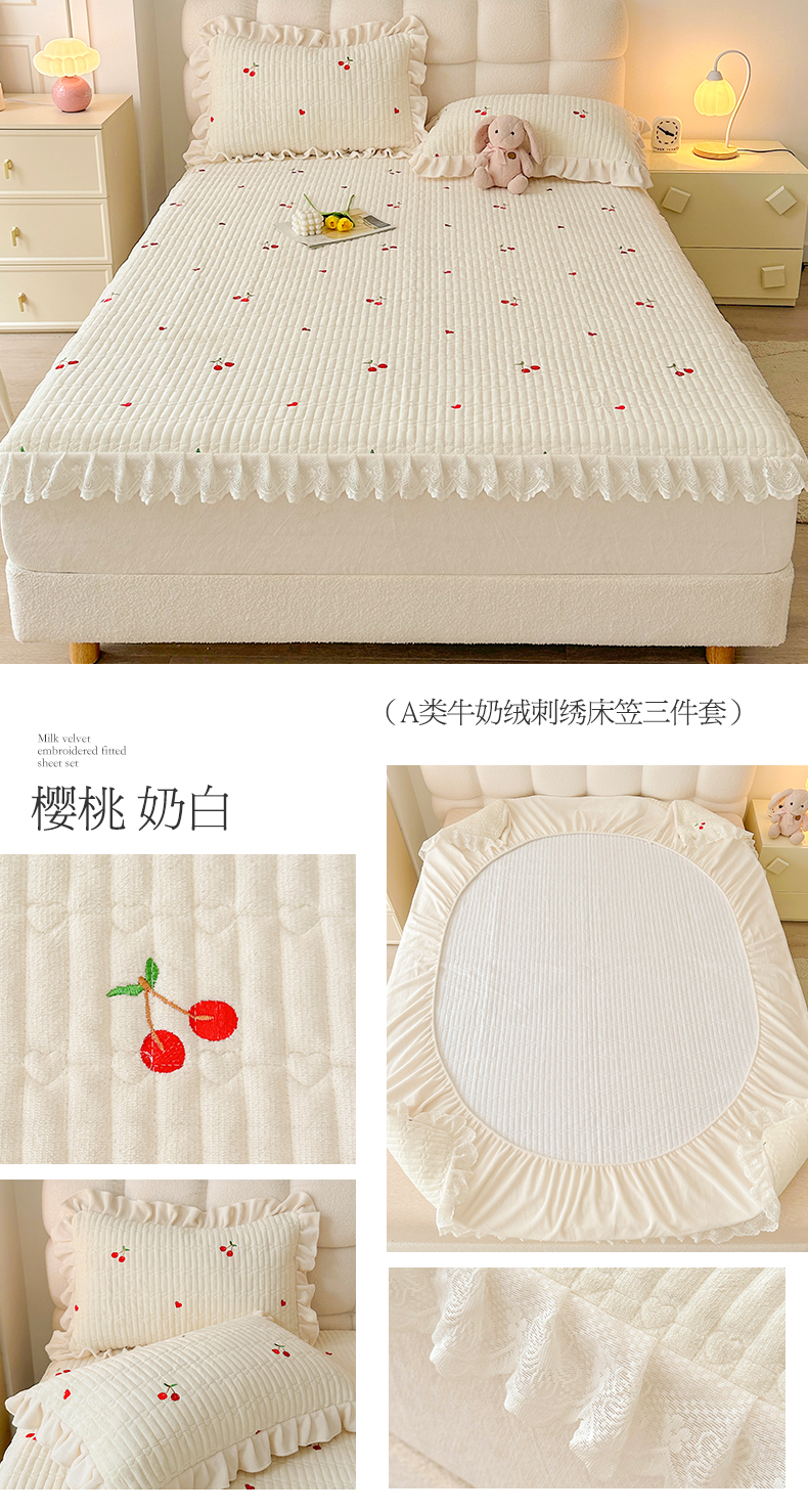 宜凡 2023新款牛奶绒夹棉绗缝绣花床笠三件套 樱桃-奶白