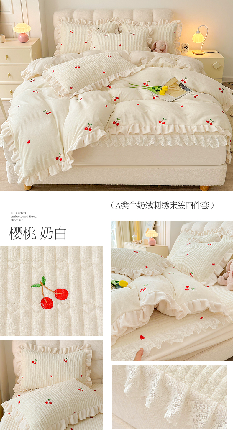 商品名称:宜凡 2023新款牛奶绒夹棉绗缝绣花床笠四件套 樱桃-奶白